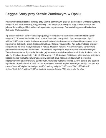 Radio Opole: http://radio.opole.pl/101,92748,reggae-story-przy-stawie-zamkowym-w-opolu Reggae Story przy Stawie Zamkowym w Opolu Muzeum Polskiej Piosenki otworzy przy Stawie Zamkowym (przy ul. Barlickiego) w Opolu wystawę fotograficzną zatytułowaną „Reggae Story”. Na ekspozycję złożą się zdjęcia wykonane przez Jakuba Szczuckiego i Piotra Owczarka podczas tegorocznego Festiwalu Reggae na Piaskach w Ostrowie Wielkopolskim. <p class="Normal" style="text-align: justify;"><img alt="Bakshish w Studiu M Radia Opole" height="173" src="file,54114.html" style="float: left; margin-left: 0px; margin-right: 5px;" width="260" />Na scenie festiwalu wystąpili najważniejsi reprezentanci polskiego reggae, m.in. kluczborski Bakshish, Izrael, Gedeon Jerubbaal, Rokosz, Vavamuffin, Ras Luta. Podczas imprezy świętowano 30-lecie muzyki reggae w Polsce. Muzeum Polskiej Piosenki w Opolu sprawowało patronat honorowy nad festiwalem i ufundowało nagrodę dla zwycięzcy w Konkursie Młodych Talentów im. Ryszarda Sarbaka. Jej laureatem został zespół Roots Rockets. <br /> <br /> W sobotę i niedzielę (14 i 15.09) w godz. 12:30 – 18:00 przy planszach ze zdjęciami będzie można wysłuchać utworów polskich grup reggae emitowanych z systemu nagłośnieniowego przy Stawku Zamkowym. Otwarcie wystawy o godz. 13:00, będzie ona czynna będzie do 14 października 2013 r.</p> <p class="Normal" style="text-align: justify;"> </p> <p class="Normal" style="text-align: justify;"><img height="100" src="file,118326.html" style="float: left;" width="100" />Mariusz Majeran (oprac. WK)<br /><br /></p>