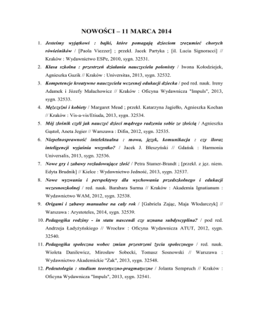 NOWOŚCI – 11 MARCA 2014 1. Jesteśmy wyjątkowi : bajki, które pomagają dzieciom zrozumieć chorych rówieśników / [Paola Viezzer] ; przekł. Jacek Partyka ; [il. Lucia Signoracci] // Kraków : Wydawnictwo ESPe, 2010, sygn. 32531. 2. Klasa szkolna : przestrzeń działania nauczyciela polonisty / Iwona Kołodziejek, Agnieszka Guzik // Kraków : Universitas, 2013, sygn. 32532. 3. Kompetencje kreatywne nauczyciela wczesnej edukacji dziecka / pod red. nauk. Ireny Adamek i Józefy Małachowicz // Kraków : Oficyna Wydawnicza "Impuls", 2013, sygn. 32533. 4. Mężczyźni i kobiety / Margaret Mead ; przekł. Katarzyna Jagiełło, Agnieszka Kochan // Kraków : Vis-a-vis/Etiuda, 2013, sygn. 32534. 5. Mój złośnik czyli jak nauczyć dzieci mądrego radzenia sobie ze złością / Agnieszka Gąstoł, Aneta Jegier // Warszawa : Difin, 2012, sygn. 32535. 6. Niepełnosprawność intelektualna : mowa, język, komunikacja : czy iloraz inteligencji wyjaśnia wszystko? / Jacek J. Błeszyński // Gdańsk : Harmonia Universalis, 2013, sygn. 32536. 7. Nowe gry i zabawy rozładowujące złość / Petra Stamer-Brandt ; [przekł. z jęz. niem. Edyta Brudnik] // Kielce : Wydawnictwo Jedność, 2013, sygn. 32537. 8. Nowe wyzwania i perspektywy dla wychowania przedszkolnego i edukacji wczesnoszkolnej / red. nauk. Barabara Surma // Kraków : Akademia Ignatianum : Wydawnictwo WAM, 2012, sygn. 32538. 9. Origami i zabawy manualne na cały rok / [Gabriela Zając, Maja Włodarczyk] // Warszawa : Arystoteles, 2014, sygn. 32539. 10. Pedagogika rodziny - in statu nascendi czy uznana subdyscyplina? / pod red. Andrzeja Ładyżyńskiego // Wrocław : Oficyna Wydawnicza ATUT, 2012, sygn. 32540. 11. Pedagogika społeczna wobec zmian przestrzeni życia społecznego / red. nauk. Wioleta Danilewicz, Mirosław Sobecki, Tomasz Sosnowski // Warszawa : Wydawnictwo Akademickie "Żak", 2013, sygn. 32548. 12. Pedeutologia : studium teoretyczno-pragmatyczne / Jolanta Sempruch // Kraków : Oficyna Wydawnicza "Impuls", 2013, sygn. 32541. 13. Poprzez zabawę poznajemy prawdy wiary : nowe pomysły dla animatorów i katechetów / Alda Maria Lusuardi ; [przeł. Dariusz Chodyniecki] // Kielce : Wydawnictwo Jedność, 2013, sygn. 32542. 14. Praca z uczniem o specjalnych potrzebach edukacyjnych. T. 2 / pod red. nauk. Anny Guzy i Bernadety Niesporek-Szamburskiej // Kielce : Wydawnictwo Pedagogiczne ZNP, cop. 2013, sygn. 32543. 15. Rodzina polska : nowe wyzwania : wybrane aspekty / red. Bogdan Więckiewicz // Stalowa Wola : Wydział Zamiejscowy Nauk o Społeczeństwie Katolickiego Uniwersytetu Lubelskiego Jana Pawła II, 2013, sygn. 32544. 16. Rozwijanie podstawowych form wypowiedzi ustnych i pisemnych ucznia szkoły podstawowej / Alicja Tanajewska, Iwona Kiełpińska, Dorota Kołodziejska // Gdańsk : Wydawnictwo Harmonia, 2014, sygn. 32545. 17. Skuteczna praca wychowawcza nauczyciela z uczniem / Aneta Paszkiewicz // Warszawa : Difin, 2014, sygn. 32546. 18. Specjalne potrzeby edukacyjne : wskazówki dla nauczycieli / Jenny Thompson ; tł. Jolanta Bartosik // Warszawa : Wydaw. naukowe PWN, 2013, sygn. 32547. 19. Uzależnienie od narkotyków : od teorii do praktyki terapeutycznej / red. Anna Kurzeja // Warszawa : Difin, 2012, sygn. 32549. 20. W świecie porozumienia bez przemocy : praktyczne narzędzia do budowowania więzi i komunikacji / Marshall B. Rosenberg ; [przekł. Bogumiła Malarecka, Dariusz Syska] // Podkowa Leśna : Wydawnictwo MiND, cop. 2013, sygn. 32550. 21. Zachowania seksualne dzieci i młodzieży z dysfunkcjami poznawczymi, emocjonalnymi i behawioralnymi : oblicza problemów dziecka i rodziców / Monika I. Dąbkowska // Toruń : Wydawnictwo Adam Marszałek, cop. 2013, sygn. 32551. 22. Zagrożenia cyberprzestrzeni i świata wirtualnego / red. nauk. Józef Bednarek, Anna Andrzejewska // Warszawa : Wydawnictwo Difin, 2014, sygn. 32552. 23. Zastraszanie. Co na to rodzice? / Kevin Brown ; przeł. Tadeusz Szafrański // Katowice : "Credo", 2003, sygn. 32553. 24. Zespół dziecka maltretowanego - skutki wtórne : studium przypadku / Katarzyna Nanowska-Ryczko // Gdynia : Novae Res - Wydawnictwo Innowacyjne, 2013, sygn. 32554. oprac. M. Świątek CDN PBP Filia Trzcianka