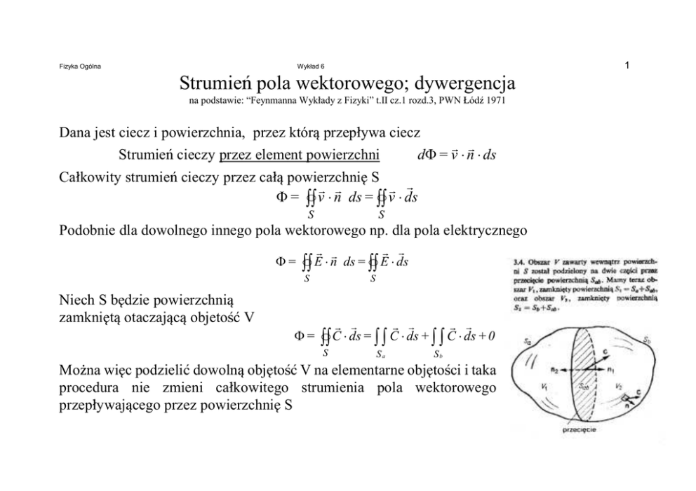 Fizyka Ogólna 1 Wykład 6 Strumie½ pola wektorowego; dywergencja na podstawie: “Feynmanna Wyk»ady z Fizyki” t.II cz.1 rozd.3, PWN ºódï 1971 Dana jest ciecz i powierzchnia, przez któr przep»ywa ciecz Strumie½ cieczy przez element powierzchni r r dΦ = v ⋅ n ⋅ ds Ca»kowity strumie½ cieczy przez ca» powierzchni“ S r r r r Φ = ∫∫ v ⋅ n ds = ∫∫ v ⋅ ds S S Podobnie dla dowolnego innego pola wektorowego np. dla pola elektrycznego Φ= r r r r E ⋅ n ds = E ∫∫ ∫∫ ⋅ ds S Niech S b“dzie powierzchni zamkni“t otaczajc objetoу V S r r r r r r Φ = ∫∫ C ⋅ ds = ∫ ∫ C ⋅ ds + ∫ ∫ C ⋅ ds + 0 S Sa Sb Moóna wi“c podzieliƒ dowoln obj“toу V na elementarne obj“toÑci i taka procedura nie zmieni ca»kowitego strumienia pola wektorowego przep»ywajcego przez powierzchni“ S Fizyka Ogólna Wykład 6 Weïmy wi“c elementarn obj“toу w kszta»cie sześcianu ∆V = ∆ x ∆ y ∆ z r Znajdziemy strumie½ dowolnego wektora C przez powierzchni“ ∆S otaczajc obj“toу ∆V powierzchnia 1: powierzchnia 2: -Cx (x,y,z) ∆y∆z +Cx (x+∆x,y,z) ∆y∆z ∂ Cx 1 ∂2 C x ∆x + ∆ x 2 + .... C x (x + ∆x, y, z) = C x (x, y, z) + 2 2 ∂x ∂x Dla ma»ego ∆x suma strumieni przez powierzchni“ 1 i 2: ∂Cx ∆x∆y∆z ∂x Podobnie dla powierzchni 3 i 4 oraz dla powierzchni 5 i 6 szeÑcianu. 2 Fizyka Ogólna 3 Wykład 6 Ostatecznie ca»kowity strumie½ przez elementarny szeÑcian o obj“toÑci ∆V: r r r ∂Cx ∂C y ∂Cz C ⋅ d s = ( + + ) ∆ V ≡ d ivC ∆V ∫∫ ∂ x ∂ y ∂ z S Dywergencja jest wi““c strumieniem pola wektorowego obliczanym na jednostk““ obj““toÑÑci. SciÑlej: w granicy objetoÑci malejcej do zera. Twierdzenie Greena i Gaussa: r r r C ⋅ d s = d ∫∫ ∫ ∫ ∫ ivC dv S V Fizyka Ogólna 4 Wykład 6 Króenie pola wektorowego; rotacja Ca»ka krzywoliniowa r gdy C = grad ψ(x,y,z) r r r r ⋅ C d l = C lim ∑ ⋅ ∆ l i ∫ Γ ∆ l i →0 i gdzie ψ(x,y,z) jest dowoln g»adk funkcj skalarn to 2 r ∫ grad ψ (x, y, z) dl =ψ (2) -ψ (1) 1 Gdy droga Γ jest krzyw zamkni“t to r r ∫ C dl Γ r nazywa si“ cyrkulacj (króeniem) pola wektorowego C Fizyka Ogólna Wykład 6 5 • Dowolny kontur zamkni“ty Γ moóna podzieliƒ na kontury elementarne. Ca»kowita cyrkulacja po konturze Γ b“dzie wtedy suma cyrkulacji po elementarnych konturach. Jest to dzia»anie takie samo jak podzia» obwodu elektrycznego na “oczka”. Fizyka Ogólna Wykład 6 Weïmy elementarny kontur w postaci kwadratu. Za»óómy, óe leóy on w p»aszczyïnie Oxy. r r ∫ Cdl = C x (1) ∆x + C y (2) ∆y Γ - C x (3) ∆x - C y (4) ∆y 6 Fizyka Ogólna Dla ustalenia uwagi rozpatrzmy: 7 Wykład 6 [ C x (1) - C x (3) ] ∆x C x (3) = C x (1) + ∂Cx ∆y ∂y [ C x (1) - C x (3) ] ∆x = - ∂C x ∆x ∆y ∂y Podobnie dla boków 2 i 4: r r ∂ C y ∂C x C d l = ( ) ∆x ∆y ∫ ∂ x ∂ y kontur r r ∂C ∂ Dla konturu o kszta»cie kwadratu leócego w p»aszczyïnie Oyz ∫ C dl = ( C z - y ) ∆y ∆z ∂y ∂z kontur r r ∂ ∂ a dla konturu leócego w p»aszczyïnie Oxz ∫ C dl = ( C x - C z ) ∆x ∆z ∂z ∂x kontur Fizyka Ogólna Wykład 6 Dla dowolnie zorientowanego konturu o dowolny kszta»cie: r rw przestrzeni r r C d l = rot C d s ∫ ∫∫ Γ S Jest to twierdzenie Stokesa przy czym S jest powierzchni rozpi“t na konturze Γ. Wektor elementu powierzchni dany jest przez r r ds = n ds Kierunek wektora normalnego okreÑla regu»a prawej r“ki. W uk»adzie kartezja½skim rotacja wektora Cr zapisuje si“: r ∂C y ∂Cx r rot C = ( )i z+ ∂x ∂y ∂C y r ∂ ( Cz )i x+ ∂y ∂z ∂ ∂ r ( Cx - Cz )i y ∂z ∂x 8 Fizyka Ogólna 9 Wykład 6 Naj»atwiej zapami“taƒ ten wzór pos»ugujc si“ zapisem operatorowym r rot C = r ix r iy r iz ∂ ∂x ∂ ∂y r ∂ = ∇ xC ∂z Cx Cy Cz gdzie operator nabla ∆ ≡( ∂ ∂ ∂ , , ) ∂x ∂y ∂z Fizyka Ogólna 10 Wykład 6 Pola bezwirowe: Na mocy twierdzenia Stokesa: r rot C = 0 ⇔ r r C ∫ dl = 0 Γ ∫ a+b r r C dl = r r 1 r r ∫ C dl + ∫ C dl = 0 2 2 1 a std: 2 b 1 r r r r ∫ Cdl = - ∫ Cdl = 2 1 a 1 b Wniosek Gdy rotacja pola wektorowego znika ca»ka krzywoliniowa po tym polu nie zaleóy od drogi ca»kowania a tylko od po»oóenia jej kra½ców. r Wtedy moóna wprowadziƒ potencja» skalarny zdefiniowany przez C = - grad ψ 2 b r r ∫ Cd l Fizyka Ogólna Wykład 6 2 r ∇ ψ d l = ψ (2) - ψ (1) ∫ 1 Twierdzenie odwrotne: JeÑli dany jest potencja» ψ (x,y,z) (jeÑli istnieje taki potencja») to r ∫ ∇ψ dl = 0 Γ wynika to z toósamoÑci: rot ( ∇ψ ) ≡ 0 Wniosek Pola dane przez gradient potencja»u (pola pot potencjalne) s polami bezwirowymi. 11