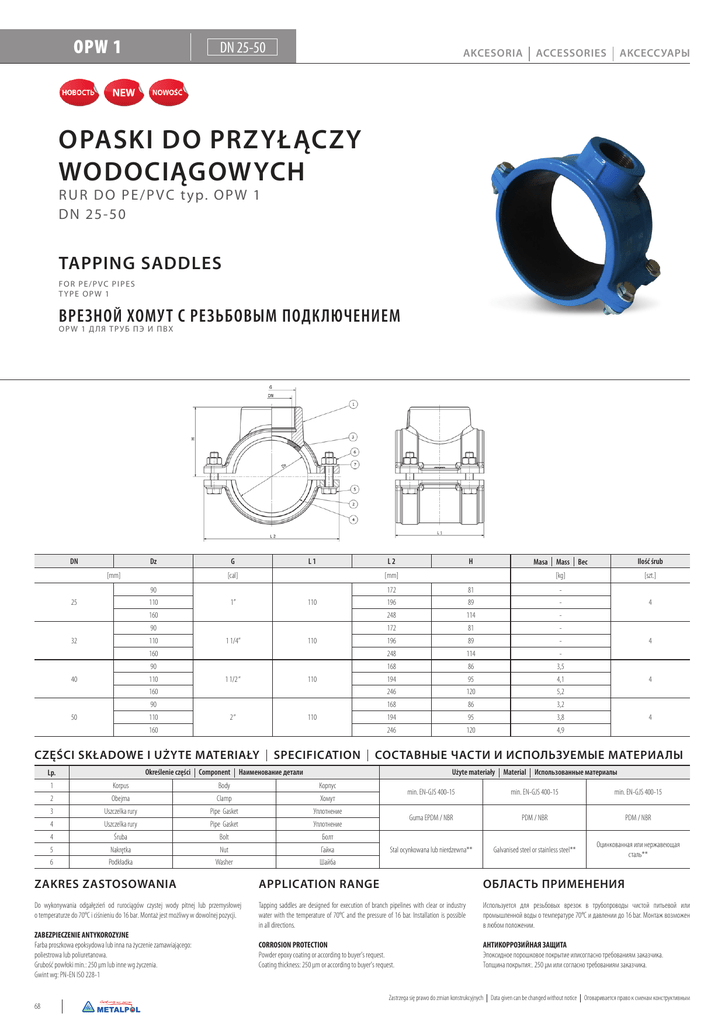 OPW 1 DN 25-50 AKCESORIA ACCESSORIES АКСЕССУАРЫ OPASKI DO PRZYŁĄCZY WODOCIĄGOWYCH R U R D O P E / P V C t y p. OP W 1 D N 25- 50 TAPPING SADDLES FOR PE/PVC PIPES T YPE OPW 1 ВРЕЗНОЙ ХОМУТ С РЕЗЬБОВЫМ ПОДКЛЮЧЕНИЕМ OPW 1 ДЛЯ ТРУБ ПЭ И ПВХ DN Dz [mm] G L1 L2 [cal] 90 25 1’’ 110 160 90 110 1 1/4’’ 110 160 90 40 110 1 1/2 ‘‘ 110 160 90 50 110 2 ‘‘ 110 160 CZĘŚCI SKŁADOWE I UŻYTE MATERIAŁY Określenie części Lp. Component Masa SPECIFICATION 81 89 - 248 114 - 172 81 - 196 89 - 248 114 - 168 86 3,5 194 95 4,1 246 120 5,2 168 86 3,2 194 95 3,8 246 120 4,9 Body Корпус 2 Obejma Clamp Хомут 3 Uszczelka rury Pipe Gasket Уплотнение 4 Uszczelka rury Pipe Gasket Уплотнение 4 Śruba Bolt Болт 5 Nakrętka Nut Гайка 6 Podkładka Washer Шайба [szt.] 4 4 4 4 СОСТАВНЫЕ ЧАСТИ И ИСПОЛЬЗУЕМЫЕ МАТЕРИАЛЫ Użyte materiały Korpus Ilość śrub Bec - 196 Наименование детали 1 Mass [kg] 172 110 32 H [mm] Material Использованные материалы min. EN-GJS 400-15 min. EN-GJS 400-15 min. EN-GJS 400-15 Guma EPDM / NBR PDM / NBR PDM / NBR Stal ocynkowana lub nierdzewna** Galvanised steel or stainless steel** Оцинкованная или нержавеющая сталь** ZAKRES ZASTOSOWANIA APPLICATION RANGE ОБЛАСТЬ ПРИМЕНЕНИЯ Do wykonywania odgałęzień od rurociągów czystej wody pitnej lub przemysłowej o temperaturze do 70°C i ciśnieniu do 16 bar. Montaż jest możliwy w dowolnej pozycji. Tapping saddles are designed for execution of branch pipelines with clear or industry water with the temperature of 70°C and the pressure of 16 bar. Installation is possible in all directions. Используется для резьбовых врезок в трубопроводы чистой питьевой или промышленной воды о температуре 70°C и давлении до 16 bar. Монтаж возможен в любом положении. CORROSION PROTECTION Powder epoxy coating or according to buyer’s request. Coating thickness: 250 µm or according to buyer’s request. АНТИКОРРОЗИЙНАЯ ЗАЩИТА Эпоксидное порошковое покрытие илисогласно требованиям заказчика. Толщина покрытия:. 250 µм или согласно требованиям заказчика. ZABEZPIECZENIE ANTYKOROZYJNE Farba proszkowa epoksydowa lub inna na życzenie zamawiającego: poliestrowa lub poliuretanowa. Grubość powłoki min.: 250 µm lub inne wg życzenia. Gwint wg: PN-EN ISO 228-1 68 Zastrzega się prawo do zmian konstrukcyjnych Data given can be changed without notice Оговаривается право к сменам конструктивным