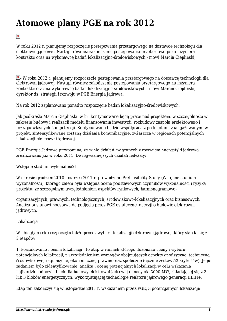 Atomowe plany PGE na rok 2012 W roku 2012 r. planujemy rozpoczęcie postępowania przetargowego na dostawcę technologii dla elektrowni jądrowej. Nastąpi również zakończenie postępowania przetargowego na inżyniera kontraktu oraz na wykonawcę badań lokalizacyjno-środowiskowych - mówi Marcin Ciepliński, - W roku 2012 r. planujemy rozpoczęcie postępowania przetargowego na dostawcę technologii dla elektrowni jądrowej. Nastąpi również zakończenie postępowania przetargowego na inżyniera kontraktu oraz na wykonawcę badań lokalizacyjno-środowiskowych - mówi Marcin Ciepliński, dyrektor ds. strategii i rozwoju w PGE Energia Jądrowa. Na rok 2012 zaplanowano ponadto rozpoczęcie badań lokalizacyjno-środowiskowych. Jak podkreśla Marcin Ciepliński, w br. kontynuowane będą prace nad projektem, w szczególności w zakresie budowy i realizacji modelu finansowania inwestycji, rozbudowy zespołu projektowego i rozwoju własnych kompetencji. Kontynuowana będzie współpraca z podmiotami zaangażowanymi w projekt, zintensyfikowane zostaną działania komunikacyjne, zwłaszcza w regionach potencjalnych lokalizacji elektrowni jądrowej. PGE Energia Jądrowa przypomina, że wiele działań związanych z rozwojem energetyki jądrowej zrealizowano już w roku 2011. Do najważniejszych działań należały: Wstępne studium wykonalności W okresie grudzień 2010 - marzec 2011 r. prowadzono Prefeasibility Study (Wstępne studium wykonalności), którego celem była wstępna ocena podstawowych czynników wykonalności i ryzyka projektu, ze szczególnym uwzględnieniem aspektów rynkowych, harmonogramowoorganizacyjnych, prawnych, technologicznych, środowiskowo-lokalizacyjnych oraz biznesowych. Analiza ta stanowi podstawę do podjęcia przez PGE ostatecznej decyzji o budowie elektrowni jądrowych. Lokalizacja W ubiegłym roku rozpoczęto także proces wyboru lokalizacji elektrowni jądrowej, który składa się z 3 etapów: 1. Poszukiwanie i ocena lokalizacji - to etap w ramach którego dokonano oceny i wyboru potencjalnych lokalizacji, z uwzględnieniem wymogów obejmujących aspekty geofizyczne, techniczne, środowiskowe, regulacyjne, ekonomiczne, prawne oraz społeczne (łącznie zestaw 53 kryteriów). Jego zadaniem było zidentyfikowanie, analiza i ocenę potencjalnych lokalizacji w celu wskazania najbardziej odpowiednich dla budowy elektrowni jądrowej o mocy ok. 3000 MW, składającej się z 2 lub 3 bloków energetycznych, wykorzystującej technologie reaktora jądrowego generacji III/III+. Etap ten zakończył się w listopadzie 2011 r. wskazaniem przez PGE, 3 potencjalnych lokalizacji: http://www.elektrownia-jadrowa.pl/ 1 ● ● ● Choczewo (gmina Choczewo, powiat wejherowski, województwo pomorskie), Gąski (gmina Mielno, powiat koszaliński, województwo zachodniopomorskie), Żarnowiec (gmina Krokowa, powiat pucki, województwo pomorskie). 2. Badania lokalizacyjne i środowiskowe dla 3 rekomendowanych lokalizacji - rozpoczną się już na wiosnę 2012 roku i będą polegały na: ● ● opracowaniu przez wykonawcę badań Raportu oceny oddziaływania na środowisko, w wyniku którego zostaną wykonane analizy mające na celu ocenę potencjalnego oddziaływania elektrowni jądrowej na otoczenie. przeprowadzeniu przez wykonawcę badań lokalizacyjnych obejmujących m.in. wszystkie szczegółowe zagadnienia dla wskazanej lokalizacji związane z przydatnością lokalizacji dla celów budowy elektrowni jądrowej oraz wszelkie inne kwestie (w szczególności geotechniczne, hydro-geologiczne oraz dotyczące środowiska) 3. Wybór docelowej lokalizacji elektrowni jądrowej - nastąpi w 2013 roku. Na podstawie przeprowadzonych badań zostanie podjęta decyzja o wyborze docelowej lokalizacji elektrowni jądrowej oraz zostaną złożone wymagane wnioski w celu uzyskania pozwoleń. Wybór technologii W obszarze działań na rzecz wyboru technologii zorganizowano w Warszawie w dniach 22-23 września 2011 r. konferencję w której wzięło udział siedem firm lub konsorcjów firm, tj. kanadyjskie Lavalin (d. AECL), francuskie konsorcjum Areva/EdF, francusko-japońskie konsorcjum ATMEA, amerykańsko-japońskie GE Hitachi, koreańskie KEPCO, japońskie Mitsubishi oraz amerykańsko-japoński Westinghouse/Toshiba. Ich przedstawiciele podkreślali zwłaszcza transparentność i konkurencyjność, jaką zakłada projekt, zwracając jednocześnie uwagę na uwarunkowania wynikające z konieczności stosowania prawa zamówień publicznych. Inżynier kontraktu W celu zapewnienia profesjonalnego wsparcia w realizacji zadań inwestora w stosunku do dostawcy technologii i głównego wykonawcy oraz pozostałych wykonawców kluczowych prac niezbędne jest pozyskanie doradcy technicznego - inżyniera kontraktu (Owner’s engineer) tj. firmy posiadającej doświadczenie w przygotowaniu i zarządzaniu dużymi projektami inwestycyjnymi w zakresie energetyki jądrowej. Dlatego też, w 5 lutego 2011 roku uruchomione zostało postępowanie "Świadczenie przez Doradcę Technicznego usług doradztwa technicznego w procesie inwestycyjnym związanym z budową przez PGE EJ 1 Sp. z o.o. pierwszej polskiej elektrowni jądrowej o mocy ok. 3000 MW". Obecnie w postępowaniu bierze udział czterech oferentów: konsorcjum Scott Wilson Polska i Tractebel Engineering; Exelon Generation Company; AMEC Nuclear UK Ltd. oraz konsorcjum Mott MacDonald Limited i AF-Colenco Limited. Inżynier kontraktu będzie stanowił integralną część organizacji Inwestora (PGE) wspierając go na wszystkich etapach realizacji projektu, od obecnie trwających prac przygotowawczych aż do uruchomienia elektrowni. Główne zadania określone w zakresie prac inżyniera kontraktu można podzielić na cztery obszary: zarządzanie projektem i wsparcie w rozwoju kompetencji po stronie PGE, wsparcie w procesie kontraktacji dostawcy technologii reaktora oraz głównego wykonawcy EPC, wsparcie przy realizacji całości inwestycji w tym infrastruktur