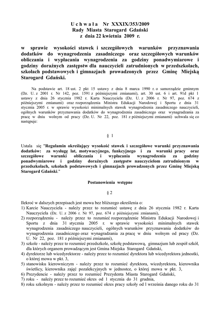 U c h w a ł a Nr XXXIX/353/2009 Rady Miasta Starogard Gdański z dnia 22 kwietnia 2009 r. w sprawie wysokości stawek i szczegółowych warunków przyznawania dodatków do wynagrodzenia zasadniczego oraz szczegółowych warunków obliczania i wypłacania wynagrodzenia za godziny ponadwymiarowe i godziny doraźnych zastępstw dla nauczycieli zatrudnionych w przedszkolach, szkołach podstawowych i gimnazjach prowadzonych przez Gminę Miejską Starogard Gdański. Na podstawie art. 18 ust. 2 pkt 15 ustawy z dnia 8 marca 1990 r. o samorządzie gminnym (Dz. U. z 2001 r. Nr 142, poz. 1591 z późniejszymi zmianami), art. 30 ust. 6 i art. 91d pkt 1 ustawy z dnia 26 stycznia 1982 r. Karta Nauczyciela (Dz. U. z 2006 r. Nr 97, poz. 674 z późniejszymi zmianami) oraz rozporządzenia Ministra Edukacji Narodowej i Sportu z dnia 31 stycznia 2005 r. w sprawie wysokości minimalnych stawek wynagrodzenia zasadniczego nauczycieli, ogólnych warunków przyznawania dodatków do wynagrodzenia zasadniczego oraz wynagradzania za pracę w dniu wolnym od pracy (Dz. U. Nr 22, poz. 181 z późniejszymi zmianami) uchwala się co następuje: § 1 Ustala się "Regulamin określający wysokość stawek i szczegółowe warunki przyznawania dodatków: za wysługę lat, motywacyjnego, funkcyjnego i za warunki pracy oraz szczegółowe warunki obliczania i wypłacania wynagrodzenia za godziny ponadwymiarowe i godziny doraźnych zastępstw nauczycielom zatrudnionym w przedszkolach, szkołach podstawowych i gimnazjach prowadzonych przez Gminę Miejską Starogard Gdański." Postanowienia wstępne §2 Ilekroć w dalszych przepisach jest mowa bez bliższego określenia o: 1) Karcie Nauczyciela - należy przez to rozumieć ustawę z dnia 26 stycznia 1982 r. Karta Nauczyciela (Dz. U. z 2006 r. Nr 97, poz. 674 z późniejszymi zmianami), 2) rozporządzeniu - należy przez to rozumieć rozporządzenie Ministra Edukacji Narodowej i Sportu z dnia 31 stycznia 2005 r. w sprawie wysokości minimalnych stawek wynagrodzenia zasadniczego nauczycieli, ogólnych warunków przyznawania dodatków do wynagrodzenia zasadniczego oraz wynagradzania za pracę w dniu wolnym od pracy (Dz. U. Nr 22, poz. 181 z późniejszymi zmianami), 3) szkole - należy przez to rozumieć przedszkole, szkołę podstawową, gimnazjum lub zespół szkół, dla których organem prowadzącym jest Gmina Miejska Starogard Gdański, 4) dyrektorze lub wicedyrektorze - należy przez to rozumieć dyrektora lub wicedyrektora jednostki, o której mowa w pkt. 3, 5) stanowisku kierowniczym - należy przez to rozumieć dyrektora, wicedyrektora, kierownika świetlicy, kierownika zajęć pozalekcyjnych w jednostce, o której mowa w pkt. 3, 6) Prezydencie - należy przez to rozumieć Prezydenta Miasta Starogard Gdański, 7) roku - należy przez to rozumieć okres od 1 stycznia do 31 grudnia, 8) roku szkolnym - należy przez to rozumieć okres pracy szkoły od l września danego roku do 31 sierpnia roku następnego, 9) klasie - należy przez to rozumieć oddział w przedszkolu, oddział przedszkolny przy szkole podstawowej, klasę w szkole podstawowej, gimnazjum, zespole szkół, 10) uczniu - należy przez to rozumieć dziecko z jednostki, o której mowa w pkt. 3, 11) nauczycielu - należy przez to rozumieć także pedagoga, psychologa, logopedę, nauczyciela-bibliotekarza biblioteki szkolnej, wychowawcę świetlicy, wychowawcę świetlicy terapeutycznej, doradcę zawodowego oraz terapeutę i rehabilitanta realizującego zajęcia w oddziałach integracyjnych, zatrudnionych na podstawie Karty Nauczyciela, 12) tygodniowym obowiązkowym wymiarze godzin - należy przez to rozumieć tygodniowy obowiązkowy wymiar godzin, o którym mowa w art. 42 ust. 3 lub ustalonego na podstawie art. 42 ust. 7 Karty Nauczyciela, 13) minimalnym wynagrodzeniu zasadniczym nauczyciela stażysty – należy przez to rozumieć minimalne wynagrodzenie nauczyciela ze stopniem zawodowym „nauczyciel stażysta” z tytułem zawodowym magistra z przygotowaniem pedagogicznym, o którym mowa w załączniku do rozporządzenia. § 3 Stawki wynagrodzenia zasadniczego nauczycieli przyjmuje się w wysokości określonej rozporządzeniem. Dodatek za wysługę lat §4 1. Dodatek za wysługę lat ustala się zgodnie z art. 33 Karty Nauczyciela. 2. Dodatek za wysługę lat przysługuje: 1) począwszy od pierwszego dnia miesiąca kalendarzowego następującego po miesiącu, w którym nauczyciel nabył prawo do dodatku lub do wyższej stawki dodatku, jeżeli nabycie prawa nastąpiło w ciągu miesiąca, 2) za dany miesiąc, jeżeli nabycie prawa do dodatku lub wyższej jego stawki nastąpiło od pierwszego dnia miesiąca. 3. Dodatek za wysługę lat przysługuje za okres urlopu dla poratowania zdrowia oraz za dni, za które nauczyciel otrzymuje wynagrodzenie, chyba że przepis szczególny stanowi inaczej. Dodatek ten przysługuje również za dni nieobecności w pracy z powodu niezdolności do pracy wskutek choroby lub konieczności osobistego sprawowania opieki nad dzieckiem lub chorym członkiem rodziny, za które nauczyciel otrzymuje wynagrodzenie lub zasiłek z ubezpieczenia społecznego. 4. Wyliczoną procentowo wysokość dodatku zaokrągla się do pełnych złotych. 5. Dodatek za wysługę lat wypłaca się z góry, w terminie wypłaty wynagrodzenia. Dodatek motywacyjny §5 Warunkiem przyznania nauczycielowi, w tym pełniącemu stanowisko kierownicze, dodatku motywacyjnego jest: 1) uzyskiwanie szczególnych osiągnięć dydaktycznych, wychowawczych i opiekuńczych: a) dobrych osiągnięć dydaktyczno-wychowawczych uczniów potwierdzanych wynikami klasyfikacji lub promocji, wynikami egzaminów, sprawdzianów, sukcesami w konkursach, zawodach, olimpiadach, b) umiejętne rozwiązywanie problemów wychowawczych uczniów we współpracy z ich rodzinami i instytucjami wspomagającymi, c) aktywne i efektywne działanie na rzecz uczniów potrzebujących szczególnej opieki, 2) jakość świadczonej pracy, w tym związanej z pe