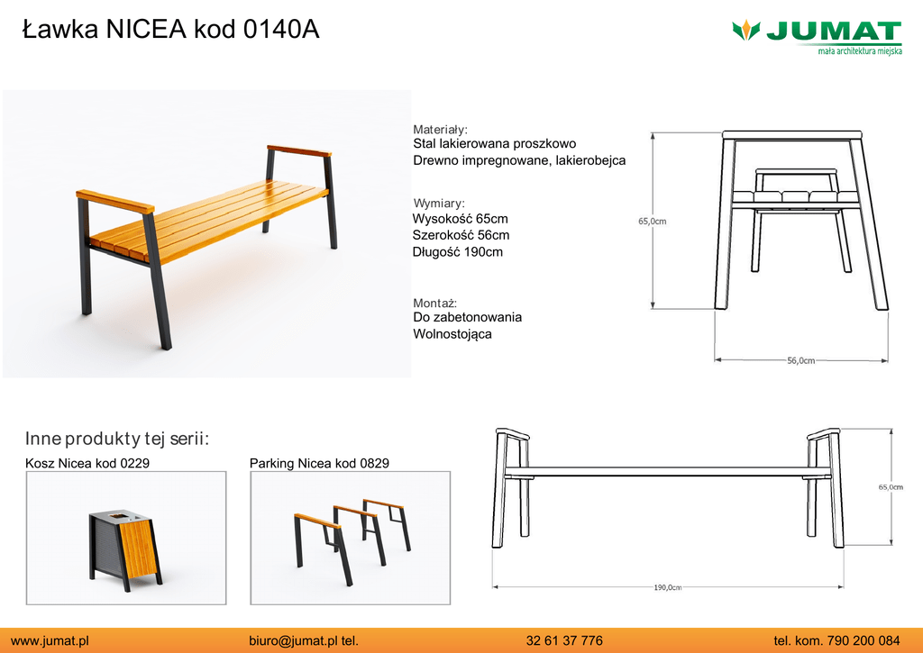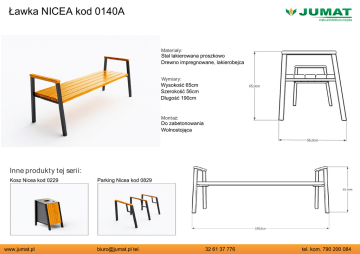 Ławka NICEA kod 0140A Materiały: Stal lakierowana proszkowo Drewno impregnowane, lakierobejca Wymiary: Wysokość 65cm Szerokość 56cm Długość 190cm Montaż: Do zabetonowania Wolnostojąca Inne produkty tej serii: Kosz Nicea kod 0229 www.jumat.pl Parking Nicea kod 0829 [email protected] tel. 32 61 37 776 tel. kom. 790 200 084