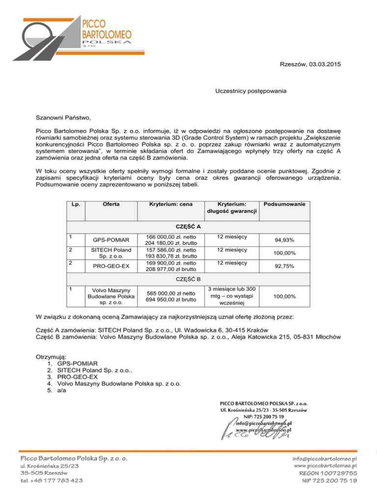 Rzeszów, 03.03.2015 Uczestnicy postępowania Szanowni Państwo, Picco Bartolomeo Polska Sp. z o.o. informuje, iż w odpowiedzi na ogłoszone postępowanie na dostawę równiarki samobieżnej oraz systemu sterowania 3D (Grade Control System) w ramach projektu „Zwiększenie konkurencyjności Picco Bartolomeo Polska sp. z o. o. poprzez zakup równiarki wraz z automatycznym systemem sterowania”, w terminie składania ofert do Zamawiającego wpłynęły trzy oferty na część A zamówienia oraz jedna oferta na część B zamówienia. W toku oceny wszystkie oferty spełniły wymogi formalne i zostały poddane ocenie punktowej. Zgodnie z zapisami specyfikacji kryteriami oceny były cena oraz okres gwarancji oferowanego urządzenia. Podsumowanie oceny zaprezentowano w poniższej tabeli. Lp. Oferta Kryterium: cena Kryterium: długość gwarancji Podsumowanie CZĘŚĆ A 1 2 2 GPS-POMIAR SITECH Poland Sp. z o.o. PRO-GEO-EX 166 000,00 zł. netto 204 180,00 zł. brutto 157 586,00 zł. netto 193 830,78 zł. brutto 169 900,00 zł. netto 208 977,00 zł brutto 12 miesięcy 12 miesięcy 12 miesięcy 94,93% 100,00% 92,75% CZĘŚĆ B 1 Volvo Maszyny Budowlane Polska sp. z o.o. 565 000,00 zł netto 694 950,00 zł brutto 3 miesiące lub 300 mtg – co wystąpi wcześniej 100,00% W związku z dokonaną oceną Zamawiający za najkorzystniejszą uznał ofertę złożoną przez: Część A zamówienia: SITECH Poland Sp. z o.o., Ul. Wadowicka 6, 30-415 Kraków Część B zamówienia: Volvo Maszyny Budowlane Polska sp. z o.o., Aleja Katowicka 215, 05-831 Młochów Otrzymują: 1. GPS-POMIAR 2. SITECH Poland Sp. z o.o.. 3. PRO-GEO-EX 4. Volvo Maszyny Budowlane Polska sp. z o.o. 5. a/a