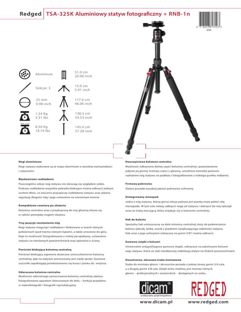 Redged TSA-325K Aluminiowy statyw fotograficzny + RNB-1n EAN Aluminum 51.0 cm 20.08 inch Sekcje: 3 15.0 cm 5.91 inch 25 mm 0.98 inch 117.0 cm 46.06 inch 1.54 Kg 3.31 lbs 138.5 cm 54.53 inch 8.50 Kg 18.74 lbs 145.0 cm 57.28 inch Max. Load Nogi aluminiowe Dwuczęściowa kolumna centralna Nogi statywu wykonane są ze stopu aluminium o wysokiej wytrzymałości Możliwość odkręcenia dolnej części kolumny centralnej i pozostawienie i sztywności. jedynie jej górnej, krótszej części z głowicą, umożliwia niemalże poziome rozłożenie nóg statywu na podłożu i fotografowanie z niskiego punktu widzenia. Błyskawiczne rozkładanie Poszczególne sekcje nóg statywu nie obracają się względem siebie. Firmowy pokrowiec Podczas rozkładania wszystkie pokrętła blokujące można odkręcić jednym Statyw posiada wysokiej jakości pokrowiec ochronny. ruchem dłoni, co znacznie przyspiesza rozkładanie statywu oraz ułatwia regulację długości nóg i jego ustawienie na nierównym terenie. Zintegrowany monopod Jedna z nóg statywu, której górna sekcja pokryta jest pianką może pełnić rolę Kompaktowe rozmiary po złożeniu monopodu. W tym celu należy odkręcić nogę od statywu i dokręcić do niej talerzyk Kolumna centralna wraz z przykręconą do niej głowicą chowa się wraz ze śrubą mocującą, który znajduje się w kolumnie centralnej. w całości pomiędzy nogami statywu. Hak do balastu Trzy pozycje rozstawienia nóg Nogi statywu mogą być rozkładane i blokowane w trzech różnych położeniach (pod trzema różnymi kątami), a także unoszone do góry. Daje to możliwość fotografowania z niskiej perspektywy, ustawiania statywu na nierównych powierzchniach oraz opierania o ściany. Pierścień blokujący kolumnę centralną Specjalny hak umieszczony na dole kolumny centralnej służy do podwieszenia balastu (plecak, torba, worek z piaskiem) zwiększającego stabilność statywu. Hak wraz z jego uchwytem (wkręcany na gwint 3/8") można odkręcić. Gumowe stopki z kolcami Uniwersalne antypoślizgowe gumowe stopki, nakręcane na zakończone kolcami nogi statywu. Kolce ze stali nierdzewnej stabilizują statyw na śliskich powierzchniach. Pierścień blokujący zapewnia skuteczne unieruchomienie kolumny centralnej, gdy na statywie zamocowany jest ciężki sprzęt. Gumowe Dwustronna, obracana śruba montażowa uszczelki zapobiegają przedostawaniu się kurzu i piasku do wnętrza. Śruba do montażu głowic i akcesoriów posiada z jednej strony gwint 3/4 cala, a z drugiej gwint 3/8 cala. Dzięki temu możliwy jest montaż różnych Odwracana kolumna centralna Możliwość odwrotnego zamocowania kolumny centralnej ułatwia głowic – profesjonalnych i amatorskich – dostępnych na rynku. fotografowanie aparatem skierowanym do dołu – funkcja przydatna ® w makrofotografii i fotografii reprodukcyjnej. www.dicam.pl www.redged.com