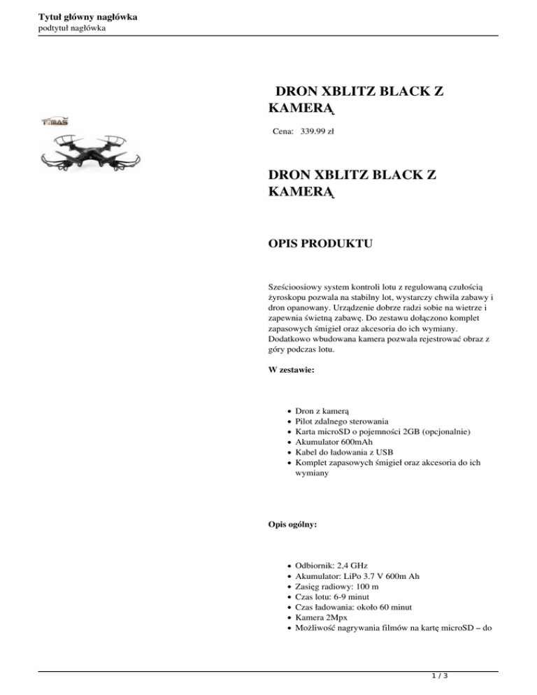 Tytuł główny nagłówka podtytuł nagłówka DRON XBLITZ BLACK Z KAMERĄ Cena: 339.99 zł DRON XBLITZ BLACK Z KAMERĄ OPIS PRODUKTU Sześcioosiowy system kontroli lotu z regulowaną czułością żyroskopu pozwala na stabilny lot, wystarczy chwila zabawy i dron opanowany. Urządzenie dobrze radzi sobie na wietrze i zapewnia świetną zabawę. Do zestawu dołączono komplet zapasowych śmigieł oraz akcesoria do ich wymiany. Dodatkowo wbudowana kamera pozwala rejestrować obraz z góry podczas lotu. W zestawie: Dron z kamerą Pilot zdalnego sterowania Karta microSD o pojemności 2GB (opcjonalnie) Akumulator 600mAh Kabel do ładowania z USB Komplet zapasowych śmigieł oraz akcesoria do ich wymiany Opis ogólny: Odbiornik: 2,4 GHz Akumulator: LiPo 3.7 V 600m Ah Zasięg radiowy: 100 m Czas lotu: 6-9 minut Czas ładowania: około 60 minut Kamera 2Mpx Możliwość nagrywania filmów na kartę microSD – do 1/3 Tytuł główny nagłówka podtytuł nagłówka 16GB Wymiary (szer. x wys. x gł.) [mm] 330 x 330 x 78 Materiał: tworzywo sztuczne 2/3 Tytuł główny nagłówka podtytuł nagłówka 3/3 Powered by TCPDF (www.tcpdf.org)