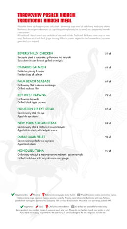 TRADYCYJNY POSIŁEK HIBACHI TRADITIONAL HIBACHI MEAL Wszystkie dania są dostępne przez cały dzień i zawierają: zupę miso lub cebulową, tradycyjną sałatkę Benihana z dressingiem imbirowym, ryż i japońską zieloną herbatę (na życzenie) oraz przystawkę: krewetki z warzywami. All traditional Hibachi meals are available all day and include: Traditional Benihana onion soup or miso soup; Benihana salad with fresh ginger dressing; Hibachi prawns, vegetables and steamed rice; Japanese green tea (upon request). BEVERLY HILLS CHICKEN 59 zł Soczysta pierś z kurczaka, grillowana lub teriyaki Succulent chicken breast, grilled or teriyaki ONTARIO SALMON 64 zł Delikatne plastry łososia Tender slices of salmon PALM BEACH SEABASS 69 zł Grillowany filet z okonia morskiego Grilled seabass fillet KEY WEST PRAWNS 79 zł Grillowane krewetki Grilled black tiger prawns HOUSTON RIB EYE STEAK 85 zł Sezonowany stek rib eye Aged rib eye steak NEW YORK SIRLOIN STEAK 84 zł Sezonowany stek z rostbefu z sosem teriyaki Aged sirloin steak with teriyaki sauce DUBAI LAMB FILLET 94 zł Sezonowana polędwica jagnięca Aged lamb steak HONOLULU TUNA 99 zł Grillowany tuńczyk z marynowanym imbirem i sosem teriyaki Grilled fresh tuna with teriyaki sauce and ginger Wegetariańskie. Pikantne. Rekomendowane przez Szefa Kuchni. Wszystkie dania można zamówić na wynos. Niektóre dania mogą zawierać nasiona sezamu i orzechy. Prosimy pytać kelnera lub kucharza, jeśli mają Państwo jakiekolwiek wymagania żywieniowe. Dodajemy 10% serwisu do rachunków. Wszystkie ceny zawierają podatek VAT. Vegetarian. Spicy. Chef’s Recommendation. All dishes are available for take away. Some products may contain traces of seasame seeds and nuts. Please do not hesitate to ask your waiter or chef if you have any dietary requirements. We add 10% of service charge to the bill. All prices include VAT.