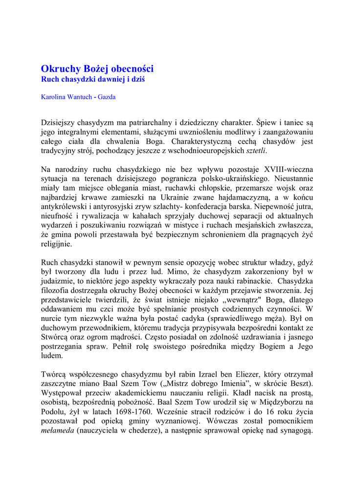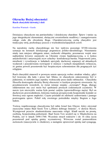 Okruchy Bożej obecności Ruch chasydzki dawniej i dziś Karolina Wantuch - Gazda Dzisiejszy chasydyzm ma patriarchalny i dziedziczny charakter. Śpiew i taniec są jego integralnymi elementami, służącymi uwzniośleniu modlitwy i zaangażowaniu całego ciała dla chwalenia Boga. Charakterystyczną cechą chasydów jest tradycyjny strój, pochodzący jeszcze z wschodnioeuropejskich sztetli. Na narodziny ruchu chasydzkiego nie bez wpływu pozostaje XVIII-wieczna sytuacja na terenach dzisiejszego pogranicza polsko-ukraińskiego. Nieustannie miały tam miejsce oblegania miast, ruchawki chłopskie, przemarsze wojsk oraz najbardziej krwawe zamieszki na Ukrainie zwane hajdamaczyzną, a w końcu antykrólewski i antyrosyjski zryw szlachty- konfederacja barska. Niepewność jutra, nieufność i rywalizacja w kahałach sprzyjały duchowej separacji od aktualnych wydarzeń i poszukiwaniu rozwiązań w mistyce i ruchach mesjańskich zwłaszcza, że gmina powoli przestawała być bezpiecznym schronieniem dla pragnących żyć religijnie. Ruch chasydzki stanowił w pewnym sensie opozycję wobec struktur władzy, gdyż był tworzony dla ludu i przez lud. Mimo, że chasydyzm zakorzeniony był w judaizmie, to niektóre jego aspekty wykraczały poza nauki rabinackie. Chasydzka filozofia dostrzegała okruchy Bożej obecności w każdym przejawie stworzenia. Jej przedstawiciele twierdzili, że świat istnieje niejako „wewnątrz" Boga, dlatego oddawaniem mu czci może być spełnianie prostych codziennych czynności. W nurcie tym niezwykle ważna była postać cadyka (sprawiedliwego męża). Był on duchowym przewodnikiem, któremu tradycja przypisywała bezpośredni kontakt ze Stwórcą oraz ogrom mądrości. Często posiadał on zdolność uzdrawiania i jasnego postrzegania spraw. Pełnił rolę swoistego pośrednika między Bogiem a Jego ludem. Twórcą współczesnego chasydyzmu był rabin Izrael ben Eliezer, który otrzymał zaszczytne miano Baal Szem Tow („Mistrz dobrego Imienia”, w skrócie Beszt). Występował przeciw akademickiemu nauczaniu religii. Kładł nacisk na prostą, osobistą, bezpośrednią pobożność. Baal Szem Tow urodził się w Międzyborzu na Podolu, żył w latach 1698-1760. Wcześnie stracił rodziców i do 16 roku życia pozostawał pod opieką gminy wyznaniowej. Wówczas został pomocnikiem mełameda (nauczyciela w chederze), a następnie sprawował opiekę nad synagogą. Był zdolnym uczniem, szybko chłonął wiedzę talmudyczną i kabalistyczną, lecz ponoć ukrywał przed ludźmi swoje studia i kontakty z cadykami. Posiadał zdolności kontemplacyjne i mistyczne. Jego przydomek Pan Dobrego Imienia pochodził od tego, że wytwarzał amulety z hebrajskimi imionami Boga. Za pomocą ludowej medycyny umiał wypędzać złe duchy. Udawało mu się osiągać stan intensywnych kontemplacji, którym nieraz towarzyszyły mistyczne wizje. Podstawą jego nauczania była umiejętność dostrzegania Boga we wszystkich elementach świata i doświadczenie Jego obecności. Radził, by służyć Bogu z radością poprzez modlitwę i codzienne zwykłe czynności, odrzucając ascezę i zamartwianie się. Modlitwa w jego rozumieniu miała angażować zarówno umysł, jak i ciało. Zalecał też gwałtowne ruchy pomagające wchodzić w trans, dzięki któremu dusza zdobywała boską wiedzę potrzebną w ziemskich trudnościach. Wierzył, iż sam jest pośrednikiem między Bogiem a ludźmi. Pozostawił po sobie jedynie modlitwy i homilie, gdyż był przeciwnikiem spisywania nauk. Mimo to, jednemu z jego uczniów udało się przemycić nieco nauk mistrza w pismach. Natomiast prawdziwą skarbnicę wiedzy o Baalu stanowi Szewachim – zbiór legend na jego temat. Jednym z największych jego osiągnięć jest przeniesienie mistycyzmu wcześniej dostępnego tylko elitom niejako „pod strzechę” i poprzez to zbliżenie ludzi do Boga. To postępowanie płynęło z wiary ben Eliezera w to, że każdy człowiek ma do wypełnienia we wszechświecie ważną misję i najczęściej czyni to nieświadomie. Trudno się więc dziwić, że takie rozumienie powinności religijnych wpłynęło na rozpowszechnienie się chasydyzmu w krótkim czasie w całej Europie Środkowo-Wschodniej. Istnieje wiele odłamów chasydyzmu, m.in. Wisznicer, Lubawiczer, Belzer czy Bracławer. W niektórych nazwach domów chasydzkich brzmi echo wschodnioeuropejskich miejscowości, z których wywodzi się dany ród. Obecnie ponad połowa chasydzkiej społeczności mieszka w Izraelu, a drugie co do ich liczebności skupisko znajduje się w USA.