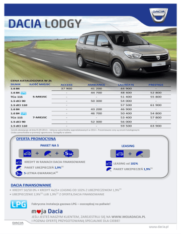 CENA KATALOGOWA W ZŁ SILNIK ILOŚĆ MIEJSC ACCESS AMBIANCE LAUREATE PRESTIGE 37 900 41 200 44 900 - - 44 700 48 400 52 800 - - 51 400 55 800 1.5 dCi 90 - 50 300 54 000 - 1.5 dCi 110 - - 57 500 61 900 1.6 84 - 43 200 46 900 - 1.6 84 - 46 700 50 400 54 800 - - 53 400 57 800 1.5 dCi 90 - 52 300 56 000 - 1.5 dCi 110 - - 59 500 63 900 1.6 84 1.6 84 5-MIEJSC TCe 115 7-MIEJSC TCe 115 Cennik obowiązuje od dnia 01.09.2014 r. i dotyczy samochodów wyprodukowanych w 2014 r. Prezentowane ceny są cenami katalogowymi. Liczba samochodów w promocji ograniczona. Szczegóły w salonie. OFERTA PROMOCYJNA PAKIET NA 5 + LEASING + KREDYT W RAMACH DACIA FINANSOWANIE PAKIET UBEZPIECZEŃ 1,9%(1) + LEASING od 102% PAKIET UBEZPIECZEŃ 1,9%(1) 5-LETNIA GWARANCJA(2) DACIA FINANSOWANIE • KREDYT 50/50 0% • KREDYT 4x25• LEASING OD 102% Z UBEZPIECZENIEM 1,9%(1) • UBEZPIECZENIE 2,9%(3) LUB 1,9%(1) Z OFERTĄ DACIA FINANSOWANIE Fabryczna instalacja gazowa LPG – oszczędzaj na paliwie! JEŚLI JESTEŚ NASZYM KLIENTEM, ZAREJESTRUJ SIĘ NA WWW.MOJADACIA.PL I POZNAJ OFERTĘ PRZYGOTOWANĄ SPECJALNIE DLA CIEBIE! Access Ambiance Lauréate Prestige WYGLĄD ZEWNĘTRZNY Zderza ki Zewnętrzne kl a mki drzwi Li s twa ozdobna os łony chłodni cy Obudowy zewnętrznych l us terek bocznych Boczne l i s twy ochronne Rel i ngi da chowe Sta l owe obręcze kół 14’’ Sta l owe obręcze kół 15’’ z pełnymi kołpa ka mi Obręcze kół ze s topu meta l i l ekki ch 15’’ Obręcze kół ze s topu meta l i l ekki ch 16’’ La ki er meta l i zowa ny w kol orze na dwozi a dwukol orowe dwukol orowe dwukol orowe cza rne cza rne w kol orze na dwozi a w kol orze na dwozi a w kol orze na dwozi a w kol orze na dwozi a chromowa na chromowa na cza rne cza rne w kol orze na dwozi a w kol orze na dwozi a ● ● ● ● ● ● ● ●** ●* ● ● 1 010 1 200 ● 1 900 1 900 1 900 SIEDZENIA I WYSTRÓJ WNĘTRZA Kons ol a centra l na (kol ory) cza rny cza rny cza rny błys zczący, obra mowa ni e chrom cza rny błys zczący, obra mowa ni e chrom Obra mowa ni e na wi ewów (kol ory) Obra mowa ni e zega rów na des ce rozdzi el czej Ki erowni ca i ga łka dźwi gni zmi eny bi egów pokryte s kórą Wewnętrzne kl a mki drzwi Płyty drzwi (kol or) cza rny cza rny cza rne cza rny chrom cza rny cza rne dwukol orowe chrom chrom 310 chrom dwukol orowe chrom chrom ● chrom dwukol orowe Ka na pa drugi ego rzędu ze s kła da nym opa rci em w ukła dzi e 1/1 ● - - - Ka na pa drugi ego rzędu ze s kła da nym opa rci em w ukła dzi e 1/3 - 2/3 i możl i woś ci ą złożeni a do pi onu - ● ● ● - ● ● ● - - - ● ● ●* ● ● ● ● - ● ●* ● ● ● ● P1 ● ●* ● ● ● ● ● ● ● ● ● ● ● ● ● ● ● ● ● ● ● - ● - ● - - ● ● ● ● ● ● ● ● ● ● ● ● 310 ● 310 ● 310 ● 310 Ka na pa trzeci ego rzędu s i edzeń z opa rci em s kła da nym w ukła dzi e 1/1 i możl i woś ci ą złożeni a do pi onu l ub wyjęci a (wers je 7-mi ejs cowe) Dywa ni ki teks tyl ne BEZPIECZEŃSTWO CZYNNE I BIERNE ABS z ukła dem ws poma ga ni a na głego ha mowa ni a Sys tem kontrol i toru ja zdy ESC Sys tem kontrol i ci ś ni eni a w opona ch* Czołowa podus zka powi etrzna ki erowcy i pa s a żera Boczne podus zki powi etrzne z przodu Pa s y bezpi eczeńs twa ki erowcy z na pi na cza mi Przedni e pa s y bezpi eczeńs twa z regul a cją wys okoś ci Tyl ne 3-punktowe pa s y bezpi eczeńs twa w drugi m i trzeci m rzędzi e s i edzeń Przedni e za główki z regul a cją wys okoś ci Tyl ne za główki z regul a cją wys okos ci (w drugi m rzędzi e) Tyl ne, regul owa ne na wys okoś ć i ws uwa ne w opa rci e za główki w drugi m i trzeci m rzędzi e s i edzen 3 za główki tyl ne (za główek centra l ny ws uwa ny w opa rci e) Sys tem mocowa ni a fotel i ków dzi eci ęcych Is ofi x na 3 mi ejs ca ch drugi ego rzędu Zes ta w do na pra wy us zkodzeni a opony Koło za pa s owe (ni e dotyczy wers ji z LPG) Access Ambiance Lauréate Prestige ● ● ● ● ● ● - ● ● ● 650 ● ● ● ● 650 ● ● ● ● ● ● - 310 ● - ● ● ● ● ● ● Centra l ny za mek drzwi , zda l ni e s terowa ny fa l a mi ra di owymi El ektryczni e podnos zone s zyby przedni e El ektryczni e podnos zone s zyby tyl ne - ● ● - ● ● 310 ● ● ● Przedni a l a mpka s ufi towa z l a mpką do czyta ni a po s troni e pa s a żera - - ● ● Gni a zdo 12 V dos tępne z drugi ego rzędu s i edzeń Przenoś na popi el ni czka /za pa l ni czka Fotel e przedni e podgrzewa ne Ki erowni ca regul owa na na wys okoś ć Fotel ki erowcy z regul a cją wys okoś ci Oś wi etl eni e ba ga żni ka (wers ja 5-mi ejs cowe) Kl i ma tyza cja ma nua l na ● - ● ● 550 P1 P1 ● 2 550 ● ● 550 ● ● ● ● ● ● 550 ● ● ● ● otwa rty ● ●/- otwa rty ● ● /● ● 210/-/-/- za myka ny ● ● /● ● ● 210/-/-/- za myka my ● ● /● ● ● ●/-/● ●/- - 900 900 - - - 1 950 ● - - 400 400 - 700 ● ● ZABEZPIECZENIE SAMOCHODU Kodowa na bl oka da za płonu PROWADZENIE I URZĄDZENIA KONTROLNE Ws poma ga ni e ukła du ki erowni czego Komputer pokła dowy (ni e dotyczy wers ji z LPG) Kontrol a ni eza pi ęci a przedni ch pa s ów bezpi eczeńs twa Regul a tor / ogra ni czni k prędkoś ci Sys tem ws poma ga ni a pa rkowa ni a tyłem WIDOCZNOŚĆ Świ a tła przeci wmgłowe Podgrzewa na tyl na s zyba / Wyci era czka tyl nej s zyby Lus terka boczne podgrzewa ne i regul owa ne el ektyczni e KOMFORT SCHOWKI Schowek w górnej częś ci des ki rozdzi el czej otwa rty/za myka ny Ki es zeń w przedni ch drzwi a ch Ki es zeń w tyl nych drzwi a ch Schowek w des ce rozdzi el czej otwa rty/za myka ny Ki es zeni e na tyl nej s troni e opa rć przedni ch fotel i Przykryci e częś ci ba ga żowej Si a tka za bezpi ecza jąca ba ga ż (wers je 5-/ 7-mi ejs cowe) Si a tka kopertowa (wers je 5-/ 7-mi ejs cowe) Wkła d do ba ga żni ka (wers je 5-/ 7-mi ejs cowe) KOMUNIKACJA Da ci a Pl ug