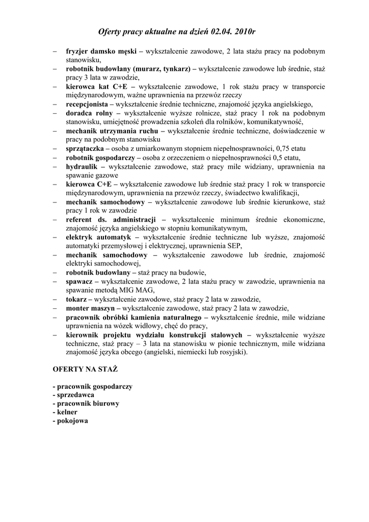 Oferty pracy aktualne na dzień 02.04. 2010r − − − − − − − − − − − − − − − − − − − − fryzjer damsko męski – wykształcenie zawodowe, 2 lata stażu pracy na podobnym stanowisku, robotnik budowlany (murarz, tynkarz) – wykształcenie zawodowe lub średnie, staż pracy 3 lata w zawodzie, kierowca kat C+E – wykształcenie zawodowe, 1 rok stażu pracy w transporcie międzynarodowym, ważne uprawnienia na przewóz rzeczy recepcjonista – wykształcenie średnie techniczne, znajomość języka angielskiego, doradca rolny – wykształcenie wyższe rolnicze, staż pracy 1 rok na podobnym stanowisku, umiejętność prowadzenia szkoleń dla rolników, komunikatywność, mechanik utrzymania ruchu – wykształcenie średnie techniczne, doświadczenie w pracy na podobnym stanowisku sprzątaczka – osoba z umiarkowanym stopniem niepełnosprawności, 0,75 etatu robotnik gospodarczy – osoba z orzeczeniem o niepełnosprawności 0,5 etatu, hydraulik – wykształcenie zawodowe, staż pracy mile widziany, uprawnienia na spawanie gazowe kierowca C+E – wykształcenie zawodowe lub średnie staż pracy 1 rok w transporcie międzynarodowym, uprawnienia na przewóz rzeczy, świadectwo kwalifikacji, mechanik samochodowy – wykształcenie zawodowe lub średnie kierunkowe, staż pracy 1 rok w zawodzie referent ds. administracji – wykształcenie minimum średnie ekonomiczne, znajomość języka angielskiego w stopniu komunikatywnym, elektryk automatyk – wykształcenie średnie techniczne lub wyższe, znajomość automatyki przemysłowej i elektrycznej, uprawnienia SEP, mechanik samochodowy – wykształcenie zawodowe lub średnie, znajomość elektryki samochodowej, robotnik budowlany – staż pracy na budowie, spawacz – wykształcenie zawodowe, 2 lata stażu pracy w zawodzie, uprawnienia na spawanie metodą MIG MAG, tokarz – wykształcenie zawodowe, staż pracy 2 lata w zawodzie, monter maszyn – wykształcenie zawodowe, staż pracy 2 lata w zawodzie, pracownik obróbki kamienia naturalnego – wykształcenie średnie, mile widziane uprawnienia na wózek widłowy, chęć do pracy, kierownik projektu wydziału konstrukcji stalowych – wykształcenie wyższe techniczne, staż pracy – 3 lata na stanowisku w pionie technicznym, mile widziana znajomość języka obcego (angielski, niemiecki lub rosyjski). OFERTY NA STAŻ - pracownik gospodarczy - sprzedawca - pracownik biurowy - kelner - pokojowa