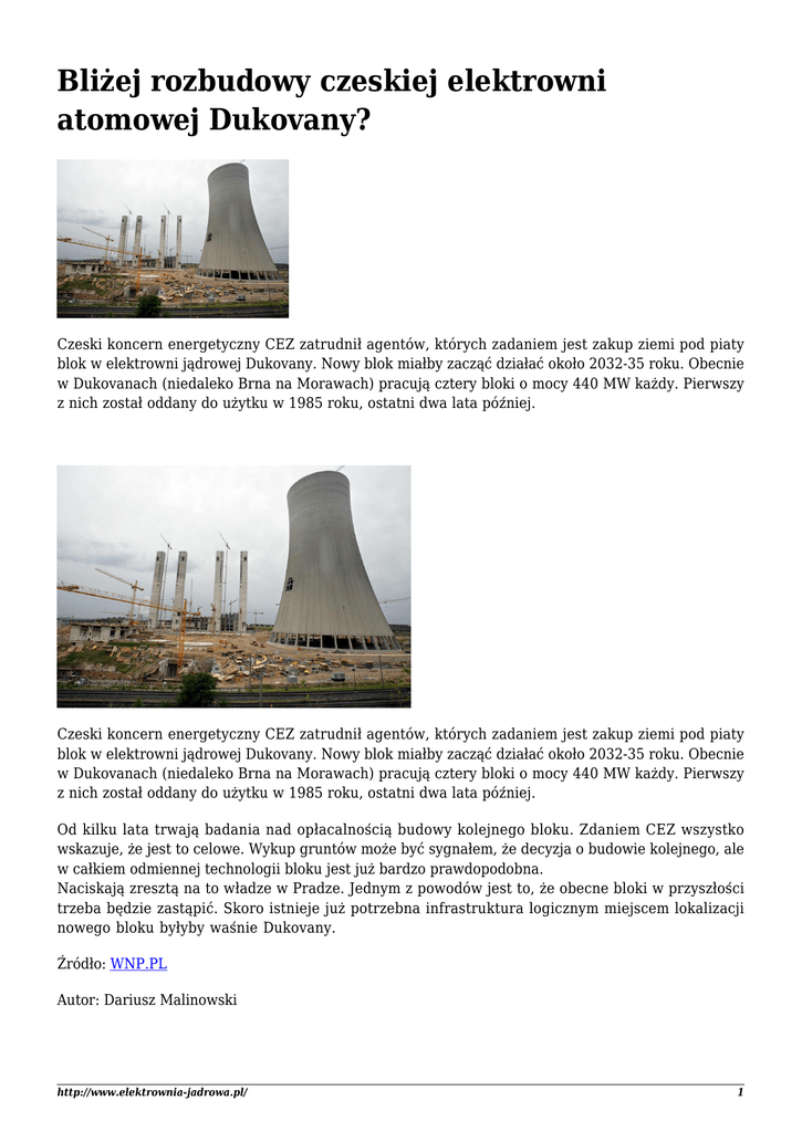 Bliżej rozbudowy czeskiej elektrowni atomowej Dukovany? Czeski koncern energetyczny CEZ zatrudnił agentów, których zadaniem jest zakup ziemi pod piaty blok w elektrowni jądrowej Dukovany. Nowy blok miałby zacząć działać około 2032-35 roku. Obecnie w Dukovanach (niedaleko Brna na Morawach) pracują cztery bloki o mocy 440 MW każdy. Pierwszy z nich został oddany do użytku w 1985 roku, ostatni dwa lata później. Czeski koncern energetyczny CEZ zatrudnił agentów, których zadaniem jest zakup ziemi pod piaty blok w elektrowni jądrowej Dukovany. Nowy blok miałby zacząć działać około 2032-35 roku. Obecnie w Dukovanach (niedaleko Brna na Morawach) pracują cztery bloki o mocy 440 MW każdy. Pierwszy z nich został oddany do użytku w 1985 roku, ostatni dwa lata później. Od kilku lata trwają badania nad opłacalnością budowy kolejnego bloku. Zdaniem CEZ wszystko wskazuje, że jest to celowe. Wykup gruntów może być sygnałem, że decyzja o budowie kolejnego, ale w całkiem odmiennej technologii bloku jest już bardzo prawdopodobna. Naciskają zresztą na to władze w Pradze. Jednym z powodów jest to, że obecne bloki w przyszłości trzeba będzie zastąpić. Skoro istnieje już potrzebna infrastruktura logicznym miejscem lokalizacji nowego bloku byłyby waśnie Dukovany. Źródło: WNP.PL Autor: Dariusz Malinowski http://www.elektrownia-jadrowa.pl/ 1