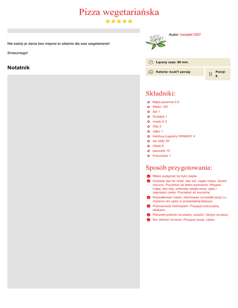 Pizza wegetariańska Autor: kwiatek1507 Nie każdy je dania bez mięsne to właśnie dla was wegetarianie! Smacznego! Łączny czas: 80 min. Notatnik Kalorie: kcal/1 porcję Porcji: 8 Składniki: Mąka pszenna 0,5 Mleko 100 Sól 1 Drożdże 1 masło 0,3 Olej 3 Jajko 1 Ketchup Łagodny WINIARY 4 ser żółty 30 Oliwki 8 pieczarki 10 Kukurydza 1 Sposób przygotowania: Mleko podgrzać by było ciepłe. Drożdże dać do miski, dać sól, ciepłe mleko. Zrobić rozczyn. Poczekać aż lekko podrośnie. Wsypać mąkę, dać olej, szklankę ciepłej wody, jajko i zagniatać ciasto. Poczekać aż wyrośnie. Rozwałkować ciasto, uformować na kształt pizzy Lu możemy też upiec w prostokątnej blaszce. Posmarować ketchupem. Posypać kukurydzą, oliwkami. Pieczarki pokroić na plastry, posolić. Ułożyć na pizzy. Ser zetrzeć na tarce. Posypać pizzę. Upiec.