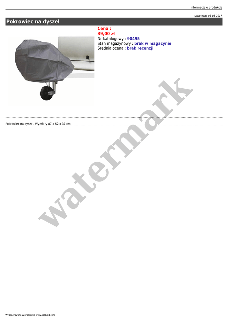 Informacje o produkcie Utworzono 08-03-2017 Pokrowiec na dyszel Cena : 39,00 zł er m ar k Nr katalogowy : 90495 Stan magazynowy : brak w magazynie Średnia ocena : brak recenzji w at Pokrowiec na dyszel. Wymiary 87 x 52 x 37 cm. Wygenerowano w programie www.oscGold.com