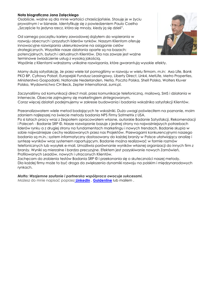 Nota biograficzna Jana Załęckiego Osobiście, ważne są dla mnie wartości chrześcijańskie. Stosuję je w życiu prywatnym i w biznesie. Identyfikuję się z powiedzeniem Paulo Coelho „Szczęście to jedyna rzecz, która się mnoży, kiedy ją się dzieli”. Od samego początku kariery zawodowej dążyłem do wspierania w rozwoju obecnych i przyszłych liderów rynków. Naszym Klientom oferuję innowacyjne rozwiązania ukierunkowane na osiąganie celów strategicznych. Wszystkie nasze działania oparte są na bazach: potencjalnych, byłych i aktualnych Klientów. Dla nas zawsze jest ważne terminowe świadczenie usług z wysoką jakością. Wspólnie z Klientami wdrażamy unikalne rozwiązania, które gwarantują wysokie efekty. Mamy dużą satysfakcję, że przez wiele lat pomogliśmy w rozwoju w wielu firmom, m.in: Axa Life, Bank PKO BP, Cyfrowy Polsat, Europejski Fundusz Leasingowy, Liberty Direct, Link4, MetLife, Metro Properties, Ministerstwo Gospodarki, Nationale Nederlanden, Netia, Poczta Polska, Shell Polska, Wolters Kluver Polska, Wydawnictwo CH Beck, Zepter International, zumi.pl. Zaczynaliśmy od komunikacji direct mail, przez komunikacje telefoniczną, mailową, SMS i działania w Internecie. Obecnie zajmujemy się marketingiem zintegrowanym. Coraz więcej działań podejmujemy w zakresie budowania i badania wskaźnika satysfakcji Klientów. Przeanalizowałem wiele metod badających te wskaźniki. Dużo uwagi poświeciłem na poznanie, moim zdaniem najlepszej na świecie metody badania NPS Firmy Satmetrix z USA. Po 6 latach pracy wraz z Zespołem opracowałem własne, autorskie Badanie Satysfakcji, Rekomendacji i Poleceń - Badanie SRP ©. Nasze rozwiązanie bazuje z jednej strony na najważniejszych potrzebach liderów rynku a z drugiej strony na fundamentach marketingu i nowych trendach. Badanie skupia w sobie najważniejsze cechy realizowanych przez nas Projektów. Przewagami konkurencyjnymi naszego badania są m.in.: system informatyczny dostosowany do każdej branży w Polsce ułatwiający analizę i syntezę wyników wraz systemem raportującym. Badanie można realizować w formie rozmów telefonicznych lub wysyłek e-mail. Umożliwia porównanie wyników własnej organizacji do innych firm z branży. Wyniki są mierzalne i bardzo precyzyjne. Efektem jest pozyskiwanie nowych Zamówień, Profilowanych Leadów, nowych i utraconych Klientów. Zachęcam do zrobienia testów Badania SRP © i przekonania się o skuteczności naszej metody. Dla każdej firmy może to być droga do zwiększenia dynamiki rozwoju na polskim i międzynarodowych rynkach. Motto: Wzajemne zaufanie i partnerska współpraca owocuje sukcesami. Możesz do mnie napisać poprzez LinkedIn , Goldenline lub mailem .