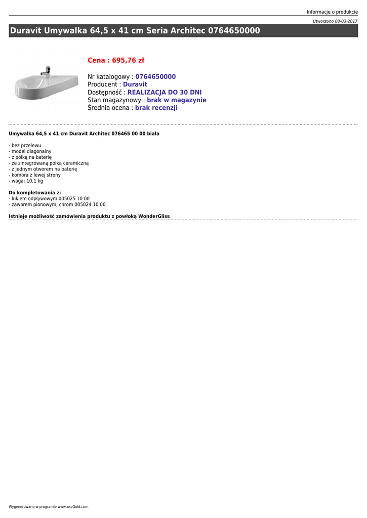 Informacje o produkcie Utworzono 08-03-2017 Duravit Umywalka 64,5 x 41 cm Seria Architec 0764650000 Cena : 695,76 zł Nr katalogowy : 0764650000 Producent : Duravit Dostępność : REALIZACJA DO 30 DNI Stan magazynowy : brak w magazynie Średnia ocena : brak recenzji Umywalka 64,5 x 41 cm Duravit Architec 076465 00 00 biała - bez przelewu - model diagonalny - z półką na baterię - ze zintegrowaną półką ceramiczną - z jednym otworem na baterię - komora z lewej strony - waga: 10,1 kg Do kompletowania z: - łukiem odpływowym 005025 10 00 - zaworem pionowym, chrom 005024 10 00 Istnieje możliwość zamówienia produktu z powłoką WonderGliss Wygenerowano w programie www.oscGold.com