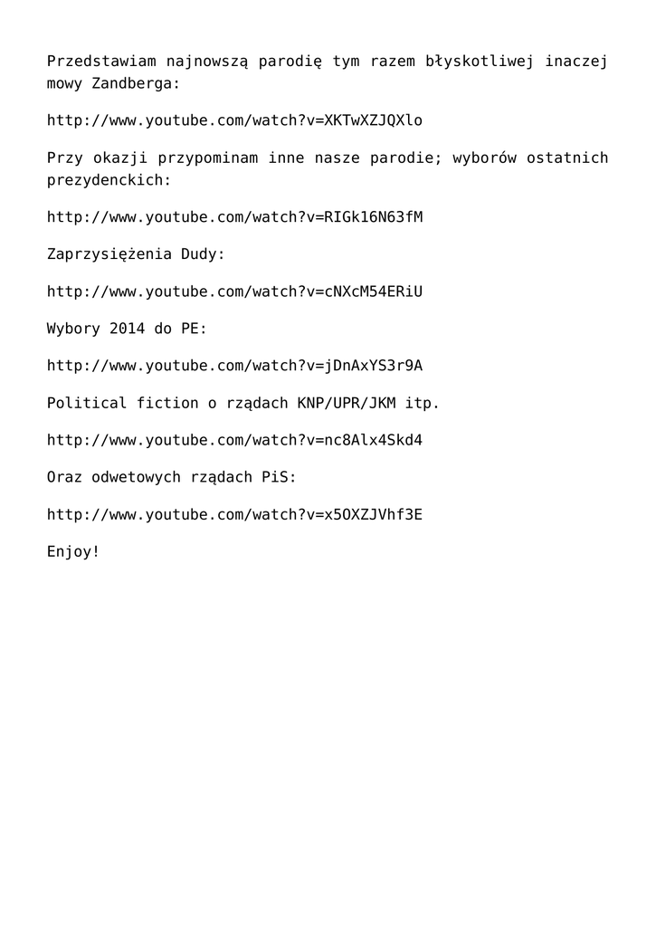 Przedstawiam najnowszą parodię tym razem błyskotliwej inaczej mowy Zandberga: http://www.youtube.com/watch?v=XKTwXZJQXlo Przy okazji przypominam inne nasze parodie; wyborów ostatnich prezydenckich: http://www.youtube.com/watch?v=RIGk16N63fM Zaprzysiężenia Dudy: http://www.youtube.com/watch?v=cNXcM54ERiU Wybory 2014 do PE: http://www.youtube.com/watch?v=jDnAxYS3r9A Political fiction o rządach KNP/UPR/JKM itp. http://www.youtube.com/watch?v=nc8Alx4Skd4 Oraz odwetowych rządach PiS: http://www.youtube.com/watch?v=x5OXZJVhf3E Enjoy!