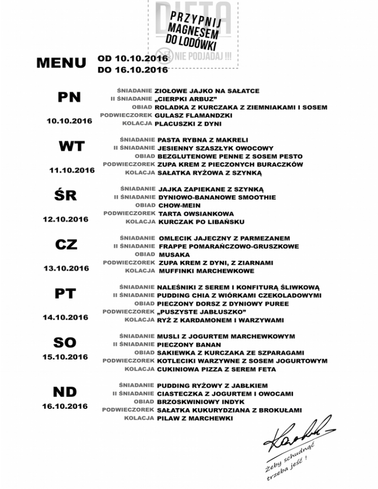 MENU PN 10.10.2016 WT 11.10.2016 ŚR 12.10.2016 CZ 13.10.2016 PT 14.10.2016 SO 15.10.2016 OD 10.10.2016 DO 16.10.2016 ŚNIADANIE ZIOŁOWE JAJKO NA SAŁATCE II ŚNIADANIE „CIERPKI ARBUZ” OBIAD ROLADKA Z KURCZAKA Z ZIEMNIAKAMI I SOSEM PODWIECZOREK GULASZ FLAMANDZKI KOLACJA PLACUSZKI Z DYNI ŚNIADANIE PASTA RYBNA Z MAKRELI II ŚNIADANIE JESIENNY SZASZŁYK OWOCOWY OBIAD BEZGLUTENOWE PENNE Z SOSEM PESTO PODWIECZOREK ZUPA KREM Z PIECZONYCH BURACZKÓW KOLACJA SAŁATKA RYŻOWA Z SZYNKĄ ŚNIADANIE JAJKA ZAPIEKANE Z SZYNKĄ II ŚNIADANIE DYNIOWO-BANANOWE SMOOTHIE OBIAD CHOW-MEIN PODWIECZOREK TARTA OWSIANKOWA KOLACJA KURCZAK PO LIBAŃSKU ŚNIADANIE OMLECIK JAJECZNY Z PARMEZANEM II ŚNIADANIE FRAPPE POMARAŃCZOWO-GRUSZKOWE OBIAD MUSAKA PODWIECZOREK ZUPA KREM Z DYNI, Z ZIARNAMI KOLACJA MUFFINKI MARCHEWKOWE ŚNIADANIE NALEŚNIKI Z SEREM I KONFITURĄ ŚLIWKOWĄ II ŚNIADANIE PUDDING CHIA Z WIÓRKAMI CZEKOLADOWYMI OBIAD PIECZONY DORSZ Z DYNIOWY PUREE PODWIECZOREK „PUSZYSTE JABŁUSZKO” KOLACJA RYŻ Z KARDAMONEM I WARZYWAMI ŚNIADANIE MUSLI Z JOGURTEM MARCHEWKOWYM II ŚNIADANIE PIECZONY BANAN OBIAD SAKIEWKA Z KURCZAKA ZE SZPARAGAMI PODWIECZOREK KOTLECIKI WARZYWNE Z SOSEM JOGURTOWYM KOLACJA CUKINIOWA PIZZA Z SEREM FETA ND 16.10.2016 ŚNIADANIE PUDDING RYŻOWY Z JABŁKIEM II ŚNIADANIE CIASTECZKA Z JOGURTEM I OWOCAMI OBIAD BRZOSKWINIOWY INDYK PODWIECZOREK SAŁATKA KUKURYDZIANA Z BROKUŁAMI KOLACJA PILAW Z MARCHEWKI
