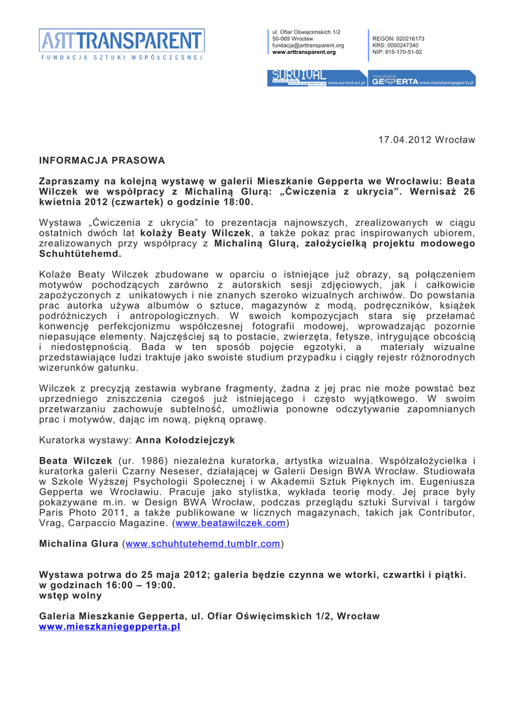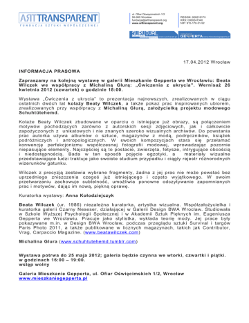 ul. Ofiar Oświęcimskich 1/2 50-069 Wrocław [email protected] www.arttransparent.org REGON: 020216173 KRS: 0000247340 NIP: 915-170-51-92 17.04.2012 Wrocław INFORMACJA PRASOWA Zapraszamy na kolejną wystawę w galerii Mieszkanie Gepperta we Wrocławiu: Beata Wilczek we współpracy z Michaliną Glurą: „Ćwiczenia z ukrycia”. Wernisaż 26 kwietnia 2012 (czwartek) o godzinie 18:00. Wystawa „Ćwiczenia z ukrycia” to prezentacja najnowszych, zrealizowanych w ciągu ostatnich dwóch lat kolaży Beaty Wilczek, a także pokaz prac inspirowanych ubiorem, zrealizowanych przy współpracy z Michaliną Glurą, założycielką projektu modowego Schuhtütehemd. Kolaże Beaty Wilczek zbudowane w oparciu o istniejące już obrazy, są połączeniem motywów pochodzących zarówno z autorskich sesji zdjęciowych, jak i całkowicie zapożyczonych z unikatowych i nie znanych szeroko wizualnych archiwów. Do powstania prac autorka używa albumów o sztuce, magazynów z modą, podręczników, książek podróżniczych i antropologicznych. W swoich kompozycjach stara się przełamać konwencję perfekcjonizmu współczesnej fotografii modowej, wprowadzając pozornie niepasujące elementy. Najczęściej są to postacie, zwierzęta, fetysze, intrygujące obcością i niedostępnością. Bada w ten sposób pojęcie egzotyki, a materiały wizualne przedstawiające ludzi traktuje jako swoiste studium przypadku i ciągły rejestr różnorodnych wizerunków gatunku. Wilczek z precyzją zestawia wybrane fragmenty, żadna z jej prac nie może powstać bez uprzedniego zniszczenia czegoś już istniejącego i często wyjątkowego. W swoim przetwarzaniu zachowuje subtelność, umożliwia ponowne odczytywanie zapomnianych prac i motywów, dając im nową, piękną oprawę. Kuratorka wystawy: Anna Kołodziejczyk Beata Wilczek (ur. 1986) niezależna kuratorka, artystka wizualna. Współzałożycielka i kuratorka galerii Czarny Neseser, działającej w Galerii Design BW A Wrocław. Studiowała w Szkole W yższej Psychologii Społecznej i w Akademii Sztuk Pięknych im. Eugeniusza Gepperta we Wrocławiu. Pracuje jako stylistka, wykłada teorię mody. Jej prace były pokazywane m.in. w Design BW A W rocław, podczas przeglądu sztuki Survival i targów Paris Photo 2011, a także publikowane w licznych magazynach, takich jak Contributor, Vrag, Carpaccio Magazine. (www.beatawilczek.com ) Michalina Glura (www.schuhtutehemd.tumblr.com ) Wystawa potrwa do 25 maja 2012; galeria będzie czynna we wtorki, czwartki i piątki. w godzinach 16:00 – 19:00. wstęp wolny Galeria Mieszkanie Gepperta, ul. Ofiar Oświęcimskich 1/2, Wrocław www.mieszkaniegepperta.pl