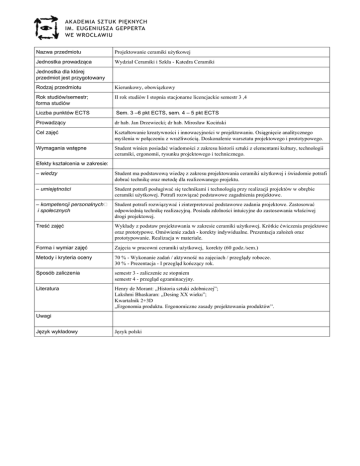 Nazwa przedmiotu Projektowanie ceramiki użytkowej Jednostka