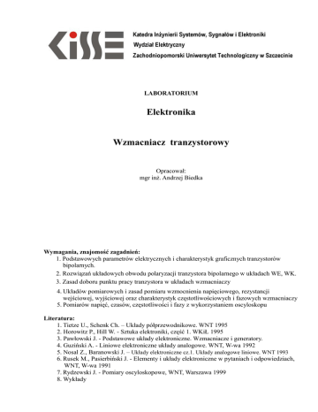 LABORATORIUM Elektronika Wzmacniacz tranzystorowy Opracował: mgr inż. Andrzej Biedka Wymagania, znajomość zagadnień: 1. Podstawowych parametrów elektrycznych i charakterystyk graficznych tranzystorów bipolarnych. 2. Rozwiązań układowych obwodu polaryzacji tranzystora bipolarnego w układach WE, WK. 3. Zasad doboru punktu pracy tranzystora w układach wzmacniaczy 4. Układów pomiarowych i zasad pomiaru wzmocnienia napięciowego, rezystancji wejściowej, wyjściowej oraz charakterystyk częstotliwościowych i fazowych wzmacniaczy 5. Pomiarów napięć, czasów, częstotliwości i fazy z wykorzystaniem oscyloskopu Literatura: 1. Tietze U., Schenk Ch. – Układy półprzewodnikowe. WNT 1995 2. Horowitz P., Hill W. - Sztuka elektroniki, część 1. WKiŁ 1995 3. Pawłowski J. - Podstawowe układy elektroniczne. Wzmacniacze i generatory. 4. Guziński A. - Liniowe elektroniczne układy analogowe. WNT, W-wa 1992 5. Nosal Z., Baranowski J. – Układy elektroniczne cz.1. Układy analogowe liniowe. WNT 1993 6. Rusek M., Pasierbiński J. - Elementy i układy elektroniczne w pytaniach i odpowiedziach, WNT, W-wa 1991 7. Rydzewski J. - Pomiary oscyloskopowe, WNT, Warszawa 1999 8. Wykłady 1. Badanie wzmacniacza tranzystorowego w układzie wspólnego emitera 1.1 Korzystając z elementów znajdujących się w obszarze block a zestawu laboratoryjnego KL23003 (p. ZAŁĄCZNIK), połączyć układ wzmacniacza ze sprzężeniem kolektorowym: +12V R6 (R5, R4) R4 OUT C6 Q1 IN C1 R7 C2 Rys. 1. Schemat ideowy wzmacniacza tranzystorowego w układzie wspólnego emitera, ze sprzężeniem kolektorowym 1.2. Określić punkt pracy tranzystora w połączonym układzie. 1.3. Narysować układ pomiaru wzmocnienia napięciowego wzmacniacza. Zmierzyć wzmocnienie dla różnych rezystancji kolektorowych oraz przy załączonym i wyłączonym kondensatorze C2. 1.4. W układzie pomiarowym według poniższego schematu zmierzyć rezystancję wejściową badanych wzmacniaczy. rwy IN G Rd rwe OUT k · uwe V Rys. 2. Układ pomiaru rezystancji wejściowej wzmacniacza 1.5. W układzie pomiarowym według poniższego schematu zmierzyć rezystancję wyjściową badanych wzmacniaczy. rwy IN rwe G OUT k · uwe Rd V Rys. 3. Układ pomiaru rezystancji wyjściowej wzmacniacza 1.6. W układzie pomiarowym z punktu 1.3 zmierzyć charakterystykę częstotliwościową wzmacniacza dla wybranej wartości rezystancji kolektorowej oraz dla załączonego i wyłączonego kondensatora C2. Charakterystykę należy mierzyć w skali logarytmicznej przyjmując wartości częstotliwości równe 1, 2, 4, 6, 8 w każdej dekadzie. Dla dwóch częstotliwości każdej dekady zmierzyć przesunięcie fazowe między sygnałem wejściowym i wyjściowym. 1.7. Korzystając z elementów znajdujących się o w obszarze block a zestawu laboratoryjnego KL23003 (p. ZAŁĄCZNIK), połączyć układ wzmacniacza z potencjometrycznym zasilaniem obwodu bazy: +12V R1 R6 (R5, R4) OUT C6 Q1 IN C1 VR2 R7 C2 R2 Rys. 4. Schemat ideowy wzmacniacza tranzystorowego w układzie wspólnego emitera, z potencjometrycznym zasilaniem bazy. 1.8. W połączonym układzie regulując wartość rezystancji VR2 (zewnętrzny moduł potencjometru o rezystancji 10kom) dobrać punkt pracy, w którym napięcie stałe mierzone między kolektorem tranzystora Q1 a masą będzie wynosić ok. ½ Vcc. Wykonać pomiary według punktów 1.3, 1.4, 1.5, 1.6. 2. Badanie wzmacniacza tranzystorowego w układzie wspólnego kolektora 2.1. Korzystając z elementów znajdujących się w obszarze block c zestawu laboratoryjnego KL23003 (p. ZAŁĄCZNIK) połączyć wzmacniacz w układzie wspólnego kolektora: +12V +5V R15 Q3 IN C5 OUT R16 Rys. 5. Schemat ideowy wzmacniacza tranzystorowego w układzie wspólnego kolektora (wtórnika emiterowego). 2.1. Zmierzyć wzmocnienie napięciowe, rezystancję wejściową, charakterystykę częstotliwościową w układzie wtórnika emiterowego. Sprawozdanie powinno zawierać: schematy układów pomiarowych, spis przyrządów, wyniki pomiarów w tabelach, obliczenia, wykresy charakterystyk, porównanie wartości pomierzonych z wartościami obliczonymi teoretycznie, wnioski. ZAŁĄCZNIK Wykaz elementów: R1 R2 R3 R4 R5 R6 R7 47 kom ± 5%/0,25W 1 kom ± 5%/0,25W 100 kom ± 5%/0,25W 4,7 kom ± 5%/0,25W 3,3 kom ± 5%/0,25W 2,2 kom ± 5%/0,25W 1 kom ± 5%/0,25W C1 C2 C6 22μF/25V 22μF/25V 47μF/25V Q1 2N3904 Fot. 1. Obszar block a zestawu KL23003 Wykaz elementów: Fot. 1. Obszar block c zestawu KL23003 R13 R14 R15 R16 10 kom ± 5% 47 kom ± 5% 22 kom ± 5% 2,2kom ± 5% C1 10μF/25V Q1 2N3904