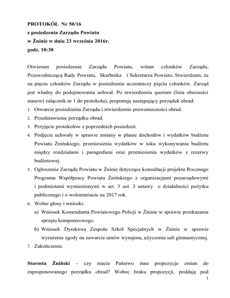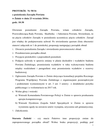 PROTOKÓŁ Nr 50/16 z posiedzenia Zarządu Powiatu w Żninie w dniu 23 września 2016r. godz. 10:30 Otwieram posiedzenie Zarządu Powiatu, witam członków Zarządu, Przewodniczącą Rady Powiatu, Skarbnika i Sekretarza Powiatu. Stwierdzam, że na pięciu członków Zarządu w posiedzeniu uczestniczy pięciu członków. Zarząd jest władny do podejmowania uchwał. Po stwierdzeniu quorum (lista obecności stanowi załącznik nr 1 do protokołu), proponuję następujący porządek obrad: 1. Otwarcie posiedzenia Zarządu i stwierdzenie prawomocności obrad. 2. Przedstawienie porządku obrad. 3. Przyjęcie protokołów z poprzednich posiedzeń. 4. Podjęcie uchwały w sprawie zmiany w planie dochodów i wydatków budżetu Powiatu Żnińskiego, przeniesienia wydatków w toku wykonywania budżetu między rozdziałami i paragrafami oraz przeniesienia wydatków z rezerwy budżetowej. 5. Ogłoszenie Zarządu Powiatu w Żninie dotyczące konsultacji projektu Rocznego Programu Współpracy Powiatu Żnińskiego z organizacjami pozarządowymi i podmiotami wymienionymi w art. 3 ust. 3 ustawy o działalności pożytku publicznego i o wolontariacie na 2017 rok. 6. Wolne głosy i wnioski: a) Wniosek Komendanta Powiatowego Policji w Żninie w sprawie przekazania sprzętu komputerowego. b) Wniosek Dyrektora Zespołu Szkół Specjalnych w Żninie w sprawie wyrażenia zgody na zawarcie umów wynajmu, użyczenia sali gimnastycznej. 7. Zakończenie. Starosta Żniński – czy macie Państwo inne propozycje zmian do zaproponowanego porządku obrad? Wobec braku propozycji, poddaję pod 1 głosowanie zaproponowany porządek obrad. Kto z członków Zarządu jest za przyjęciem przedstawionego porządku obrad? Zarząd jednogłośnie (5-za przy pięciu obecnych) przyjął zaproponowany porządek obrad. W posiedzeniu Zarządu udział wzięli: Starosta Żniński – Zbigniew Jaszczuk Wicestarosta – Andrzej Hłond Członek Zarządu – Edyta Szóstak - Ławińska Członek Zarządu– Zofia Kozłowska Członek Zarządu – Piotr Sadowski oraz Agnieszka Małecka – Sekretarz Powiatu Elżbieta Nowak – Skarbnik Powiatu z głosem doradczym. Ad. 3. Starosta Żniński – stwierdzam, że protokół z posiedzenia Zarządu, które odbyło się 9 września br. jest napisany. Zapoznałem się z jego treścią i zaparafowałem go. Treść protokołu odzwierciedla formę i przebieg posiedzenia Zarządu. Proszę członków Zarządu o zapoznanie się z jego treścią, zaparafowanie oraz przyjęcie protokołu bez czytania. Starosta Żniński - kto z członków Zarządu jest za przyjęciem protokołu z posiedzenia Zarządu bez czytania? Głosowało 5 członków: „za” - 4; „przeciw” - 0; „wstrzymujących się” - 1. Protokół został przyjęty. bez czytania. Wicestarosta - stwierdzam, że protokół z posiedzenia Zarządu, które odbyło się 14 września br. jest napisany. Zapoznałem się z jego treścią i zaparafowałem go. Treść protokołu odzwierciedla formę i przebieg posiedzenia Zarządu. Proszę 2 członków Zarządu o zapoznanie się z jego treścią, zaparafowanie oraz przyjęcie protokołu bez czytania. Wicestarosta - kto z członków Zarządu jest za przyjęciem protokołu z posiedzenia Zarządu bez czytania? Głosowało 5 członków: „za” - 4; „przeciw” - 0; „wstrzymujących się” - 1. Protokół został przyjęty bez czytania. Ad. 4. Skarbnik Powiatu – zgodnie z decyzją Wojewody Kujawsko – Pomorskiego Nr WFB. I. 3120.3.65.2016 z dnia 15 września 2016 roku wprowadzono zmniejszenie planu dochodów (§2130) w dziale 852 Pomoc społeczna, w rozdziale 85202 Domy pomocy społecznej o kwotę 98.876 zł w oparciu o analizę kosztów i odpłatności w domach pomocy społecznej za okres styczeńsierpień oraz planowanych dotacji w okresie wrzesień - grudzień 2016 roku. Dokonano przeniesienia między paragrafami klasyfikacji budżetowej w dziale 710 Działalność usługowa, w rozdziale 71012 Zadania z zakresu geodezji i kartografii (zadania własne). Zwiększono środki w § 4210 Zakup materiałów i wyposażenia o kwotę 10.000 zł, zmniejszono środki w § 4300 Zakup usług pozostałych. Zmian dokonano w związku z koniecznością prowadzenia cyfryzacji zasobu geodezyjnego i kartograficznego, realizacji zadań wynikających z przepisów prawa. Zgodnie z wnioskiem Dyrektora Zespołu Szkół Specjalnych w Żninie, Dyrektora Centrum Kształcenia Ustawicznego w Żninie oraz Dyrektora Powiatowego Zespołu Oświaty w Żninie dokonano przeniesienia między rozdziałami i paragrafami klasyfikacji budżetowej: Dział Rozdział Treść Paragraf Oświata i wychowanie 801 Zmiana 0,00 Zespół Szkół Specjalnych w Żninie 80102 4260 Szkoły podstawowe specjalne 14 104,00 Zakup energii 14 104,00 3 4280 Zakup usług zdrowotnych - 1 000,00 4300 Zakup usług pozostałych 1 970,00 4700 Szkolenia pracowników niebędących członkami korpusu służby cywilnej - 970,00 80111 Gimnazja specjalne 138,00 4300 Zakup usług pozostałych 559,00 4440 Odpisy na zakładowy fundusz świadczeń socjalnych 138,00 4700 Szkolenia pracowników niebędących członkami korpusu służby cywilnej - 559,00 Powiatowy Zespół Oświaty w Żninie Zespoły obsługi ekonomicznoadministracyjnej szkół 80114 - 10 000,00 4170 Wynagrodzenia bezosobowe - 2 000,00 4210 Zakup materiałów i wyposażenia - 4 000,00 4260 Zakup energii - 2 000,00 4410 Podróże służbowe krajowe 4430 Różne opłaty i składki - 500,00 - 1 500,00 Centrum Kształcenia Ustawicznego w Żninie 80120 4140 Licea ogólnokształcące - 4 242,00 Wpłaty na Państwowy Fundusz Rehabilitacji Osób Niepełnosprawnych - 4 242,00 Szkoły zawodowe 80130 4210 Zakup materiałów i wyposażenia Centrum Kształcenia Ustawicznego w Żninie Zespół Szkół EkonomicznoHandlowych w Żninie 4300 4410 4440 4700 0,00 - 1 700,00 800,00 - 2 500,00 Zakup usług pozostałych 2 500,00 Zespół Szkół EkonomicznoHandlowych w Żninie 2 500,00 Podróże służbowe krajowe - 1 150,00 Centru