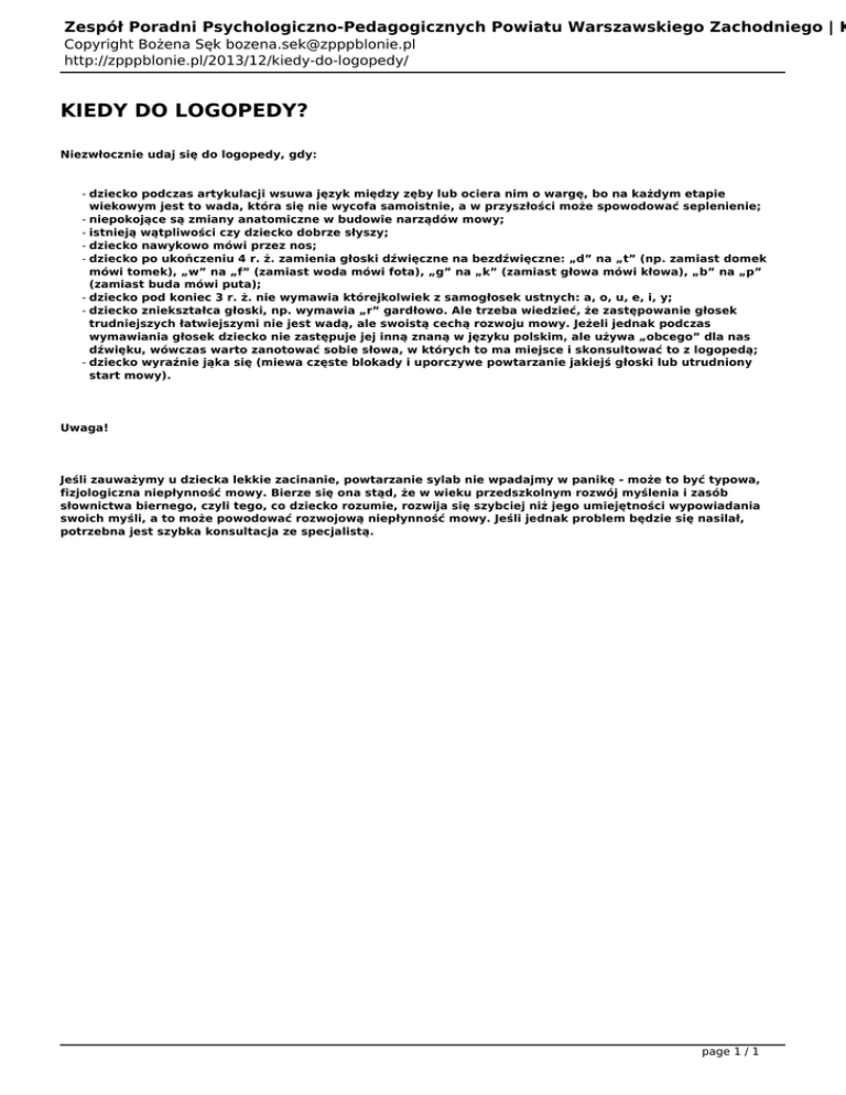 Zespół Poradni Psychologiczno-Pedagogicznych Powiatu Warszawskiego Zachodniego | K Copyright Bożena Sęk [email protected] http://zpppblonie.pl/2013/12/kiedy-do-logopedy/ KIEDY DO LOGOPEDY? Niezwłocznie udaj się do logopedy, gdy: - dziecko podczas artykulacji wsuwa język między zęby lub ociera nim o wargę, bo na każdym etapie wiekowym jest to wada, która się nie wycofa samoistnie, a w przyszłości może spowodować seplenienie; - niepokojące są zmiany anatomiczne w budowie narządów mowy; - istnieją wątpliwości czy dziecko dobrze słyszy; - dziecko nawykowo mówi przez nos; - dziecko po ukończeniu 4 r. ż. zamienia głoski dźwięczne na bezdźwięczne: „d” na „t” (np. zamiast domek mówi tomek), „w” na „f” (zamiast woda mówi fota), „g” na „k” (zamiast głowa mówi kłowa), „b” na „p” (zamiast buda mówi puta); - dziecko pod koniec 3 r. ż. nie wymawia którejkolwiek z samogłosek ustnych: a, o, u, e, i, y; - dziecko zniekształca głoski, np. wymawia „r” gardłowo. Ale trzeba wiedzieć, że zastępowanie głosek trudniejszych łatwiejszymi nie jest wadą, ale swoistą cechą rozwoju mowy. Jeżeli jednak podczas wymawiania głosek dziecko nie zastępuje jej inną znaną w języku polskim, ale używa „obcego” dla nas dźwięku, wówczas warto zanotować sobie słowa, w których to ma miejsce i skonsultować to z logopedą; - dziecko wyraźnie jąka się (miewa częste blokady i uporczywe powtarzanie jakiejś głoski lub utrudniony start mowy). Uwaga! Jeśli zauważymy u dziecka lekkie zacinanie, powtarzanie sylab nie wpadajmy w panikę - może to być typowa, fizjologiczna niepłynność mowy. Bierze się ona stąd, że w wieku przedszkolnym rozwój myślenia i zasób słownictwa biernego, czyli tego, co dziecko rozumie, rozwija się szybciej niż jego umiejętności wypowiadania swoich myśli, a to może powodować rozwojową niepłynność mowy. Jeśli jednak problem będzie się nasilał, potrzebna jest szybka konsultacja ze specjalistą. page 1 / 1