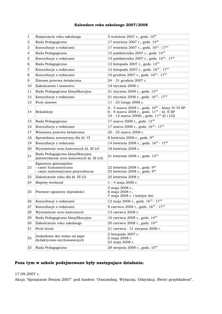 Kalendarz roku szkolnego 2007/2008 1 Rozpoczęcie roku szkolnego 3 września 2007 r., godz. 1000 2 Rada Pedagogiczna 17 września 2007 r., godz. 1430 3 Konsultacje z rodzicami 17 września 2007 r., godz. 1630 - 1730 4 Rada Pedagogiczna 15 października 2007 r., godz. 1430 5 Konsultacje z rodzicami 15 października 2007 r., godz. 1630 - 1730 6 Rada Pedagogiczna 12 listopada 2007 r., godz. 1330 7 Konsultacje z rodzicami 12 listopada 2007 r., godz. 1630 - 1730 8 Konsultacje z rodzicami 10 grudnia 2007 r., godz. 1630 - 1730 9 Zimowa przerwa świąteczna 24 - 31 grudnia 2007 r. 10 Zakończenie I semestru 18 stycznia 2008 r. 11 Rada Pedagogiczna klasyfikacyjna 21 stycznia 2008 r., godz. 1330 12 Konsultacje z rodzicami 21 stycznia 2008 r., godz. 1630 - 1730 13 Ferie zimowe 11 - 23 lutego 2008 r. 14 Rekolekcje 3 - 5 marca 2008 r., godz. 1000 – klasy IV-VI SP 6 - 8 marca 2008 r., godz. 1100 – kl. II SP 10 - 12 marca 2008r., godz. 1100 (G i LO) 15 Rada Pedagogiczna 17 marca 2008 r., godz. 1330 16 Konsultacje z rodzicami 17 marca 2008 r., godz. 1630 - 1730 17 Wiosenna przerwa świąteczna 20 - 25 marca 2008 r. 18 Sprawdzian zewnętrzny dla kl. VI 8 kwietnia 2008 r., godz. 900 19 Konsultacje z rodzicami 14 kwietnia 2008 r., godz. 1630 - 1730 20 Wystawienie ocen końcowych kl. III LO 18 kwietnia 2008 r. 21 Rada Pedagogiczna klasyfikacyjna (zatwierdzenie ocen końcowych kl. III LO) 21 kwietnia 2008 r., godz. 1330 22 Egzaminy gimnazjalne: - część humanistyczna - część matematyczno-przyrodnicza 22 kwietnia 2008 r., godz. 900 23 kwietnia 2008 r., godz. 900 23 Zakończenie roku dla kl. III LO 25 kwietnia 2008 r. 24 Majowy weekend 1 - 4 maja 2008 r. 25 Pisemne egzaminy dojrzałości 5 maja 2008 r., 6 maja 2008 r., 7 maja 2008 r. i kolejne dni 26 Konsultacje z rodzicami 12 maja 2008 r., godz. 1630 - 1730 27 Konsultacje z rodzicami 9 czerwca 2008 r., godz. 1630 - 1730 28 Wystawienie ocen końcowych 13 czerwca 2008 r. 29 Rada Pedagogiczna klasyfikacyjna 16 czerwca 2008 r., godz. 1430 30 Zakończenie roku szkolnego 20 czerwca 2008 r., godz. 1000 31 Ferie letnie 21 czerwca - 31 sierpnia 2008 r. 32 Dodatkowe dni wolne od zajęć dydaktyczno-wychowawczych 2 listopada 2007 r. 2 maja 2008 r. 23 maja 2008 r. 33 Rada Pedagogiczna 28 sierpnia 2008 r., godz. 1000 Poza tym w szkole podejmowane były następujące działania: 17.09.2007 r. Akcja "Sprzątanie Świata 2007" pod hasłem "Oszczędzaj. Wyłączaj. Odzyskuj. Świeć przykładem!". 26.09.2007 r. Przypomnieliśmy o Międzynarodowym Dniu Języków Obcych. 27.09.2007 r. Wyjście dydaktyczne do Manufaktury na wystawę "Klątwa faraonów - tajemnice starożytnego Egiptu". 10.10.2007 r. Wycieczka do Muzeum Kinematografii. 12.10.2007 r. Zajęcia z funkcjonariuszami Straży Miejskiej. 19.10.2007 r. Pierwszy z cyklu warsztatów artystycznych prowadzonych przez pracowników dydaktycznych Muzeum Sztuki dla klas SP. 31.10.2007 r. Zajęcia dydaktyczne i zwiedzanie wystawy "Kultura starożytnej Grecji" w Muzeum Archeologicznym. 09.11.2007 r. Warsztaty dla uczniów gimnazjum: "Agresja - konieczność czy wybór?" połączone z projekcją filmu "Hooligans" oraz dyskusją z psychologiem na temat poruszanej w filmie problematyki. 12.11.2007 r. Apel z okazji rocznicy odzyskania niepodległości przez Polskę. 30.11.2007 r. Zabawa andrzejkowa dla klas SP. 06.12.2007 r. Mikołajki szkolne. 07.12.2007 r. Zajęcia dydaktyczne i zwiedzanie wystawy "Kultura starożytnego Rzymu" w Muzeum Archeologicznym. 20.12.2007 r. Jasełka i wspólna wieczerza wigilijna. 05.02.2008 r. Bal karnawałowy dla klas SP. 06.02.2008 r. Wyjście klas I-IIIG i I-IILO do Eksperymentatorium w Manufakturze. 22.04.2008 r. Wycieczka do Muzeum Kinematografii. 23.04.2008 r. Wycieczka do Miejskiego Ogrodu Zoologicznego. 02.06.2008 r. - Wyjście do kina Cinema City w Manufakturze na film "Indiana Jones i Królestwo Kryształowej Czaszki". - Gry i zabawy sportowe w "indiańskiej wiosce". Wzięliśmy też udział w następujących konkursach: * XXXIV Olimpiada Historyczna * Konkurs z wiedzy na temat selektywnej zbiórki odpadów wraz z metodami odzysku i recyklingu segregowanych odpadów opakowaniowych * Konkurs na logo Aleksandrowa Łódzkiego * Polsko - Ukraiński Konkurs Fizyczny Lwiątko 2008, w których uczniowie zdobyli wyróżnienia i otrzymali nagrody rzeczowe.