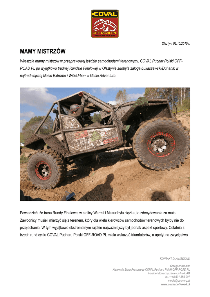 Olsztyn, 02.10.2010 r. MAMY MISTRZÓW Wreszcie mamy mistrzów w przeprawowej jeździe samochodami terenowymi. COVAL Puchar Polski OFFROAD PL po wyjątkowo trudnej Rundzie Finałowej w Olsztynie zdobyła załoga Łukaszewski/Duhanik w najtrudniejszej klasie Extreme i Wilk/Urban w klasie Adventure. Powiedzieć, że trasa Rundy Finałowej w stolicy Warmii i Mazur była ciężka, to zdecydowanie za mało. Zawodnicy musieli mierzyć się z terenem, który dla wielu kierowców samochodów terenowych byłby nie do przejechania. W tym wyjątkowo ekstremalnym rajdzie najważniejszy był jednak aspekt sportowy. Ostatnia z trzech rund cyklu COVAL Pucharu Polski OFF-ROAD PL miała wskazać triumfatorów, a apetyt na zwycięstwo KONTAKT DLA MEDIÓW: Grzegorz Kramar Kierownik Biura Prasowego COVAL Pucharu Polski OFF-ROAD PL Polskie Stowarzyszenie OFF-ROAD tel.: +48 601 356 007 [email protected] www.puchar.off-road.pl miało parę świetnych załóg. Klasyfikacja generalna w każdej z klas dawała szansę na dramatyczne przetasowania na najwyższych pozycjach. Po Odcinku Nocnym wszystko wskazywało na to, że prowadzenie zachowają liderzy klasyfikacji. W Extreme Łukaszewski przeciął trasę niemal nie zwracając uwagi na przeszkody terenowe, podobnie jak Wilk w Adventure. Ten ostatni popełnił jednak drobny błąd, w wyniku którego świetnie przejechany Odcinek Nocny w świetle regulaminu nie mógł mu zostać uznany. Potknięcie to wykorzystał Szkop, który dzięki temu zaczął poważnie myśleć o Pucharze Polski. W Extreme mimo świetnej postawy Łukaszewskiego nic nie było jeszcze przesądzone. Robert Kufel - drugi w "generalce", też poszedł bardzo mocno. Wszystko miało się rozegrać na Odcinku Dziennym. Świadomy zagrożenia Wilk ruszył na trasę Odcinka Dziennego wyjątkowo zmotywowany. Piekielnie trudne KONTAKT DLA MEDIÓW: Grzegorz Kramar Kierownik Biura Prasowego COVAL Pucharu Polski OFF-ROAD PL Polskie Stowarzyszenie OFF-ROAD tel.: +48 601 356 007 [email protected] www.puchar.off-road.pl przeprawy wodne przejeżdżał z taką wprawą i determinacją, że inni tylko przecierali oczy ze zdziwienia. W tym czasie w Extreme odbywał się dramat Kufla. Na trzecim OS-ie uszkodził o sprzęgło i przestał się liczyć w walce o pierwsze miejsce. Dzięki temu Łukaszewski mógł spokojnie jechać swoje i dowieźć prowadzenie do mety. Po ciężkiej, fizycznej rundzie poznaliśmy wreszcie najlepsze załogi sportowo-przeprawowej jazdy samochodami terenowymi. W Adventure z niewielką przewagą wygrała załoga Wilk/Urban, w Extreme zaś Łukaszewski/Duhanik zostawili rywali daleko z tyłu. Tytuł najlepszych w Polsce będą mogli nosić jednak tylko do przeszłego sezonu COVAL Pucharu Polski OFF-ROAD PL. KONTAKT DLA MEDIÓW: Grzegorz Kramar Kierownik Biura Prasowego COVAL Pucharu Polski OFF-ROAD PL Polskie Stowarzyszenie OFF-ROAD tel.: +48 601 356 007 [email protected] www.puchar.off-road.pl COVAL Puchar Polski OFF-ROAD PL 2010 Klasyfikacja generalna Klasa Adventure: 1. Mariusz Wilk/Grzegorz Urban 2. Tomasz Stokłosa/Karol Trzebny 3. Jacek Szkop/Marek Andrzejczak Klasa Extreme: 1. Marcin Łukaszewski/Magdalena Duhanik 2. Robert Kufel/Dominik Samosiuk 3. Artur Owczarek/Roman Popławski KONTAKT DLA MEDIÓW: Grzegorz Kramar Kierownik Biura Prasowego COVAL Pucharu Polski OFF-ROAD PL Polskie Stowarzyszenie OFF-ROAD tel.: +48 601 356 007 [email protected] www.puchar.off-road.pl KONTAKT DLA MEDIÓW: Grzegorz Kramar Kierownik Biura Prasowego COVAL Pucharu Polski OFF-ROAD PL Polskie Stowarzyszenie OFF-ROAD tel.: +48 601 356 007 [email protected] www.puchar.off-road.pl GENERALKA EXTEREME KLASYFIKACJA RUNDY 1 2 ¾ ¾ 5 6 7 8 9 10 11 12 13 14 15 16 17 18 19 20 21 22 23 24 25 26 27 28 29 Nr 103 141 101 193 152 132 102 124 147 175 110 148 113 123 108 149 121 145 183 104 142 137 117 146 114 109 138 119 180 Kierowca / Pilot Łukaszewski Duhanik Peczyński Chołuj Ambrozik Dworzyński Owczarek Popławski Gołka Gołka Szczygielski Kozak Kufel Samosiuk Jęch Kujbida Popielarczyk Trwoga Jabłoński Zdźiebłowski Bogusz Adamczyk Soboń Markowski Tarnowski Wierzbicki Manejkowski Sobczak Konefał Assman Matyszczuk Adamski Temple Grabowski Ciemny Lebiedź Paś Sidor Głowacki Radomski Dobrowolski Wójcik Mielnik Pachuta Stachal Stachal Gołębiowski Śledź Filip Krzywonos Piestrak Kuszewski Sikora Ćwiękała Godzic Godzic Wróbel Huszcza Pozycja noc PKT NOC Pozycja dzień PKT DZIEŃ GENERALKA 1 100 1 100 200 4 67 5 58 125 13 22 2 88 110 7 43 4 67 110 9 32 3 77 109 2 88 15 20 108 3 77 19 16 93 8 37 6 50 87 5 58 18 17 75 6 50 20 15 65 11 25 8 37 62 17 18 7 43 61 16 19 9 32 51 10 28 14 21 49 15 20 11 25 45 21 14 10 28 42 19 16 13 22 38 18 17 16 19 36 14 21 22 13 34 12 23 24 11 34 27 8 12 23 31 25 10 17 18 28 24 11 21 14 25 26 9 23 12 21 20 15 26 0 15 22 13 25 0 13 23 12 28 0 12 28 0 27 0 0 29 0 29 0 0 Strona 1 GENERALKA ADVENTURE GENERALKA ADVENTURE III RUNDA Klasyfikacja generalna Nr startowy 1 2 3 4 5 6 7 8 9 10 11 12 13 14 15 16 218 210 224 222 202 201 226 208 204 207 227 217 225 212 214 215 Kierowca / Pilot Waliszewski Stokłosa Nowakowski Szkop Florczak Wilk Skrzypczyński Solarczyk Balcewicz Bukowski Sadowski Iłowiecki Jankowska Zygarlicki Janiak Majcher Pozycja noc PKT NOC 3 1 2 9 5 15 4 12 7 13 8 10 6 11 14 16 77 100 88 32 58 0 67 23 43 22 37 28 50 25 0 0 Rybicki Trzebny Nowakowski Andrzejczak Soboń/Najder Urban Grzeca Kuśmierczak Materka Batkowski Kuligowski Iłowiecki Najder Kaczmarzyk Janiak Stolarski Strona 2 Pozycja dzień PKT DZIEŃ 3 6 8 2 5 1 10 4 9 7 13 11 16 14 12 15 77 50 37 88 58 100 28 67 32 43 22 25 0 0 23 0 Generalka 154 150 125 120 116 100 95 90 75 65 59 53 50 25 23 0