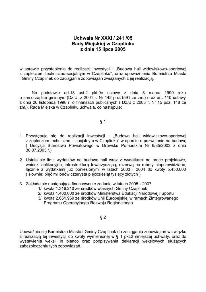 Uchwała Nr XXXI / 241 /05 Rady Miejskiej w Czaplinku z dnia 15 lipca 2005 w sprawie przystąpienia do realizacji inwestycji : „Budowa hali widowiskowo-sportowej z zapleczem techniczno-socjalnym w Czaplinku”, oraz upoważnienia Burmistrza Miasta i Gminy Czaplinek do zaciągania zobowiązań związanych z jej realizacją. Na podstawie art.18 ust.2 pkt.9e ustawy z dnia 8 marca 1990 roku o samorządzie gminnym (Dz.U. z 2001 r. Nr 142 poz.1591 ze zm.) oraz art. 110 ustawy z dnia 26 listopada 1998 r. o finansach publicznych ( Dz.U z 2003 r. Nr 15 poz. 148 ze zm.), Rada Miejska w Czaplinku uchwala, co następuje: §1 1. Przystępuje się do realizacji inwestycji : „Budowa hali widowiskowo-sportowej z zapleczem techniczno – socjalnym w Czaplinku” w oparciu o pozwolenie na budowę ( Decyzja Starostwa Powiatowego w Drawsku Pomorskim Nr 6/35/2003 z dnia 30.07.2003 r.) 2. Ustala się limit wydatków na budowę hali wraz z wydatkami na prace projektowe, wnioski aplikacyjne, infrastrukturą towarzyszącą, rezerwą na roboty nieprzewidziane, łącznie z wydatkami już poniesionymi w latach 2003 i 2004 do kwoty 5.450.000 ( słownie: pięć milionów czterysta pięćdziesiąt tysięcy złotych ) 3. Zakłada się następujące finansowanie zadania w latach 2005 - 2007: 1/ kwota 1.316.210 ze środków własnych Gminy Czaplinek 2/ kwota 1.400.000 ze środków Ministerstwa Edukacji Narodowej i Sportu 3/ kwota 2.651.969 ze środków Unii Europejskiej w ramach Zintegrowanego Programu Operacyjnego Rozwoju Regionalnego §2 Upoważnia się Burmistrza Miasta i Gminy Czaplinek do zaciągania zobowiązań w związku z realizacją tej inwestycji do kwoty wymienionej w § 1 pkt.2 niniejszej uchwały, oraz do wystawienia weksli in blanco oraz podpisywania deklaracji wekslowych służących zabezpieczeniu tych zobowiązań. §3 Niniejsza uchwała stanowi podstawę do dokonania stosownych zmian w Wykazie wieloletnich programów inwestycyjnych w 2005 r. stanowiących załącznik nr 10 do uchwały Rady Miejskiej w Czaplinku Nr XXVI / 196 / 04 z dnia 30 grudnia 2004 r. w sprawie uchwalenia budżetu Gminy Czaplinek na 2005 r. ze zmianami, oraz ujęcie kwot wynikających z harmonogramu robót w budżetach 2006 i 2007 . Przewiduje się następujące nakłady finansowe 1/ Rok 2005 – kwota 600.000 zł , w tym środki własne 500.000 zł, środki Ministerstwa Edukacji Narodowej i Sportu 100.000 zł 2/ Rok 2006 – kwota 2.195.391 zł , w tym środki własne 607.488 zł, środki Ministerstwa Edukacji Narodowej i Sportu 200.000 zł i środki Unii Europejskiej w ramach Zintegrowanego Programu Operacyjnego Rozwoju Regionalnego 1.387.903 zł 3/ Rok 2007 – kwota 2.572.788 zł , w tym środki własne 208.722 zł, środki Ministerstwa Edukacji Narodowej i Sportu 1.100.000 zł i środki Unii Europejskiej w ramach Zintegrowanego Programu Operacyjnego Rozwoju Regionalnego 1.264.066 zł §4 W przypadku negatywnego rozpatrzenia wniosku o dofinansowanie przez Ministerstwo Edukacji Narodowej i Sportu lub wniosku o dofinansowanie w ramach Zintegrowanego Programu Operacyjnego Rozwoju Regionalnego Gmina Czaplinek zobowiązuje się do finansowania inwestycji poprzez podniesienie odpowiednio udziału własnego , natomiast w przypadku negatywnego rozpatrzenia obu wniosków o dofinansowanie odst ąpi od realizacji inwestycji. §5 Wykonanie uchwały powierza się Burmistrzowi Miasta i Gminy Czaplinek. §6 Uchwała wchodzi w życie z dniem podjęcia i podlega ogłoszeniu na tablicach ogłoszeń Urzędu Miasta i Gminy Czaplinek.
