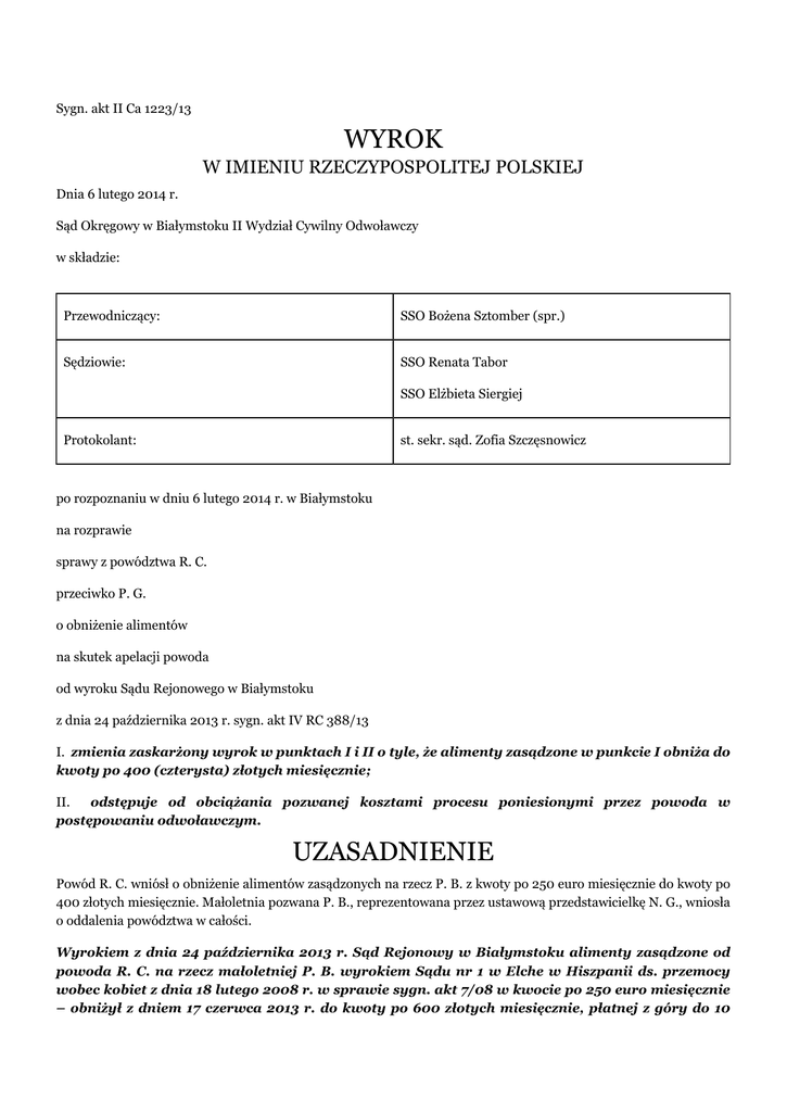 Sygn. akt II Ca 1223/13 WYROK W IMIENIU RZECZYPOSPOLITEJ POLSKIEJ Dnia 6 lutego 2014 r. Sąd Okręgowy w Białymstoku II Wydział Cywilny Odwoławczy w składzie: Przewodniczący: SSO Bożena Sztomber (spr.) Sędziowie: SSO Renata Tabor SSO Elżbieta Siergiej Protokolant: st. sekr. sąd. Zofia Szczęsnowicz po rozpoznaniu w dniu 6 lutego 2014 r. w Białymstoku na rozprawie sprawy z powództwa R. C. przeciwko P. G. o obniżenie alimentów na skutek apelacji powoda od wyroku Sądu Rejonowego w Białymstoku z dnia 24 października 2013 r. sygn. akt IV RC 388/13 I. zmienia zaskarżony wyrok w punktach I i II o tyle, że alimenty zasądzone w punkcie I obniża do kwoty po 400 (czterysta) złotych miesięcznie; II. odstępuje od obciążania pozwanej kosztami procesu poniesionymi przez powoda w postępowaniu odwoławczym. UZASADNIENIE Powód R. C. wniósł o obniżenie alimentów zasądzonych na rzecz P. B. z kwoty po 250 euro miesięcznie do kwoty po 400 złotych miesięcznie. Małoletnia pozwana P. B., reprezentowana przez ustawową przedstawicielkę N. G., wniosła o oddalenia powództwa w całości. Wyrokiem z dnia 24 października 2013 r. Sąd Rejonowy w Białymstoku alimenty zasądzone od powoda R. C. na rzecz małoletniej P. B. wyrokiem Sądu nr 1 w Elche w Hiszpanii ds. przemocy wobec kobiet z dnia 18 lutego 2008 r. w sprawie sygn. akt 7/08 w kwocie po 250 euro miesięcznie – obniżył z dniem 17 czerwca 2013 r. do kwoty po 600 złotych miesięcznie, płatnej z góry do 10 – go każdego miesiąca do rąk N. G. jako ustawowej przedstawicielki małoletniej, z ustawowymi odsetkami w razie zwłoki w płatności rat (pkt I) i oddalił powództwo w pozostałej części (pkt II). Opłatę stosunkową w wysokości 390 złotych uznał za uiszczoną w całości przez powoda (pkt III) i oddalił wniosek o zasądzenie na rzecz powoda od małoletniej pozwanej kosztów postępowania (pkt IV). Jak wynikało z ustaleń Sądu I instancji, poprzedzających powyższe rozstrzygnięcie, małoletnia P. B. urodzona w dniu (...) w E. w Hiszpanii, pochodzi z nieformalnego związku powoda R. C. oraz N. G.. Rodzice P. rozstali się w 2007 roku. Wyrokiem Sądu Nr 1 w Elche w Hiszpanii ds. przemocy wobec kobiet z dnia 18 lutego 2008 roku w sprawie o sygn. akt 7/08 pełne prawo nad małoletnią powierzono matce – N. G., ustalając jednocześnie sposób wykonywania osobistych kontaktów powoda z córką. Zasądzono także od powoda na rzecz małoletniej P. B. tytułem alimentów kwotę 250 euro miesięcznie. W dacie ostatniego orzekania w kwestii alimentów powód R. C., obywatel Hiszpanii, mieszkał w swoim ojczystym kraju. Pracował w firmie (...) y R. S. za wynagrodzeniem miesięcznym w kwocie 1.381,87 euro. Małoletnia pozwana P. B. miała wówczas 5 lat. Mieszkała wraz z matką w Hiszpanii w wynajętym mieszkaniu, którego koszt stanowiła kwota 450 euro miesięcznie. Ustawowa przedstawicielka N. G. miała wówczas 28 lat. Pracowała w fabryce z wynagrodzeniem około 1000 euro miesięcznie, a po godzinach zajmowała się wycinaniem form do butów, z czego osiągała dodatkowy dochód w wysokości 700 euro miesięcznie. Sąd Rejonowy w Białymstoku, IV Wydział Rodzinny i Nieletnich postanowieniem z dnia 16 kwietnia 2013 roku w sprawie IV Nsm 656/12 zmienił wyrok Sądu nr 1 w Elche w Hiszpanii d/s przemocy wobec kobiet wydany dnia 18 lutego 2008 roku w sprawie 7/08 w części dotyczącej osobistych kontaktów R. C. z małoletnią P. B. w ten sposób, że ustalił kontakty wnioskodawcy z małoletnią w II sobotę każdego miesiąca. Sąd Rejonowy ustalił, że obecnie powód ma 43 lata, posiada wykształcenie podstawowe. W dalszym ciągu mieszka w Hiszpanii, a w celu realizacji kontaktów z córką wynajmuje także mieszkanie w Polsce - w M.. Stracił pracę i jest zarejestrowany jako osoba bezrobotna, pobiera zasiłek w wysokości 427 euro miesięcznie. Posiada udział w 1/8 działki rolnej o powierzchni 4 tys. 167 m2. Spłaca pożyczkę w wysokości 6000 euro, której miesięczna rata stanowi kwotę 150 euro. Ma dorosłego syna. Pozostaje w konkubinacie, konkubina jest lekarzem, ma własną córkę w wieku lat 14. Rodzina zamieszkuje w trzypokojowym mieszkaniu, konkubina ma 15-letnie (...). Ustawowa przedstawicielka N. G. ma 32 lata, wykształcenie średnie ogólne. W dniu 15 marca 2011 roku wyszła za mąż. Z tego związku ma córkę w wieku ponad 2 lat. Jej mąż ma średnie wykształcenie, zajmuje się pracami ogólnobudowlanymi, z których osiąga dochód około 2600 złotych miesięcznie. N. G. obecnie jest osobą bezrobotną, zarejestrowaną w Powiatowym Urzędzie Pracy. Zajmuje się wychowaniem swoich dzieci. Otrzymuje zasiłek na córkę w kwocie 90 złotych miesięcznie. Rodzina wynajmuje mieszkanie za kwotę 700 złotych. Małoletnia P. B. ma obecnie 10 lat, uczęszcza do IV klasy szkoły podstawowej. Sąd I instancji wskazał, iż ustawowa przedstawicielka wyliczyła miesięczny koszt utrzymania małoletniej P. na kwotę 1669,18 złotych. N. G. wskazywała na następujące wydatki: wyżywienie (590,8 złotych), szkółka pływacka (60 złotych), odzież (80 złotych), kieszonkowe (60 złotych), szkoła – podręczniki, zeszyty, wycinanki, kredki, zbiórki szkolne, wycieczki szkolne, wizyty koleżanek (82,50 zł ), artykuły higieniczne (33 złote), fryzjer (60 złotych rocznie : 12 = 5 złotych), ubezpieczenie (50 złotych rocznie :12 = 4,16 zł), zainteresowania małoletniej – zabawki, wyposażenie na basen i książki pozaszkolne (200 zł rocznie:12 = 16,66 zł; 100 zł rocznie:12 = 8,33 zł; 300 zł rocznie:12= 25 zł – łącznie ok. 50 zł), obiady szkolne (40 złotych) oraz koszt utrzymania mieszkania (699,92 złotych). Dodatkowo poniosła koszt na zakup roweru (600 złotych), inhalatora (120 złotych), rolek (100 złotych) oraz piłek (50 złotych) dla małoletniej – łącznie 870 złotych. Małoletnia P. obecnie mieszka w Polsce i koszt jej utrzymania należało dostosować do 