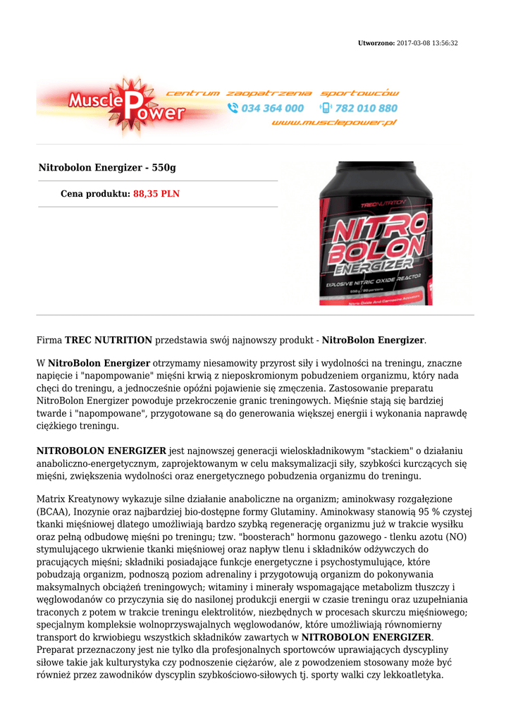Utworzono: 2017-03-08 13:56:32 Nitrobolon Energizer - 550g Cena produktu: 88,35 PLN Firma TREC NUTRITION przedstawia swój najnowszy produkt - NitroBolon Energizer. W NitroBolon Energizer otrzymamy niesamowity przyrost siły i wydolności na treningu, znaczne napięcie i "napompowanie" mięśni krwią z nieposkromionym pobudzeniem organizmu, który nada chęci do treningu, a jednocześnie opóźni pojawienie się zmęczenia. Zastosowanie preparatu NitroBolon Energizer powoduje przekroczenie granic treningowych. Mięśnie stają się bardziej twarde i "napompowane", przygotowane są do generowania większej energii i wykonania naprawdę ciężkiego treningu. NITROBOLON ENERGIZER jest najnowszej generacji wieloskładnikowym "stackiem" o działaniu anaboliczno-energetycznym, zaprojektowanym w celu maksymalizacji siły, szybkości kurczących się mięśni, zwiększenia wydolności oraz energetycznego pobudzenia organizmu do treningu. Matrix Kreatynowy wykazuje silne działanie anaboliczne na organizm; aminokwasy rozgałęzione (BCAA), Inozynie oraz najbardziej bio-dostępne formy Glutaminy. Aminokwasy stanowią 95 % czystej tkanki mięśniowej dlatego umożliwiają bardzo szybką regenerację organizmu już w trakcie wysiłku oraz pełną odbudowę mięśni po treningu; tzw. "boosterach" hormonu gazowego - tlenku azotu (NO) stymulującego ukrwienie tkanki mięśniowej oraz napływ tlenu i składników odżywczych do pracujących mięśni; składniki posiadające funkcje energetyczne i psychostymulujące, które pobudzają organizm, podnoszą poziom adrenaliny i przygotowują organizm do pokonywania maksymalnych obciążeń treningowych; witaminy i minerały wspomagające metabolizm tłuszczy i węglowodanów co przyczynia się do nasilonej produkcji energii w czasie treningu oraz uzupełniania traconych z potem w trakcie treningu elektrolitów, niezbędnych w procesach skurczu mięśniowego; specjalnym kompleksie wolnoprzyswajalnych węglowodanów, które umożliwiają równomierny transport do krwiobiegu wszystkich składników zawartych w NITROBOLON ENERGIZER. Preparat przeznaczony jest nie tylko dla profesjonalnych sportowców uprawiających dyscypliny siłowe takie jak kulturystyka czy podnoszenie ciężarów, ale z powodzeniem stosowany może być również przez zawodników dyscyplin szybkościowo-siłowych tj. sporty walki czy lekkoatletyka. NITROBOLON ENERGIZER dzięki zdolnościom zwiększeniu transportu tlenu i składników energetycznych do mięśni, zalecany jest również w wysiłkach długotrwałych np. w kolarstwie górskim, czy szosowym jako doskonałe "paliwo" dla ciężko pracujących mięśni. Uwaga! W czasie treningu siłowego może nastąpić waskularyzacja mięśni, czego efektem jest poprawienie zarysu żylnego oraz zwiększenie obwodu pracujących mięśni. Skład: Porcja: 28 g Porcji w opakoaniu: 19 Opakowanie: 550 g Wartość odżywcza w 1 porcji Izomaltuloza 7,33g Kompleks kreatyn 6,92g Monohydrat kreatyny Jabłczan kreatyny Etyl ester kreatyny Kre-alkalyn Kompleks wspomagający regenerację 5,81g L-leucyna L-izoleucyna L-walina Inozyna N-Acetyl-L-Glutamine L-glutamina Kompleks N.O. 3,05g AAKG Jabłczan argininy Jabłczan cytruliny Kompleks energetyzujący 2,09g Tauryna L-tyrozyna Kofeina bezwodna Inozytol Kompleks elektrolitów Sód 97,6mg Chlorek (jako chlorek sodu) 52,21mg Wapń 28,37mg Potas 22,7mg Magnez 11,78mg ALA 109,2mg Kompleks witamin Niacyna 10,9mg Kwas Pantotenowy 2,04mg Witamina B2 0,48mg Witamina B6 0,48mg Witamina B1 0,37mg Folian 68,1mcg Biotyna 17,02mcg Witamina B12 2,55mcg Witamina C 13,62mg Dawkowanie: Jedną porcję rozpuścić w 400 ml wody, używając do tego szejkera. W zależności od zapotrzebowania stosować 1–2 porcji dziennie. W dni treningowe: I porcja 30 min. przed treningiem, II porcja bezpośrednio po treningu. W dni nietreningowe: I porcja 30 min. przed pierwszym posiłkiem, II porcja 30 min. przed głównym posiłkiem. Uwaga! Produkt ma silne działanie pobudzające, nie stosować przed snem! Adres: http://www.muscle.trustnet.pl/ Ilość - Voucher - Telefon: 34 36 43 000, 782 010 880 Email: [email protected]