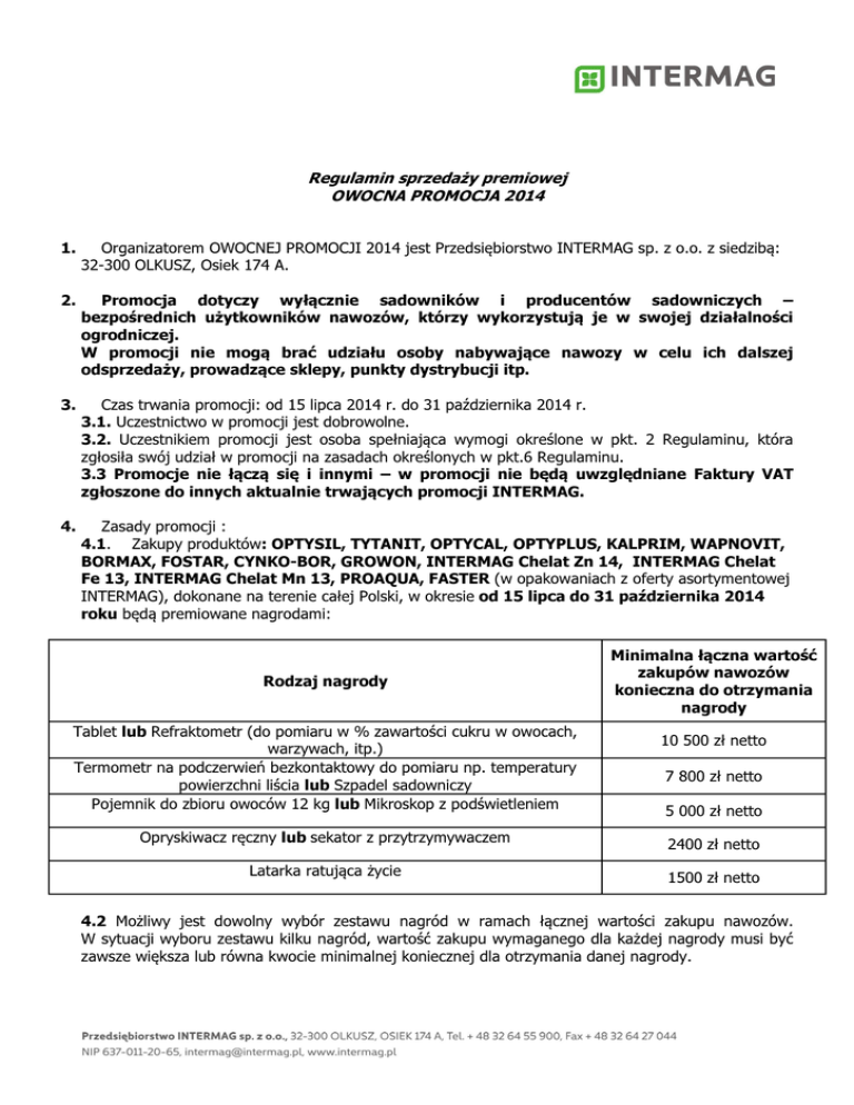 Regulamin sprzedaży premiowej OWOCNA PROMOCJA 2014 1. Organizatorem OWOCNEJ PROMOCJI 2014 jest Przedsiębiorstwo INTERMAG sp. z o.o. z siedzibą: 32-300 OLKUSZ, Osiek 174 A. 2. Promocja dotyczy wyłącznie sadowników i producentów sadowniczych – bezpośrednich użytkowników nawozów, którzy wykorzystują je w swojej działalności ogrodniczej. W promocji nie mogą brać udziału osoby nabywające nawozy w celu ich dalszej odsprzedaży, prowadzące sklepy, punkty dystrybucji itp. 3. Czas trwania promocji: od 15 lipca 2014 r. do 31 października 2014 r. 3.1. Uczestnictwo w promocji jest dobrowolne. 3.2. Uczestnikiem promocji jest osoba spełniająca wymogi określone w pkt. 2 Regulaminu, która zgłosiła swój udział w promocji na zasadach określonych w pkt.6 Regulaminu. 3.3 Promocje nie łączą się i innymi – w promocji nie będą uwzględniane Faktury VAT zgłoszone do innych aktualnie trwających promocji INTERMAG. 4. Zasady promocji : 4.1. Zakupy produktów: OPTYSIL, TYTANIT, OPTYCAL, OPTYPLUS, KALPRIM, WAPNOVIT, BORMAX, FOSTAR, CYNKO-BOR, GROWON, INTERMAG Chelat Zn 14, INTERMAG Chelat Fe 13, INTERMAG Chelat Mn 13, PROAQUA, FASTER (w opakowaniach z oferty asortymentowej INTERMAG), dokonane na terenie całej Polski, w okresie od 15 lipca do 31 października 2014 roku będą premiowane nagrodami: Rodzaj nagrody Tablet lub Refraktometr (do pomiaru w % zawartości cukru w owocach, warzywach, itp.) Termometr na podczerwień bezkontaktowy do pomiaru np. temperatury powierzchni liścia lub Szpadel sadowniczy Pojemnik do zbioru owoców 12 kg lub Mikroskop z podświetleniem Opryskiwacz ręczny lub sekator z przytrzymywaczem Latarka ratująca życie Minimalna łączna wartość zakupów nawozów konieczna do otrzymania nagrody 10 500 zł netto 7 800 zł netto 5 000 zł netto 2400 zł netto 1500 zł netto 4.2 Możliwy jest dowolny wybór zestawu nagród w ramach łącznej wartości zakupu nawozów. W sytuacji wyboru zestawu kilku nagród, wartość zakupu wymaganego dla każdej nagrody musi być zawsze większa lub równa kwocie minimalnej koniecznej dla otrzymania danej nagrody. Podane w materiałach informacyjno-reklamowych wzory nagród stanowią przykład. Ostatecznie dostarczone nagrody mogą różnić się wyglądem, kolorem itp., jednak nie wartością. 4.4 Uczestnicy Promocji, poprzez fakt przystąpienia do sprzedaży premiowej, wyrażają zgodę na wykorzystanie wyłącznie przez Organizatora ich danych osobowych dla potrzeb przeprowadzenia niniejszej promocji i w przyszłości do celów marketingowych, na warunkach określonych w ustawie z dn. 29.08.1997r o ochronie danych osobowych (tekst jednolity Dz.U. z 2002, Nr 101, poz.926). Administratorem tych danych w myśl w/w ustawy jest Organizator promocji. 5. Nagroda rzeczowa nie podlega zamianie na ekwiwalent pieniężny. 6. Realizacja promocji: 6.1 Zgłoszenia przystąpienia do promocji można dokonać na kilka sposobów: - wysyłając pocztą w zaadresowanej i opłaconej kopercie dostępnej w punkcie sprzedaży wypełniony kupon dostępny u sprzedawcy - wysyłając zgłoszenie na adres poczty internetowej [email protected] - poprzez formularz zgłoszeniowy znajdujący się na stronie www.intermag.pl 6.2 Wszystkie zgłoszenia należy przesłać najpóźniej do 15 listopada 2014 roku. 6.3 Zgłoszenie musi zawierać następujące informacje: - dane osobowe uczestnika promocji (imię i nazwisko, telefon kontaktowy oraz adres zamieszkania) - wnioskowaną nagrodę - kopię (skan) faktury lub następujące dane z faktur - numer dokumentu (faktury lub paragonu) potwierdzającego nabycie nawozu będącego przedmiotem promocji - datę i miejsce nabycia nawozu - ilość i wartość poszczególnych zakupionych produktów Wszystkie elementy zgłoszenia są niezbędne dla potwierdzenia uczestnictwa w promocji. Pominięcie choćby jednego punktu powoduje unieważnienie zgłoszenia. 6.4 Dowód zakupu należy zachować, będzie on służył do weryfikacji i potwierdzenia transakcji zakupu nawozu będącego przedmiotem promocji. 6.5 Przedsiębiorstwo INTERMAG zrealizuje wysyłkę premiowych nagród po zakończeniu OWOCNEJ PROMOCJI 2104, do końca grudnia 2014 r. 6.6 Organizator promocji nie ponosi odpowiedzialności za połączenia i funkcjonowanie usług telekomunikacyjnych, pocztowych i kurierskich, a także za nieprawidłowe lub zmienione dane adresowe przekazane przez Uczestnika promocji uniemożliwiające dostarczenie nagrody w tym w szczególności za: niedoręczenie, opóźnienie w doręczeniu, zniszczenie lub uszkodzenie zgłoszeń lub nagród, zmianę lub nieprawidłowo podany adres do korespondencji. Nieodebranie nagrody w ciągu 14 dni od powiadomienia oznacza rezygnację z nagrody. 7. Towar zakupiony w ramach OWOCNEJ PROMOCJI 2014 nie podlega zwrotowi. 8. Organizator oświadcza, że nagrody zostaną wydane Uczestnikom zgodnie z obowiązującymi przepisami prawa podatkowego. 9. Jeżeli jednorazowa wartość nagrody otrzymana przez osobę nie prowadzącą pozarolniczej działalności gospodarczej przekroczy 760 zł to zgodnie z art. 41 ust. 7 ustawy o PDOF Przedsiębiorstwo „INTERMAG” Sp. z o.o. zapłaci kwotę należnego 10% zryczałtowanego podatku od wartości nagrody. 10. Niniejsza promocja nie jest „grą losową”, „zakładem wzajemnym” ani „loterią promocyjną” , których wynik zależy od przypadku w rozumieniu art. 2 Ustawy z dn. 29.07.1992 o grach losowych i zakładach wzajemnych Dz.U. Nr 68, poz.341 z późn. zm. 11. Dodatkowych informacji udzielają pracownicy Działu Handlowego Przedsiębiorstwa INTERMAG. 12. Wszelkie treści zawarte w materiałach reklamowo-promocyjnych mają charakter jedynie informacyjny. Regulamin niniejszy jest jedynym dokumentem posiadającym moc prawną, określającym zasady sprzedaży premiowej OWOCNA PROMOCJA 2014. 13. Treść niniejszego regulaminu jest dostępna wszystkim potencjalnym Uczestnikom Promocji w Biurze Organizatora pod adresem podanym w punkcie 1 oraz na stronie i