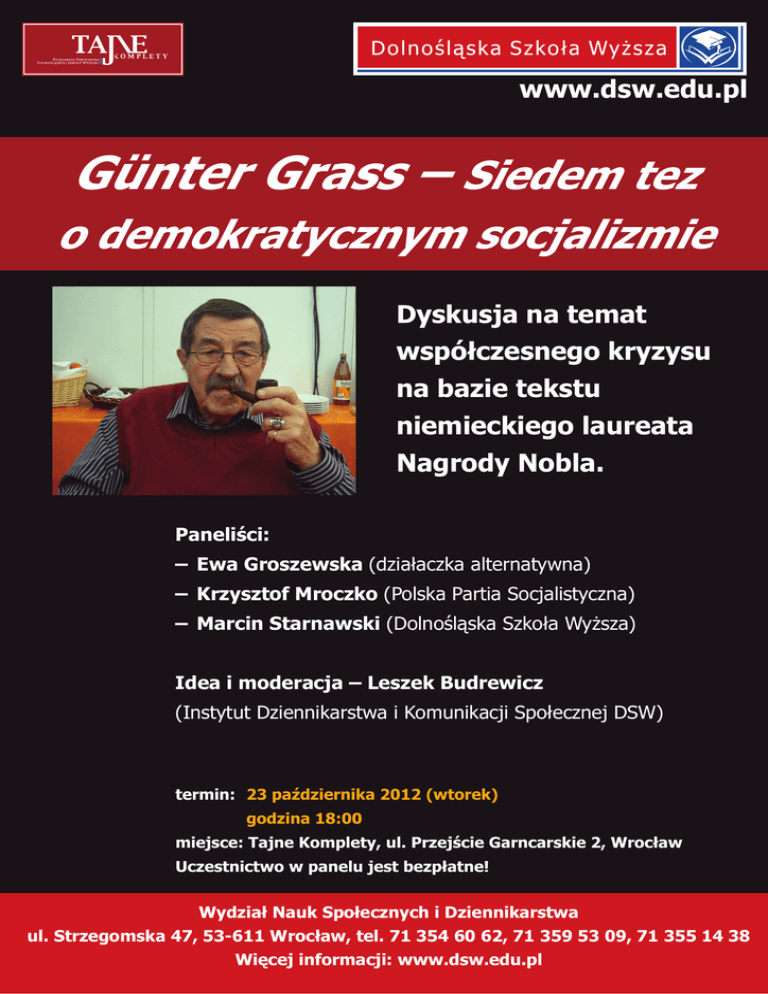 www.dsw.edu.pl Günter Grass – Siedem tez o demokratycznym socjalizmie Dyskusja na temat współczesnego kryzysu na bazie tekstu niemieckiego laureata Nagrody Nobla. Paneliści: – Ewa Groszewska (działaczka alternatywna) – Krzysztof Mroczko (Polska Partia Socjalistyczna) – Marcin Starnawski (Dolnośląska Szkoła Wyższa) Idea i moderacja – Leszek Budrewicz (Instytut Dziennikarstwa i Komunikacji Społecznej DSW) termin: 23 października 2012 (wtorek) godzina 18:00 miejsce: Tajne Komplety, ul. Przejście Garncarskie 2, Wrocław Uczestnictwo w panelu jest bezpłatne! Wydział Nauk Społecznych i Dziennikarstwa ul. Strzegomska 47, 53-611 Wrocław, tel. 71 354 60 62, 71 359 53 09, 71 355 14 38 Więcej informacji: www.dsw.edu.pl