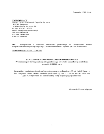 Sosnowiec 12.08.2014r. ZAMAWIAJĄCY Miejski Zakład Składowania Odpadów Sp. z o.o. 41 - 200 Sosnowiec ul. Grenadierów skr. poczt. 86 tel./fax: 32 - 263 - 47 -23 email: [email protected] NIP: 644-345-06-04 REGON: 241491646 KRS: 0000348788 Dot. Postępowania o udzielenie zamówienia publicznego na Ubezpieczenie mienia i odpowiedzialności cywilnej Miejskiego Zakładu Składowania Odpadów Sp. z o.o. w Sosnowcu. Nr referencyjny: MZSO.271.09.2014 ZAWIADOMIENIE O UNIEWAŻNIENIU POSTĘPOWANIA Prowadzonego w trybie przetargu nieograniczonego o wartości szacunkowej zamówienia powyżej 30 000,00 euro Zamawiający zawiadamia, że unieważnia postępowanie na podstawie art. 93 ust. 1 pkt 1 Ustawy z dnia 29 stycznia 2004 r. – Prawo zamówień publicznych (t.j.: Dz. U. z 2013 r. poz. 907 późn. zm), gdyż w postępowaniu nie złożono żadnej oferty niepodlegającej odrzuceniu. Kierownik Zamawiającego 1 Sosnowiec, dnia 21.07.2014r. ZAŁĄCZNIK NR 1 do SIWZ INFORMACJE O ZAMAWIAJĄCYM ORAZ OPIS PRZEDMIOTU ZAMÓWIENIA Miejski Zakład Składowania Odpadów Sp. z o.o. 41 - 200 Sosnowiec ul. Grenadierów skr. poczt. 86 tel./fax: 32 - 263 - 47 -23 email: [email protected] NIP: 644-345-06-04 REGON: 241491646 KRS: 0000348788 Zrealizowany obrót w 2013r. 6 000 000,00 zł Ilość zatrudnionych pracowników: 69, w tym: - administracja: 14 - pracownicy techniczni: 55 Rodzaj prowadzonej działalności, która powinna zostać objęta ochroną w ramach ubezpieczenia odpowiedzialności cywilnej: Nr PKD OPIS 38, 11, Z ZBIERANIE ODPADÓW INNYCH NIZ NIEBEZPIECZNE 38, 12, Z ZBIERANIE ODPADÓW NIEBEZPIECZNYCH 38, 21, Z OBRÓBKA I USUWANIE ODPADÓW INNYCH NIZ NIEBEZPIECZNE 38, 32, Z ODZYSK SUROWCÓW Z MATERIAŁÓW SEGREGOWANYCH 46, 77, Z SPRZEDAZ HURTOWA ODPADÓW I ZŁOMU 38, 31, Z DEMONTAZ WYROBÓW ZUZYTYCH 39, 00, Z DZIAŁALNOSC ZWIAZANA Z REKULTYWACJA I POZOSTAŁA DZIAŁALNOSC USŁUGOWA ZWIAZANA Z GOSPODARKĄ ODPADAMI 85, 59, B POZOSTAŁE POZASZKOLNE FORMY EDUKACJI, GDZIE INDZIEJ NIESKLASYFIKOWANE 38, 22, Z PRZETWARZANIE I UNIESZKODLIWIANIE ODPADÓW NIEBEZPIECZNYCH 71, 20, B POZOSTAŁE BADANIA I ANALIZY TECHNICZNE 2 35, 21, Z WYTWARZANIE PALIW GAZOWYCH 35, 22, Z DYSTRYBUCJA PALIW GAZOWYCH W SYSTEMIE SIECIOWYM 35, 23, Z HANDEL PALIWAMI GAZOWYMI W SYSTEMIE SIECIOWYM 37, 00, Z ODPROWADZANIE I OCZYSZCZANIE SCIEKÓW UWAGA W dniu ogłaszania postępowania w sprawie zamówienia publicznego, trwa budowa Zakładu Przetwarzania i Unieszkodliwiania Odpadów Komunalnych w Sosnowcu. Termin zakończenia budowy przewidziany jest na sierpień 2014r. SZKODOWOŚC ZA OSTATNIE 3 LATA W ciągu ostatnich 3 lat brak szkód w zakresie ryzyk majątkowych, OC działalności lub komunikacyjnych. Budynek Administracyjny: konstrukcja żelbetowa, dach drewniany pokryty blachą, ścianki nośne murowane z bloczków betonowych, a działowe z płyty karton – gips. Konstrukcja budynków Budynek socjalny: konstrukcja nośna w technologii żelbetowoszkieletowej, dach żelbetowy ściany z bloczków betonowy na piętrze ściany konstrukcja karton – gips. Hala sortowni: konstrukcja żelbetowo stalowa, ściany i dach wykonane w technologii płyty warstwowej (blacha - pianka - blacha). Pozostałe budynki konstrukcja żelbetowa kryta blachą. Zabezpieczenia przeciwpożarowe System sygnalizacji pożarowej Urządzenia oddymiające Hydranty zewnętrzne DN 100 – 7 szt. Hydranty wewnętrzne 52 – 4 szt. Hydranty wewnętrzne 25 – 4 szt. Gaśnice GP6 ABC – 14 szt. Gaśnica śniegowa GS5 – 1 szt. Odległość od straży pożarnej: 2 km Zabezpieczenia przeciwkradzieżowe Własny dozór całodobowy, teren ogrodzony Pozostałe informacje W ciągu ostatnich 20 lat teren nie był objęty powodzią. Odległość od rzeki: 1 km 3 Szczegółowe dane dotyczące usytuowania budynków i zabezpieczeń zawarte są w Załączniku nr 1a). ZAŁOŻENIA DO POSZCZEGÓLNYCH RODZAJÓW UBEZPIECZENIA Zadanie nr 1 a) ubezpieczenie od ognia i innych zdarzeń losowych Wymagany zakres ubezpieczenia: Pełny obejmujący: szkody powstałe wskutek ognia, pożaru, uderzenia pioruna, wybuchu, eksplozji, upadku statku powietrznego akcji ratowniczej prowadzonej w związku ze zdarzeniami wymienionymi powyżej, oraz huraganu, powodzi, zalania*, gradu, deszczu nawalnego, śniegu, osunięcia się ziemi, działanie ciężaru śniegu, zapadania się ziemi, lawiny, trzęsienia ziemi, dymu i sadzy, huku ponaddźwiękowego, uderzenia pojazdu niezależnie od tego czy pojazd jest własnością ubezpieczającego czy nie, następstwa szkód wodociągowych, dewastację/wandalizm** oraz przepięcia***, katastrofę budowlaną. Zakres ubezpieczenia obejmuje także poniesione przez Ubezpieczającego koszty zabezpieczenia przed szkodą lub zmniejszenia rozmiaru szkody w ubezpieczonym mieniu . *Definicja zalania – niezamierzone i niekontrolowane wydobywanie się wody, pary lub innych cieczy z urządzeń wodociągowych, kanalizacyjnych, centralnego ogrzewania lub innych przewodów i urządzeń technologicznych, wskutek: awarii instalacji lub działania niskich temperatur; samoistnego rozszczelnienia się zbiorników; cofnięcia się ścieków z sieci kanalizacyjnej; samoczynnego uruchomienia się wodnych instalacji gaśniczych z przyczyn innych niż pożar; nieumyślnego pozostawienia otwartych zaworów w sieci wodociągowej; nieumyślnego działania osób trzecich. Ponadto za zalanie uważa się uszkodzenie ubezpieczanego mienia wodą pochodzącą z opadów atmosferycznych w tym topniejący śnieg. **Definicja dewastacji/wandalizmu - Z zachowaniem pozostałych nie zmienionych niniejszą klauzulą postanowień ogólnych warunków ubezpieczenia i innych postanowień umowy ubezpieczenia, ustala się, że Zakład Ubezpieczeń obejmuje ochroną ubezpieczeniową szkody powstałe wskutek dewastacji/wandalizmu, za które uważa się rozmyślne zniszczenie lub uszkodzenie ubezpieczonego mienia, spowodowane przez osoby trzecie. Ochrona ubezpieczeniowa nie dotyczy obiektów opuszczonych i niewykorzystywanych p