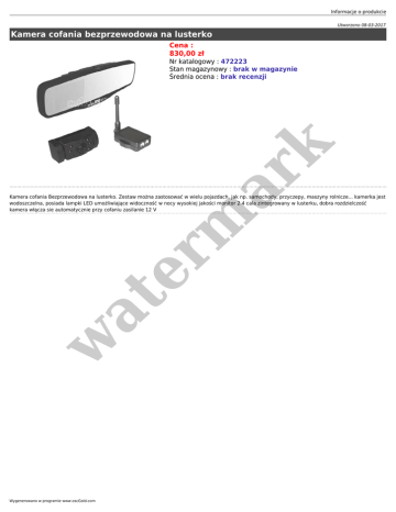 Informacje o produkcie Utworzono 08-03-2017 Kamera cofania bezprzewodowa na lusterko Cena : 830,00 zł er m ar k Nr katalogowy : 472223 Stan magazynowy : brak w magazynie Średnia ocena : brak recenzji w at Kamera cofania Bezprzewodowa na lusterko. Zestaw można zastosować w wielu pojazdach, jak np. samochody, przyczepy, maszyny rolnicze... kamerka jest wodoszczelna, posiada lampki LED umożliwiające widoczność w nocy wysokiej jakości monitor 2.4 cala zintegrowany w lusterku, dobra rozdzielczość kamera włącza sie automatycznie przy cofaniu zasilanie 12 V Wygenerowano w programie www.oscGold.com