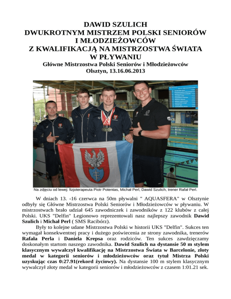 DAWID SZULICH DWUKROTNYM MISTRZEM POLSKI SENIORÓW I MŁODZIEŻOWCÓW Z KWALIFIKACJĄ NA MISTRZOSTWA ŚWIATA W PŁYWANIU Główne Mistrzostwa Polski Seniorów i Młodzieżowców Olsztyn, 13.16.06.2013 Na zdjęciu od lewej: fizjoterapeuta Piotr Potentas, Michał Perl, Dawid Szulich, trener Rafał Perl. W dniach 13. -16 czerwca na 50m pływalni " AQUASFERA" w Olsztynie odbyły się Główne Mistrzostwa Polski Seniorów i Młodzieżowców w pływaniu. W mistrzostwach brało udział 645 zawodniczek i zawodników z 122 klubów z całej Polski. UKS "Delfin" Legionowo reprezentowali nasz najlepszy zawodnik Dawid Szulich i Michał Perl ( SMS Racibórz). Były to kolejne udane Mistrzostwa Polski w historii UKS "Delfin". Sukces ten wymagał konsekwentnej pracy i dużego poświecenia ze strony zawodnika, trenerów Rafała Perla i Daniela Krepsa oraz rodziców. Ten sukces zawdzięczamy doskonałym startom naszego zawodnika. Dawid Szulich na dystansie 50 m stylem klasycznym wywalczył kwalifikację na Mistrzostwa Świata w Barcelonie, złoty medal w kategorii seniorów i młodzieżowców oraz tytuł Mistrza Polski uzyskując czas 0:27.91(rekord życiowy). Na dystansie 100 m stylem klasycznym wywalczył złoty medal w kategorii seniorów i młodzieżowców z czasem 1:01.21 sek. Dla samego zawodnika są to kolejne udane mistrzostwa w jego karierze sportowej ze względu na kwalifikację na Mistrzostwa Świata w Barcelonie oraz zdobycie 4 złotych medali Mistrzostw Polski Seniorów i Młodzieżowców. Dawid o zawodach: „Bardzo udane Mistrzostwa Polski. Dwa starty i dwa zwycięstwa oraz kwalifikacja na Mistrzostwa Świata. Lekki niedosyt po wyścigu na 50 metrów, ponieważ do rekordu Polski zabrakło 0,05 sekundy. Liczę jednak, że za półtora miesiąca uda się go poprawić. Przede mną dwa dni wytchnienia od pływania i treningu a potem wracam wraz z trenerem Rafałem z powrotem do ciężkich treningów.” Drugi nasz zawodnik Michał Perl na 50 metrów w stylu klasycznym - 30. miejsce uzyskując czas 30,40 sekundy (rekord życiowy). A na 100 metrów stylem klasycznym Michał był 41. zawodnikiem uzyskując czas 1:07,90 (rekord życiowy). Michał startował również na 200 metrów stylem klasycznym i zajął 53. miejsce uzyskując czas 2:35,15 sekundy. Był to debiut Michała na Głównych Mistrzostw Polski Seniorów i Młodzieżowców. W klasyfikacji medalowej Głównych Mistrzostw Polski Seniorów i Młodzieżowców wysokie 10 miejsce dla UKS "Delfin" Legionowo. Mistrzostwa nie byłyby tak udane gdyby nie pomoc naszego wspaniałego fizjoterapeuty Piotra Potentasa. Dziękujemy!!! Gorące podziękowania dla wszystkich współtwórców i ojców tego sukcesu UKS Delfin Legionowo m.in. : Urzędu Miasta Legionowo, grupy sponsorskiej „Szulich Team”, Fundacji „Legionowo dla Ciebie” ,Firmy Info-System Romana Groszka, Adama Wilczęgi, Krzysztofa Soszyńskiego, Włodzimierza Stańczaka, Tamary Bieńkowskiej, dyrekcji ZSO nr 2 i pływalni przy ZSO nr 2 w Legionowie, Klubu Perła Wellness w Michałowie Reginowie i wielu innych. /rp/, /tk/