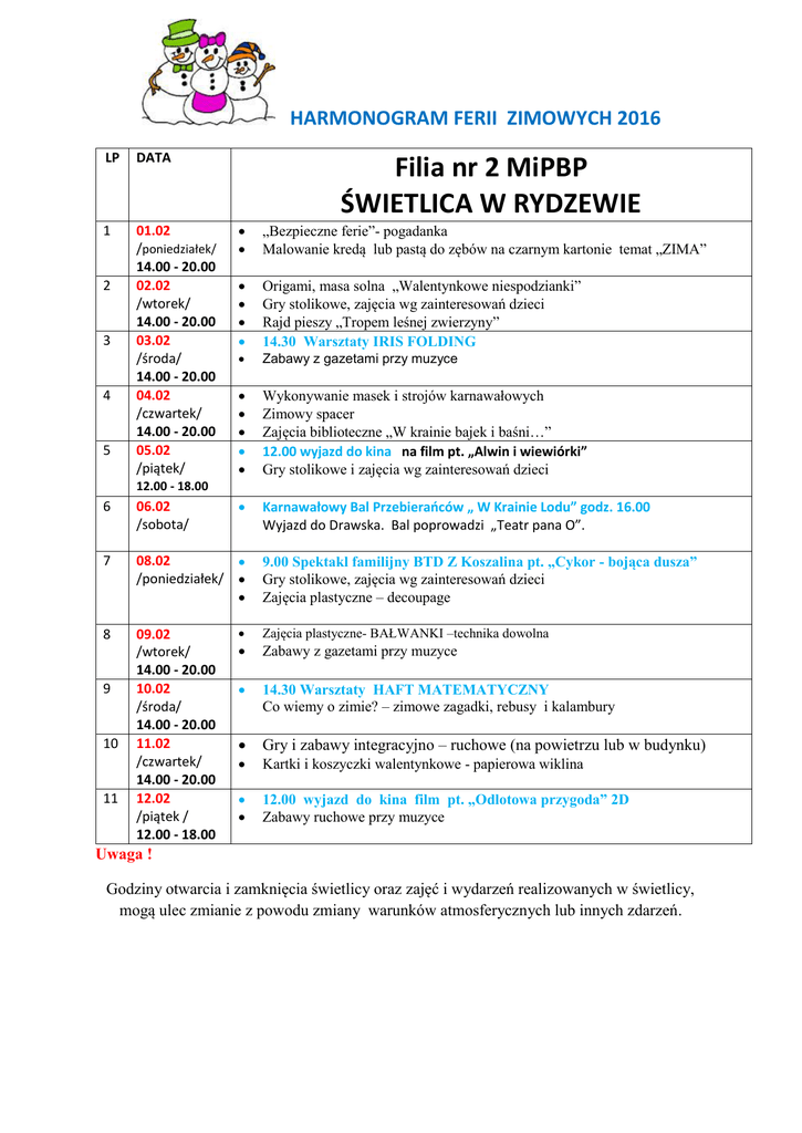 HARMONOGRAM FERII ZIMOWYCH 2016 LP DATA 1 01.02 /poniedziałek/ 14.00 - 20.00 02.02 /wtorek/ 14.00 - 20.00 03.02 /środa/ 14.00 - 20.00 04.02 /czwartek/ 14.00 - 20.00 05.02 /piątek/ 2 3 4 5 Filia nr 2 MiPBP ŚWIETLICA W RYDZEWIE „Bezpieczne ferie”- pogadanka Malowanie kredą lub pastą do zębów na czarnym kartonie temat „ZIMA” Origami, masa solna „Walentynkowe niespodzianki” Gry stolikowe, zajęcia wg zainteresowań dzieci Rajd pieszy „Tropem leśnej zwierzyny” 14.30 Warsztaty IRIS FOLDING Zabawy z gazetami przy muzyce Wykonywanie masek i strojów karnawałowych Zimowy spacer Zajęcia biblioteczne „W krainie bajek i baśni…” 12.00 wyjazd do kina na film pt. „Alwin i wiewiórki” Gry stolikowe i zajęcia wg zainteresowań dzieci Karnawałowy Bal Przebierańców „ W Krainie Lodu” godz. 16.00 Wyjazd do Drawska. Bal poprowadzi „Teatr pana O”. 12.00 - 18.00 6 06.02 /sobota/ 7 08.02 /poniedziałek/ 8 09.02 /wtorek/ 14.00 - 20.00 10.02 /środa/ 14.00 - 20.00 11.02 /czwartek/ 14.00 - 20.00 12.02 /piątek / 12.00 - 18.00 9 10 11 9.00 Spektakl familijny BTD Z Koszalina pt. „Cykor - bojąca dusza” Gry stolikowe, zajęcia wg zainteresowań dzieci Zajęcia plastyczne – decoupage Zajęcia plastyczne- BAŁWANKI –technika dowolna Zabawy z gazetami przy muzyce 14.30 Warsztaty HAFT MATEMATYCZNY Co wiemy o zimie? – zimowe zagadki, rebusy i kalambury Gry i zabawy integracyjno – ruchowe (na powietrzu lub w budynku) Kartki i koszyczki walentynkowe - papierowa wiklina 12.00 wyjazd do kina film pt. „Odlotowa przygoda” 2D Zabawy ruchowe przy muzyce Uwaga ! Godziny otwarcia i zamknięcia świetlicy oraz zajęć i wydarzeń realizowanych w świetlicy, mogą ulec zmianie z powodu zmiany warunków atmosferycznych lub innych zdarzeń.