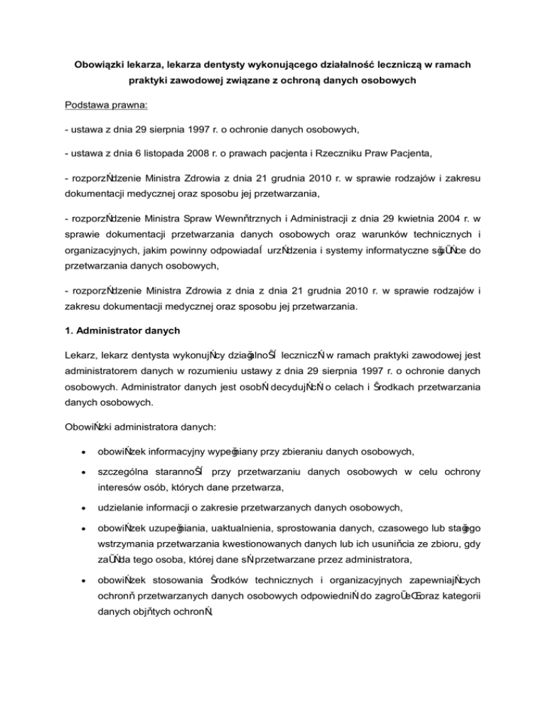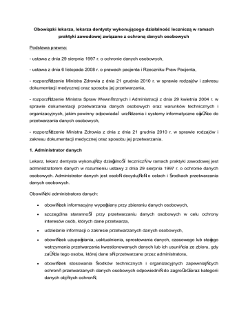 Obowiązki lekarza, lekarza dentysty wykonującego działalność leczniczą w ramach praktyki zawodowej związane z ochroną danych osobowych Podstawa prawna: - ustawa z dnia 29 sierpnia 1997 r. o ochronie danych osobowych, - ustawa z dnia 6 listopada 2008 r. o prawach pacjenta i Rzeczniku Praw Pacjenta, - rozporządzenie Ministra Zdrowia z dnia 21 grudnia 2010 r. w sprawie rodzajów i zakresu dokumentacji medycznej oraz sposobu jej przetwarzania, - rozporządzenie Ministra Spraw Wewnętrznych i Administracji z dnia 29 kwietnia 2004 r. w sprawie dokumentacji przetwarzania danych osobowych oraz warunków technicznych i organizacyjnych, jakim powinny odpowiadać urządzenia i systemy informatyczne służące do przetwarzania danych osobowych, - rozporządzenie Ministra Zdrowia z dnia z dnia 21 grudnia 2010 r. w sprawie rodzajów i zakresu dokumentacji medycznej oraz sposobu jej przetwarzania. 1. Administrator danych Lekarz, lekarz dentysta wykonujący działalność leczniczą w ramach praktyki zawodowej jest administratorem danych w rozumieniu ustawy z dnia 29 sierpnia 1997 r. o ochronie danych osobowych. Administrator danych jest osobą decydującą o celach i środkach przetwarzania danych osobowych. Obowiązki administratora danych: · obowiązek informacyjny wypełniany przy zbieraniu danych osobowych, · szczególna staranność przy przetwarzaniu danych osobowych w celu ochrony interesów osób, których dane przetwarza, · udzielanie informacji o zakresie przetwarzanych danych osobowych, · obowiązek uzupełniania, uaktualnienia, sprostowania danych, czasowego lub stałego wstrzymania przetwarzania kwestionowanych danych lub ich usunięcia ze zbioru, gdy zażąda tego osoba, której dane są przetwarzane przez administratora, · obowiązek stosowania środków technicznych i organizacyjnych zapewniających ochronę przetwarzanych danych osobowych odpowiednią do zagrożeń oraz kategorii danych objętych ochroną, · kontrola, jakie dane, kiedy i przez kogo zostały wprowadzone do zbioru i komu są przekazywane, · prowadzenie ewidencji osób upoważnionych do przetwarzania danych osobowych, · zgłaszanie zbioru do rejestracji Generalnemu Inspektorowi Ochrony Danych Osobowych w przypadkach przewidzianych prawem (nie dotyczy zbiorów danych będących dokumentacją medyczną). 2. Gromadzenie i przetwarzanie danych w ramach prowadzenia dokumentacji medycznej Jedną z form przetwarzania danych osobowych jest prowadzenie dokumentacji medycznej. Podmioty wykonujące działalność leczniczą są obowiązane prowadzić dokumentację medyczną osób korzystających ze świadczeń zdrowotnych na zasadach określonych w ustawie o prawach pacjenta i Rzeczniku Praw Pacjenta (Dz. U. z 2009 r. Nr 52, poz. 417 z późn. zm.). Podmioty wykonujące działalność leczniczą zapewniają ochronę danych zawartych w tej dokumentacji. Dokumentacja medyczna zawiera zatem dane osobowe pacjenta, w tym dane o jego stanie zdrowia, które podlegają szczególnej ochronie prawnej. Przetwarzanie tych danych, w tym także ich udostępnianie, może mieć miejsce albo tylko za zgodą osoby, której dotyczą albo w przypadkach wymienionych w art. 26 ustawy prawach pacjenta i Rzeczniku Praw Pacjenta, który wymienia przypadki zgodnego z prawem przekazania informacji objętych tą dokumentacją. Uwaga 1) zbiór danych osobowych gromadzony w ramach dokumentacji medycznej nie podlega zgłoszeniu do rejestracji Generalnemu Inspektorowi Ochrony Danych Osobowych; 2) nie ma obowiązku uzyskiwania zgody pacjenta na przetwarzanie danych osobowych zawartych w dokumentacji medycznej w celach świadczenia usług medycznych; 3) przetwarzanie ww. danych w innym celu wymaga zgody pacjenta. 3. Sposób zabezpieczenia danych osobowych przez lekarza, lekarza dentystę wykonującego praktykę zawodową. Lekarz, lekarz dentysta jako administrator danych osobowych ma obowiązek zastosowania środków technicznych i organizacyjnych zapewniających ochronę przetwarzanych danych osobowych odpowiednią do zagrożeń oraz kategorii danych objętych ochroną, a w szczególności obowiązek zabezpieczenia danych przed ich udostępnieniem osobom nieupoważnionym, zabraniem przez osobę nieuprawnioną, przetwarzaniem z naruszeniem ustawy oraz zmianą, utratą, uszkodzeniem lub zniszczeniem. Administrator danych został zobowiązany do prowadzenia dokumentacji opisującej sposób przetwarzania danych oraz środki, o których mowa powyżej, a także do wyznaczenia administratora bezpieczeństwa informacji, nadzorującego przestrzeganie zasad ochrony, jeżeli sam nie wykonuje tych czynności. Ww. obowiązek obejmuje: · poinformowanie pacjentów o nazwie praktyki lekarskiej, jej adresie, celu zbierania danych osobowych, prawie dostępu do treści swoich danych, · wdrożenie polityki bezpieczeństwa, · wdrożenie instrukcji zarządzania systemem informatycznym ( jeśli taki jest), który służy przetwarzaniu danych pacjentów, · wdrożenie środków technicznych i organizacyjnych – mających na celu realizację powyższych punktów, · w przypadku zatrudniania personelu pomocniczego, przygotowanie imiennych upoważnień dostępu do danych osobowych z określeniem zakresu dostępu, jak również ewidencji osób upoważnionych. Przy konstruowaniu dokumentu, polityki bezpieczeństwa należy uwzględnić w szczególności następujące elementy : · wykaz budynków i pomieszczeń gdzie dane osobowe są przetwarzane, · wykaz zbiorów danych osobowych, wraz ze wskazaniem narzędzi informatycznych używanych do zarządzania zbiorami, · opis struktury danych dokumentacji medycznej, który określa jakie pola informacyjne wypełnia pacjent. Jeśli dodatkowo lekarz w gabinecie prowadzi dokumentację medyczną pacjenta w formie elektronicznej powstaje konieczność przygotowania instrukcji przetwarzania danych: Przy redagowaniu takiej instrukcji należy uwzględnić w szczególności następujące elementy: · procedury nadawania uprawnień do prz