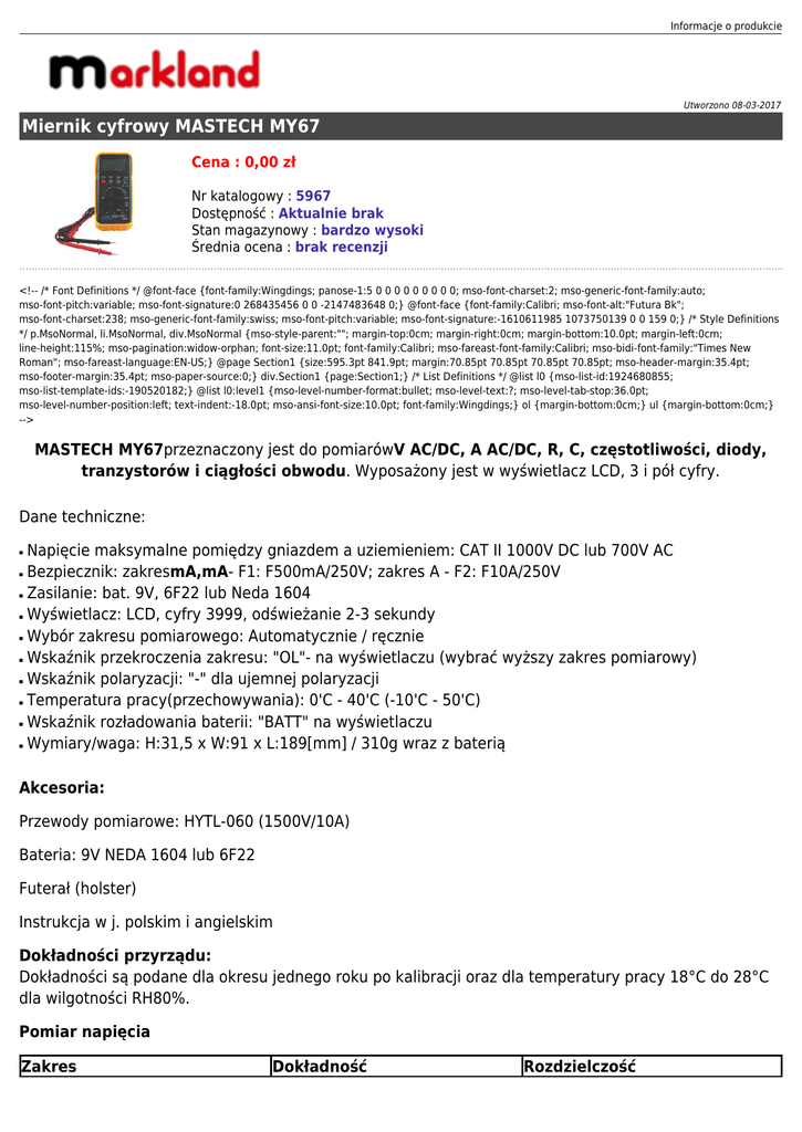 MASTECH MY67przeznaczony jest do pomiarówV AC/DC, A AC/DC, R, C, częstotliwości, diody,