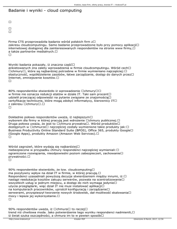 Kraków, baza firm, oferty pracy, branża IT :: KrakowIT.pl Badanie i wyniki - cloud computing Firma CTS przeprowadziła badanie wśród polskich firm z zakresu cloudcomputingu. Samo badanie przeprowadzone było przy pomocy aplikacji internetowej dostępnej dla zainteresowanych respondentów na stronie www firmy, a także partnerów medialnych. Wyniki badania pokazały, iż znaczna część ankietowanych zna zalety wprowadzenia w firmie cloudcomputingu. Wśród cech chmury, które są najbardziej potrzebne w firmie wymieniano najczęściej: elastyczność, współdzielenie zasobów, łatwe zarządzanie, dostęp do danych przez Internet, zmniejszenie kosztów. 80% respondentów stwierdziło iż wprowadzenie chmury w firmie nie oznacza redukcji etatów w dziale IT. Taki sam procent udzielił przeczącej odpowiedzi na pytanie związane ze znajomością certyfikacje techniczne, które mogą zdobyć informatycy, kierownicy IT z zakresu chmury. Dokładnie połowa respondentów uważa, iż najlepszym wyborem dla firmy w której pracują jest wdrożenie chmury publicznej. Druga połowa uważa, że jest to chmura prywatna. Wśród produktów dostępnych w chmurze najczęściej zostały wymienione takie produkty jak: Business Productivity Online Standard Suite (BPOS), Office 365, produkty Google (Google Apps), produkty Amazon (Amazon Web Services). Wśród zagrożeń, które wydają się najbardziej niebezpieczne w przypadku chmury respondenci najczęściej wymieniali: ograniczone rozwiązania, nieodpowiedni poziom zabezpieczeń, zachowanie prywatności. 90% respondentów stwierdziło, że tzw. cloudcomputing ma pozytywny wpływ na dział IT w firmie, w której pracują. Respondenci uzasadniali powyższą decyzje stwierdzeniem między innymi, iż: nastąpi reedukacja kosztów zakupu serwerów, pozwala na scentralizowanie wszystkich usług w jednym miejscu, a dostęp do nich wymaga jedynie użycia przeglądarki, więc dział IT nie musi instalować aplikacji na komputerach pracowników, uprościł konfigurację i zarządzanie serwerami, przyspieszył tworzenie nowych środowisk, dał możliwość skalowania mocy i lepsze jej wykorzystanie. 90% respondentów uważa, iż chmura to raczej trend niż chwilowa moda. Jako potwierdzenie tego wyniku respondenci nadmienili, iż świat szuka oszczędności, a chmura im to w pewien sposób http://www.krakowit.pl Kreator PDF Utworzono 8 March, 2017, 12:56 Kraków, baza firm, oferty pracy, branża IT :: KrakowIT.pl zapewnia, poza tym rozwój Internetu i komunikacji zapewnia dostęp z każdego miejsca do zasobów w chmurze. Duża ilość producentów rozwija produkty w tym kierunku (Intel, Microsoft). Eliminują ograniczenia, zwiększają możliwości, wydajność, dostępność. Chmura staje się wygodniejsza w zarządzaniu. Na pytanie dotyczące tego, czy każda firma, instytucja może korzystać z rozwiązań pracujących w chmurze i czy są jakieś sektory gospodarki, w których cloudcomputing nie powinien być wykorzystywany respondenci wymienili między innymi: tam, gdzie połączenie internetowe jest niestałe, gdzie mogą występować przerwy w połączeniu, a od których może zależeć czyjeś zdrowie (np. ratownictwo), w sektorze publicznym czyli między innymi systemach obronnych, sterowania elektrownią jądrową, administracji publicznej. 40% respondentów nie zna żadnych aktów prawnych regulujących kwestie poszanowania prywatności przez firmy oferujące pracę w chmurze. Przetwarzanie w chmurze jest dopuszczalne prawnie, ale w kwestii zapewnienia poufności danych reguluje to ustawa o ochronie danych osobowych, niestety nie jest ona bezpośrednio związana z informacjami dotyczącymi chmury. Firma CTS Customized Training Solutions od przeszło 20 lat prowadzi wysokospecjalistyczne szkolenia dla osób w branży IT. W CTS uczymy nie tylko technicznych umiejętności przydatnych w pracy programisty, administratora czy specjalisty IT, ale także rozwijamy umiejętności analizowania, kreatywności, samodzielności, dociekliwości, zaangażowania tak bardzo cenionych w dzisiejszych czasach. Oferujemy szkolenia dla różnych grup zawodowych pracujących w branży IT. Nasza oferta obejmuje szkolenia na różnych poziomach począwszy od podstawowego do zaawansowanego. Oferujemy szkolenia zarówno autoryzowane jak i autorskie. Oferta szkoleniowa w zakresie specjalności informatycznych podzielona została na następujące obszary: Masz pytania skontaktuj się z nami: CTS Customized Training Solutions Sp z o.o. http://www.krakowit.pl Kreator PDF Utworzono 8 March, 2017, 12:56 Kraków, baza firm, oferty pracy, branża IT :: KrakowIT.pl ul. Filipinki 20 02-207 Warszawa tel./fax: +48 12 655 17 36 www.cts.com.pl [email protected] http://www.krakowit.pl Kreator PDF Utworzono 8 March, 2017, 12:56