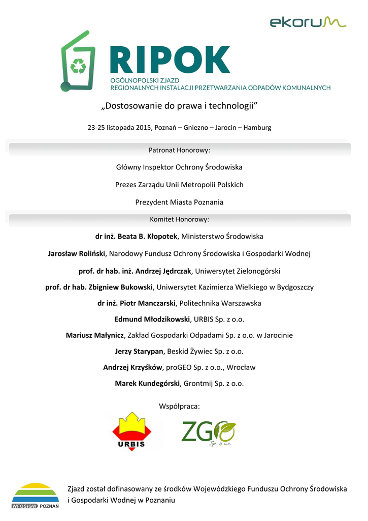 „Dostosowanie do prawa i technologii” 23-25 listopada 2015, Poznań – Gniezno – Jarocin – Hamburg Patronat Honorowy: Główny Inspektor Ochrony Środowiska Prezes Zarządu Unii Metropolii Polskich Prezydent Miasta Poznania Komitet Honorowy: dr inż. Beata B. Kłopotek, Ministerstwo Środowiska Jarosław Roliński, Narodowy Fundusz Ochrony Środowiska i Gospodarki Wodnej prof. dr hab. inż. Andrzej Jędrczak, Uniwersytet Zielonogórski prof. dr hab. Zbigniew Bukowski, Uniwersytet Kazimierza Wielkiego w Bydgoszczy dr inż. Piotr Manczarski, Politechnika Warszawska Edmund Młodzikowski, URBIS Sp. z o.o. Mariusz Małynicz, Zakład Gospodarki Odpadami Sp. z o.o. w Jarocinie Jerzy Starypan, Beskid Żywiec Sp. z o.o. Andrzej Krzyśków, proGEO Sp. z o.o., Wrocław Marek Kundegórski, Grontmij Sp. z o.o. Współpraca: Zjazd został dofinasowany ze środków Wojewódzkiego Funduszu Ochrony Środowiska i Gospodarki Wodnej w Poznaniu PROGRAM* 23 LISTOPADA 2015 10:00 Otwarcie Zjazdu 10:15 Gospodarka odpadami komunalnymi w świetle aktualizacji dr inż. Beata B. Kłopotek krajowego planu gospodarki odpadami Ministerstwo Środowiska Finansowanie zadań w gospodarce odpadami, Jarosław Roliński przewidywane środki oraz termin ich uruchomienia NFOŚiGW Projekt rozporządzenia w sprawie szczegółowych zasad Maciej Kiełbus selektywnej zbiórki – ujednolicenie zasad w skali całego Dr Krystian Ziemski & Partners Kancelaria kraju Prawna Sp. K. Studium panelowe – aktualizacja wpgo oraz rozporządzenia mbp – konsekwencje dla funkcjonowania zakładów oraz regionów gospodarki odpadami Prowadzenie dyskusji: dr inż. Piotr Manczarski, Politechnika Warszawska, Jerzy Starypan, Beskid Żywiec Zaproszeni paneliści: Marek Kundegórski, Grontmij Sp. z o.o., dr inż. Paweł Szyszkowski, Uniwersytet Przyrodniczy we Wrocławiu 10:35 10:50 11:10 11:50 Przerwa na kawę 12:20 Obowiązki RIPOK wynikające z aktów prawnych: projekt nowelizacji rozporządzenia mbp; rozporządzenie dotyczące frakcji wysokokalorycznej; aktualizacja WPGO 12:40 13:00 wystąpienie promocyjne Zagospodarowanie produktów po procesie mbp prof. dr hab. inż. Andrzej Jędrczak Uniwersytet Zielonogórski wystąpienie promocyjne BAT a projekt rozporządzenia mbp, czy obydwa dokumenty dr inż. Piotr Manczarski będą współgrały Politechnika Warszawska Przyszłość odpadów po 1 stycznia 2016 roku, gdzie i jak Marek Kundegórski zagospodarować kaloryczny balast Grontmij Sp. z o.o. wystąpienie promocyjne Innowacyjność w RIPOK – nowy trend? Czy warto Tomasz Styś inwestować? Instytut Sobieskiego Studium panelowe – najlepsze dostępne technologie, cena i efektywność, w co inwestować? Co ze składowaniem frakcji kalorycznej po 1 stycznia 2016 roku? Prowadzenie dyskusji: prof. dr hab. inż. Andrzej Jędrczak, Uniwersytet Zielonogórski; Zaproszeni paneliści: Adam Jurkiewicz, Sutco Polska Sp. z o.o., Mariusz Rajca, Tomra Sorting Solutions, Łukasz Kubisz, AK Nova Sp. z o.o. 13:20 13:40 14:00 14:20 14:35 14:50 15:30 Obiad 16:30 Dostosowanie zakładu do aktualnego prawa w tym: wytycznych rozporządzenia mbp składowanie odpadów po mbp od 1 stycznia 2016 r. 16:50 17:05 17:25 17:40 Ilość odpadów komunalnych w Polsce a realne moce przerobowe istniejących i planowanych instalacji Współistnienie spalarni oraz innych RIPOK w regionie Instalacja mbp z modułem fermentacji frakcji podsitowej prof. dr hab. Zbigniew Bukowski Uniwersytet Kazimierza Wielkiego w Bydgoszczy Andrzej Krzyśków proGEO Sp. z o.o., Wrocław wystąpienie promocyjne dr inż. Paweł Szyszkowski Uniwersytet Przyrodniczy we Wrocławiu wystąpienie promocyjne Jarosław Warczygłowa Zakład Gospodarki Odpadami Sp. z o.o. w Jarocinie 18:00 18:10 20:302:00 Pytania i dyskusja, podsumowanie obrad ZAKOŃCZENIE I DNIA Kolacja wraz z występem zespołu Papa D (Papa Dance) 24 LISTOPADA 2015 Wyjazd z hotelu i wizytacja instalacji: 08:30 zakład mbp w Gnieźnie 8 czerwca 2015 r. został otwarty Zakład Zagospodarowania w Lulkowie, obejmujący swym zasięgiem obszar o powierzchni ok. 1858,8 km2, zamieszkały przez 212 tys. mieszkańców. Infrastruktura zakładu obejmuje m. in. następujące elementy: - SORTOWNIA – segregacja odpadów zmieszanych i odpadów zbieranych selektywnie (przepustowość linii segregacji min. 56 000 Mg/rok dla odpadów zmieszanych w tym min. 5.000 Mg/rok odpadów zbieranych selektywnie) – wytwarzanie komponentów do produkcji paliwa z odpadów jako zblokowana instalacja z sortownią zasadniczą (przepustowość linii segregacji min. 8 500 Mg/rok) – BIOSTABILIZACJA – biologiczna stabilizacja/kompostowanie tlenowe frakcji organicznej i zielonej wysegregowanej z odpadów komunalnych zmieszanych (przepustowość linii min. 28 000 Mg/rok) - demontaż odpadów wielkogabarytowych (przepustowość linii ok. 300 Mg/rok) 16:0017:00 8:30 zakład mbp z modułem fermentacji w Jarocinie Zasadniczym celem projektu „Rozbudowa ZZO Jarocin” jest przyjmowanie i przetwarzanie strumienia odpadów komunalnych wytwarzanych przez ok. 240 tys. mieszkańców z terenu 18 gmin. Przepustowość sortowni na 2 zmiany to: - 60.000 Mg/rok odpadów komunalnych zmieszanych i 15.000 Mg/rok odpadów selektywnie zebranych Przepustowość modułu fermentacji: 15.000 Mg/rok Do Zakładu przyjmowane będą zmieszane odpady komunalne oraz odpady komunalne zbierane selektywnie (opakowaniowe, budowlane, wielkogabarytowe, zielone i inne). Większość przyjmowanych odpadów poddawana będzie segregacji manualnej i automatycznej, w wyniku której zostaną wydzielone frakcje surowcowe oraz frakcja ulegająca biodegradacji. Odpady ulegające biodegradacji poddane zostaną przetworzeniu w procesach biologicznych, w wyniku których powstanie energia elektryczna i cieplna. Powrót do hotelu, obiad GRUPA C – wyjazd do 25.11. Wyjazd z hotelu do Hamburga** *organizator zastrzega możliwość zmian w programie ** w trakcie potwierdzania