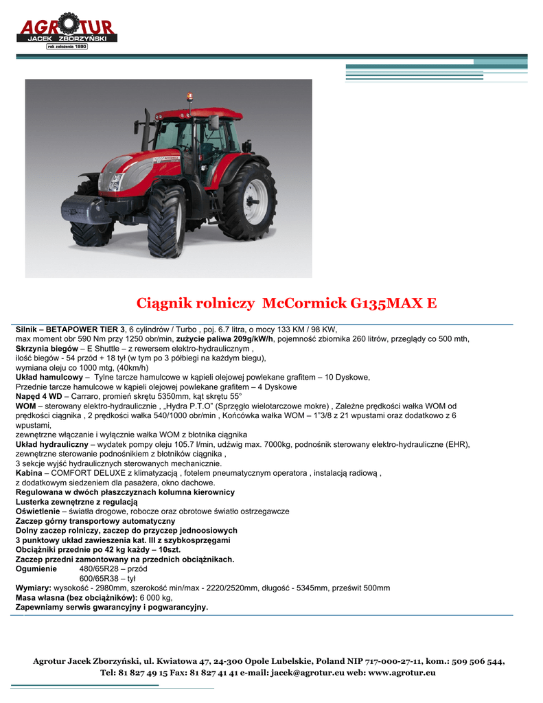 Ciągnik rolniczy McCormick G135MAX E Silnik – BETAPOWER TIER 3, 6 cylindrów / Turbo , poj. 6.7 litra, o mocy 133 KM / 98 KW, max moment obr 590 Nm przy 1250 obr/min, zużycie paliwa 209g/kW/h, pojemność zbiornika 260 litrów, przeglądy co 500 mth, Skrzynia biegów – E Shuttle – z rewersem elektro-hydraulicznym , ilość biegów - 54 przód + 18 tył (w tym po 3 półbiegi na każdym biegu), wymiana oleju co 1000 mtg, (40km/h) Układ hamulcowy – Tylne tarcze hamulcowe w kąpieli olejowej powlekane grafitem – 10 Dyskowe, Przednie tarcze hamulcowe w kąpieli olejowej powlekane grafitem – 4 Dyskowe Napęd 4 WD – Carraro, promień skrętu 5350mm, kąt skrętu 55° WOM – sterowany elektro-hydraulicznie , „Hydra P.T.O” (Sprzęgło wielotarczowe mokre) , Zależne prędkości wałka WOM od prędkości ciągnika , 2 prędkości wałka 540/1000 obr/min , Końcówka wałka WOM – 1”3/8 z 21 wpustami oraz dodatkowo z 6 wpustami, zewnętrzne włączanie i wyłącznie wałka WOM z błotnika ciągnika Układ hydrauliczny – wydatek pompy oleju 105.7 l/min, udźwig max. 7000kg, podnośnik sterowany elektro-hydrauliczne (EHR), zewnętrzne sterowanie podnośnikiem z błotników ciągnika , 3 sekcje wyjść hydraulicznych sterowanych mechanicznie. Kabina – COMFORT DELUXE z klimatyzacją , fotelem pneumatycznym operatora , instalacją radiową , z dodatkowym siedzeniem dla pasażera, okno dachowe. Regulowana w dwóch płaszczyznach kolumna kierownicy Lusterka zewnętrzne z regulacją Oświetlenie – światła drogowe, robocze oraz obrotowe światło ostrzegawcze Zaczep górny transportowy automatyczny Dolny zaczep rolniczy, zaczep do przyczep jednoosiowych 3 punktowy układ zawieszenia kat. III z szybkosprzęgami Obciążniki przednie po 42 kg każdy – 10szt. Zaczep przedni zamontowany na przednich obciążnikach. Ogumienie 480/65R28 – przód 600/65R38 – tył Wymiary: wysokość - 2980mm, szerokość min/max - 2220/2520mm, długość - 5345mm, prześwit 500mm Masa własna (bez obciążników): 6 000 kg, Zapewniamy serwis gwarancyjny i pogwarancyjny. Agrotur Jacek Zborzyński, ul. Kwiatowa 47, 24-300 Opole Lubelskie, Poland NIP 717-000-27-11, kom.: 509 506 544, Tel: 81 827 49 15 Fax: 81 827 41 41 e-mail: [email protected] web: www.agrotur.eu