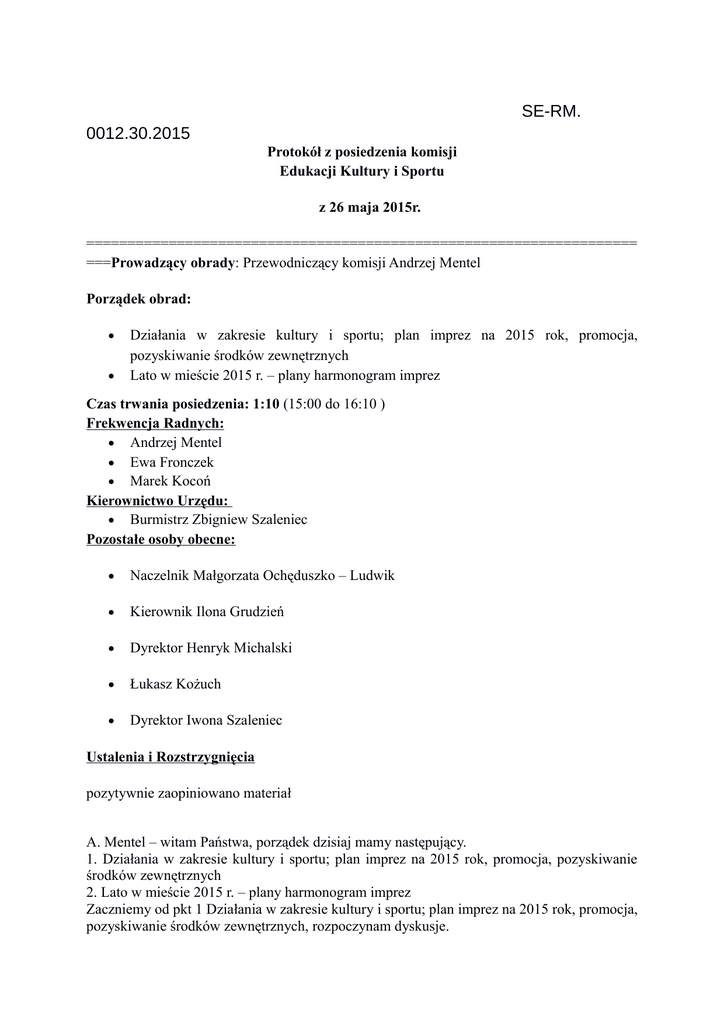 SE-RM. 0012.30.2015 Protokół z posiedzenia komisji Edukacji Kultury i Sportu z 26 maja 2015r. =================================================================== ===Prowadzący obrady: Przewodniczący komisji Andrzej Mentel Porządek obrad: Działania w zakresie kultury i sportu; plan imprez na 2015 rok, promocja, pozyskiwanie środków zewnętrznych Lato w mieście 2015 r. – plany harmonogram imprez Czas trwania posiedzenia: 1:10 (15:00 do 16:10 ) Frekwencja Radnych: Andrzej Mentel Ewa Fronczek Marek Kocoń Kierownictwo Urzędu: Burmistrz Zbigniew Szaleniec Pozostałe osoby obecne: Naczelnik Małgorzata Ochęduszko – Ludwik Kierownik Ilona Grudzień Dyrektor Henryk Michalski Łukasz Kożuch Dyrektor Iwona Szaleniec Ustalenia i Rozstrzygnięcia pozytywnie zaopiniowano materiał A. Mentel – witam Państwa, porządek dzisiaj mamy następujący. 1. Działania w zakresie kultury i sportu; plan imprez na 2015 rok, promocja, pozyskiwanie środków zewnętrznych 2. Lato w mieście 2015 r. – plany harmonogram imprez Zaczniemy od pkt 1 Działania w zakresie kultury i sportu; plan imprez na 2015 rok, promocja, pozyskiwanie środków zewnętrznych, rozpoczynam dyskusje. SE-RM. 0012.30.2015 Moja propozycja jest taka byśmy zaczęli pytać bez wprowadzania, czy mają Państwo Radni pytania. Nie widzę. W takim razie ja zacznę. Chciałem spytać o działalność sportu, mamy przygotowany materiał przez MOSiR sugestie mam taką do Dyrektora, aby rozszerzyć materiał o działania, które są podejmowana odnośnie działalności klubów sportowych, chciałem spytać, z czego wynika ten plan imprez nie mamy w materiale drugiej części roku. Małgorzata Ochęduszko – Ludwik – to, co macie przygotowane ogranicza się tylko do tej części kultury i sportu, czyli to, co zostało zatwierdzone uchwałą rady miejskiej, małe granty i dotacje są jeszcze działania kultury organizowane przez miasto A. Mentel – nam się urywa ten plan na czerwcu, czyli tak jak byśmy nie mieli dalszych planów. Ł. Kożuch – nie wiemy, jakie środki będą dostępne, większość imprez zostało zrobionych w maju i czerwcu. Te imprezy nam się po przesuwały, nie uwzględniono w budżecie w zeszłym roku pikniku samorządowego, trochę się nagromadziło m.in Dni Czeladzi, Ave Maria, wiec, dlatego w ten sposób zrobiliśmy, ale mamy zamiar razem z muzeum współpracować. Ze względu na ilość pracy przy tych produkcjach dopiero będziemy dalej planować w przyszłym tygodniu. A. Mentel - to jak będzie ten plan przygotowany to chciałbym żebyśmy mieli informacje i prosiłbym o tą informacje na kolejną komisje. Kolejne pytanie, czy mamy środki zewnętrzne, które pozyskaliśmy do organizowania imprez? Ł. Kożuch – ze względu na brak czasu nie było to do końca możliwe, ale znaleźliśmy sponsorów do słodyczy, sponsor Wsb, Humanitas wyrazili chęć sponsorowania i pracujemy dalej żeby dla pozostałych imprez było pozyskiwanie sponsorów. A. Mentel, – kiedy będzie działać nowa strona internetowa miasta? Ł. Kożuch - w kwietniu, człowiek, który zajmował się tym poszedł na L4 a potem się zwolnił a ja nie jestem jeszcze przeszkolony, ale wiemy już jak będzie funkcjonować. Będziemy przebudowywać chcemy odseparować bip od strony. A. Mentel, – jakie to są koszty? Ł.Kożuch – około 50 tys. zł A. Mentel – czy planujemy, żeby oprócz jednostek żeby stowarzyszenia tez miały dostęp? Ł. Kożuch – rozeznam temat A. Mentel – bardzo proszę, bo nie, które stowarzyszenia nie maja w ogóle strony. Dziękuje. Jak będą wyglądać Dni Czeladzi? SE-RM. 0012.30.2015 Ł. Kożuch – odbędą się na Grabku w pierwszym dniu i będą rożne zespoły w drugi dzień również Park Grabek i będzie Marta Bijan i inni. W niedziele festyn będzie na prochowni planu teraz nie powiem, bo jeszcze do końca nie wiem, co i jak. A. Mentel - czyli pierwsze 2 dni na Grabku a trzeci na Prochowni. Jaki my mamy pomysł w najbliższym czasie na uporządkowanie działalności kulturalnej, jak to ma to wyglądać? Ł. Kozuch – w Czeladzi powstaje dom kultury prywatny, na razie tajemnica, środki będą pozyskane z Unii. Można dostać duże pieniądze na to. Jest to projekt żeby udostępnić stowarzyszeniom, zespołom muzycznych to są na razie plany jest to w fazie rozwoju. Tutaj musi powstać nowy budynek. A. Mentel – czy ktoś jest już w to wtajemniczony czy wie, że dostanie środki? Małgorzata Ochęduszko – Ludwik – na razie taka informacja, że będzie konkurs. W trzecim kwartale tego roku. A. Mentel – czy macie państwo pytania? M. Kocoń, – kiedy wystartuje ten system SMS info? Ł. Kożuch – trzeba się zapisać już działa, albo na stronce albo poprzez sms są rożne sposoby. A. Mentel – chciałem jeszcze powiedzieć, jeżeli nie mamy jeszcze domu kultury mamy szereg jednostek, które się zajmują kultura miałbym taka sugestie do państwa żeby wydział zajmował się koordynacja działań kulturalnych w mieście. To by nam dużo dało, oferta będzie szersza a nic się nie będzie powielać. Ł. Kożuch – ja myślę, że jest to do zrobienia. A. Mentel – dziękuję zamykamy temat pierwszy. Zaczynamy drugi temat lato w mieście proszę o dyskusje. Ja mam prośbę, jeżeli chodzi o lato i imprezy dla dzieciaków żeby przygotować w miarę wcześnie harmonogram imprez, który będzie na plakatach i żeby był wcześniej wywieszony w szkołach. Dyrektor Henryk Michalski – już przygotowujemy, więc będzie. M. Kocoń – program został starannie przygotowany żeby tylko został zrealizowany A. Mentel – czy my jak są imprezy w odeonie to partycypujemy w kosztach? Małgorzata Ochęduszko – Ludwik – nie. A. Mentel - współpraca zagraniczna mam pytanie czy planujemy w przyszłym roku wymianę z Ukrainą albo Serbia? SE-RM. 0012.30.2015 Ł. Kożuch - z Serbia nie mamy podpisanej umowy, blisko 40 lat współpracujemy z AUBY, chcemy na Dni Czeladzi zaprosić a