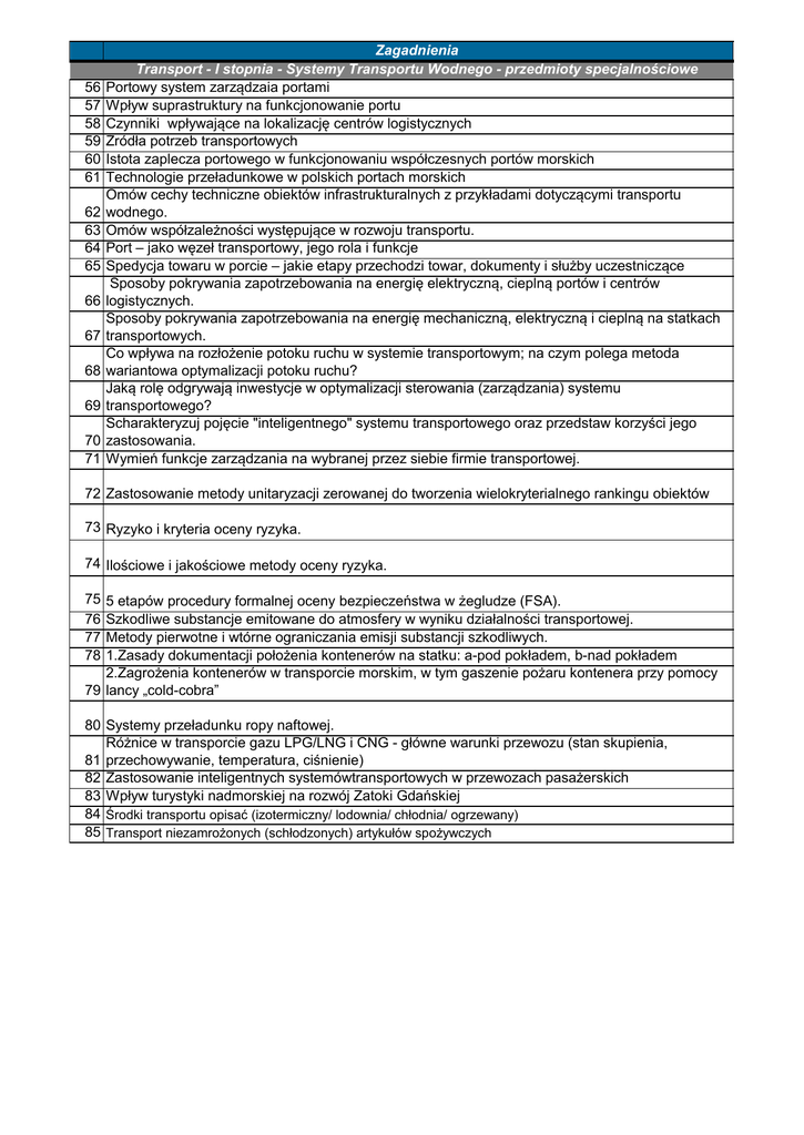 56 57 58 59 60 61 62 63 64 65 66 67 68 69 70 71 Zagadnienia Transport - I stopnia - Systemy Transportu Wodnego - przedmioty specjalnościowe Portowy system zarządzaia portami Wpływ suprastruktury na funkcjonowanie portu Czynniki wpływające na lokalizację centrów logistycznych Źródła potrzeb transportowych Istota zaplecza portowego w funkcjonowaniu współczesnych portów morskich Technologie przeładunkowe w polskich portach morskich Omów cechy techniczne obiektów infrastrukturalnych z przykładami dotyczącymi transportu wodnego. Omów współzależności występujące w rozwoju transportu. Port – jako węzeł transportowy, jego rola i funkcje Spedycja towaru w porcie – jakie etapy przechodzi towar, dokumenty i służby uczestniczące Sposoby pokrywania zapotrzebowania na energię elektryczną, cieplną portów i centrów logistycznych. Sposoby pokrywania zapotrzebowania na energię mechaniczną, elektryczną i cieplną na statkach transportowych. Co wpływa na rozłożenie potoku ruchu w systemie transportowym; na czym polega metoda wariantowa optymalizacji potoku ruchu? Jaką rolę odgrywają inwestycje w optymalizacji sterowania (zarządzania) systemu transportowego? Scharakteryzuj pojęcie "inteligentnego" systemu transportowego oraz przedstaw korzyści jego zastosowania. Wymień funkcje zarządzania na wybranej przez siebie firmie transportowej. 72 Zastosowanie metody unitaryzacji zerowanej do tworzenia wielokryterialnego rankingu obiektów 73 Ryzyko i kryteria oceny ryzyka. 74 Ilościowe i jakościowe metody oceny ryzyka. 5 etapów procedury formalnej oceny bezpieczeństwa w żegludze (FSA). Szkodliwe substancje emitowane do atmosfery w wyniku działalności transportowej. Metody pierwotne i wtórne ograniczania emisji substancji szkodliwych. 1.Zasady dokumentacji położenia kontenerów na statku: a-pod pokładem, b-nad pokładem 2.Zagrożenia kontenerów w transporcie morskim, w tym gaszenie pożaru kontenera przy pomocy 79 lancy „cold-cobra” 75 76 77 78 80 Systemy przeładunku ropy naftowej. Różnice w transporcie gazu LPG/LNG i CNG - główne warunki przewozu (stan skupienia, 81 przechowywanie, temperatura, ciśnienie) 82 Zastosowanie inteligentnych systemówtransportowych w przewozach pasażerskich 83 Wpływ turystyki nadmorskiej na rozwój Zatoki Gdańskiej 84 Środki transportu opisać (izotermiczny/ lodownia/ chłodnia/ ogrzewany) 85 Transport niezamrożonych (schłodzonych) artykułów spożywczych