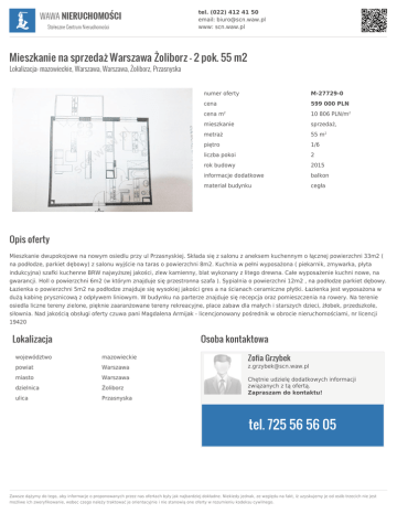 tel. (022) 412 41 50 email: [email protected] www: scn.waw.pl Mieszkanie na sprzedaż Warszawa Żoliborz - 2 pok. 55 m2 Lokalizacja: mazowieckie, Warszawa, Warszawa, Żoliborz, Przasnyska numer oferty M-27729-0 cena 599 000 PLN cena m 10 806 PLN/m2 mieszkanie sprzedaż, metraż 55 m2 piętro 1/6 liczba pokoi 2 rok budowy 2015 informacje dodatkowe balkon materiał budynku cegła 2 Opis oferty Mieszkanie dwupokojowe na nowym osiedlu przy ul Przasnyskiej. Składa się z salonu z aneksem kuchennym o łącznej powierzchni 33m2 ( na podłodze, parkiet dębowy) z salonu wyjście na taras o powierzchni 8m2. Kuchnia w pełni wyposażona ( piekarnik, zmywarka, płyta indukcyjna) szafki kuchenne BRW najwyższej jakości, zlew kamienny, blat wykonany z litego drewna. Całe wyposażenie kuchni nowe, na gwarancji. Holl o powierzchni 6m2 (w którym znajduje się przestronna szafa ). Sypialnia o powierzchni 12m2 , na podłodze parkiet dębowy. Łazienka o powierzchni 5m2 na podłodze znajduje się wysokiej jakości gres a na ścianach ceramiczne płytki. Łazienka jest wyposażona w dużą kabinę prysznicową z odpływem liniowym. W budynku na parterze znajduje się recepcja oraz pomieszczenia na rowery. Na terenie osiedla liczne tereny zielone, pięknie zaaranżowane tereny rekreacyjne, place zabaw dla małych i starszych dzieci, żłobek, przedszkole, siłownia. Nad jakością obsługi oferty czuwa pani Magdalena Armijak - licencjonowany pośrednik w obrocie nieruchomościami, nr licencji 19420 Lokalizacja Osoba kontaktowa Zofia Grzybek województwo mazowieckie powiat Warszawa [email protected] miasto Warszawa dzielnica Żoliborz ulica Przasnyska Chętnie udzielę dodatkowych informacji związanych z tą ofertą. Zapraszam do kontaktu! tel. 725 56 56 05 Zawsze dążymy do tego, aby informacje o proponowanych przez nas ofertach były jak najbardziej dokładne. Niekiedy jednak, ze względu na fakt, iż uzyskujemy je od osób trzecich nie jest możliwe ich zweryfikowanie, wobec czego należy traktować je orientacyjnie i nie stanowią one oferty w rozumieniu kodeksu cywilnego.