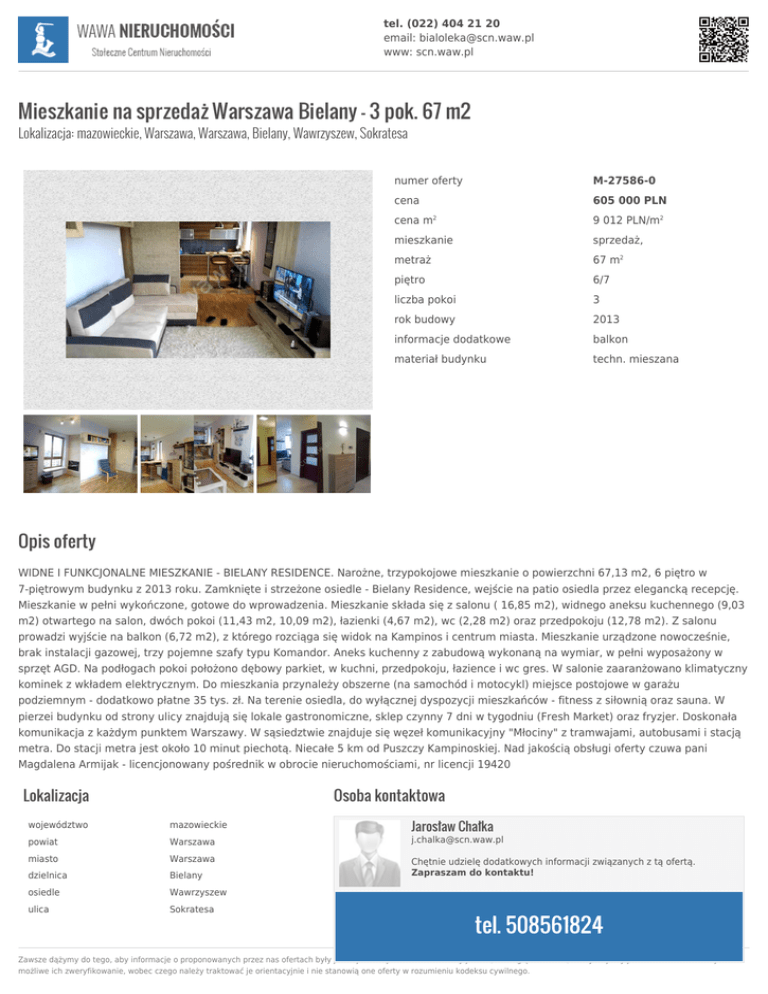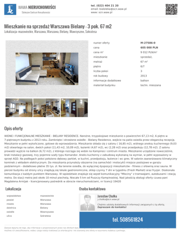 tel. (022) 404 21 20 email: [email protected] www: scn.waw.pl Mieszkanie na sprzedaż Warszawa Bielany - 3 pok. 67 m2 Lokalizacja: mazowieckie, Warszawa, Warszawa, Bielany, Wawrzyszew, Sokratesa numer oferty M-27586-0 cena 605 000 PLN cena m 9 012 PLN/m2 mieszkanie sprzedaż, metraż 67 m2 piętro 6/7 liczba pokoi 3 rok budowy 2013 informacje dodatkowe balkon materiał budynku techn. mieszana 2 Opis oferty WIDNE I FUNKCJONALNE MIESZKANIE - BIELANY RESIDENCE. Narożne, trzypokojowe mieszkanie o powierzchni 67,13 m2, 6 piętro w 7-piętrowym budynku z 2013 roku. Zamknięte i strzeżone osiedle - Bielany Residence, wejście na patio osiedla przez elegancką recepcję. Mieszkanie w pełni wykończone, gotowe do wprowadzenia. Mieszkanie składa się z salonu ( 16,85 m2), widnego aneksu kuchennego (9,03 m2) otwartego na salon, dwóch pokoi (11,43 m2, 10,09 m2), łazienki (4,67 m2), wc (2,28 m2) oraz przedpokoju (12,78 m2). Z salonu prowadzi wyjście na balkon (6,72 m2), z którego rozciąga się widok na Kampinos i centrum miasta. Mieszkanie urządzone nowocześnie, brak instalacji gazowej, trzy pojemne szafy typu Komandor. Aneks kuchenny z zabudową wykonaną na wymiar, w pełni wyposażony w sprzęt AGD. Na podłogach pokoi położono dębowy parkiet, w kuchni, przedpokoju, łazience i wc gres. W salonie zaaranżowano klimatyczny kominek z wkładem elektrycznym. Do mieszkania przynależy obszerne (na samochód i motocykl) miejsce postojowe w garażu podziemnym - dodatkowo płatne 35 tys. zł. Na terenie osiedla, do wyłącznej dyspozycji mieszkańców - fitness z siłownią oraz sauna. W pierzei budynku od strony ulicy znajdują się lokale gastronomiczne, sklep czynny 7 dni w tygodniu (Fresh Market) oraz fryzjer. Doskonała komunikacja z każdym punktem Warszawy. W sąsiedztwie znajduje się węzeł komunikacyjny "Młociny" z tramwajami, autobusami i stacją metra. Do stacji metra jest około 10 minut piechotą. Niecałe 5 km od Puszczy Kampinoskiej. Nad jakością obsługi oferty czuwa pani Magdalena Armijak - licencjonowany pośrednik w obrocie nieruchomościami, nr licencji 19420 Lokalizacja Osoba kontaktowa Jarosław Chałka województwo mazowieckie powiat Warszawa [email protected] miasto Warszawa dzielnica Bielany Chętnie udzielę dodatkowych informacji związanych z tą ofertą. Zapraszam do kontaktu! osiedle Wawrzyszew ulica Sokratesa tel. 508561824 Zawsze dążymy do tego, aby informacje o proponowanych przez nas ofertach były jak najbardziej dokładne. Niekiedy jednak, ze względu na fakt, iż uzyskujemy je od osób trzecich nie jest możliwe ich zweryfikowanie, wobec czego należy traktować je orientacyjnie i nie stanowią one oferty w rozumieniu kodeksu cywilnego.