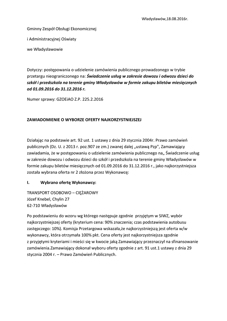 Władysławów,18.08.2016r. Gminny Zespół Obsługi Ekonomicznej i Administracyjnej Oświaty we Władysławowie Dotyczy: postępowania o udzielenie zamówienia publicznego prowadzonego w trybie przetargu nieograniczonego na: Świadczenie usług w zakresie dowozu i odwozu dzieci do szkół i przedszkola na terenie gminy Władysławów w formie zakupu biletów miesięcznych od 01.09.2016 do 31.12.2016 r. Numer sprawy: GZOEiAO Z.P. 225.2.2016 ZAWIADOMIENIE O WYBORZE OFERTY NAJKORZYSTNIEJSZEJ Działając na podstawie art. 92 ust. 1 ustawy z dnia 29 stycznia 2004r. Prawo zamówieo publicznych (Dz. U. z 2013 r. poz.907 ze zm.) zwanej dalej „ustawą Pzp", Zamawiający zawiadamia, że w postępowaniu o udzielenie zamówienia publicznego na„ Świadczenie usług w zakresie dowozu i odwozu dzieci do szkół i przedszkola na terenie gminy Władysławów w formie zakupu biletów miesięcznych od 01.09.2016 do 31.12.2016 r., jako najkorzystniejsza została wybrana oferta nr 2 złożona przez Wykonawcę: I. Wybrano ofertę Wykonawcy: TRANSPORT OSOBOWO – CIĘŻAROWY Józef Knebel, Chylin 27 62-710 Władysławów Po podstawieniu do wzoru wg którego następuje zgodnie przyjętym w SIWZ, wybór najkorzystniejszej oferty (kryterium cena: 90% znaczenia; czas podstawienia autobusu zastępczego: 10%). Komisja Przetargowa wskazała,że najkorzystniejszą jest oferta w/w wykonawcy, która otrzymała 100% pkt. Cena oferty jest najkorzystniejsza zgodnie z przyjętymi kryteriami i mieści się w kwocie jaką Zamawiający przeznaczył na sfinansowanie zamówienia.Zamawiający dokonał wyboru oferty zgodnie z art. 91 ust.1 ustawy z dnia 29 stycznia 2004 r. – Prawo Zamówieo Publicznych. II. Oferty złożyli: Streszczenie oceny i porównania złożonych ofert Nr oferty Nazwa , siedziba i adres 1.Przedsiębiorstwo Komunikacji Samochodowej w Koninie S.A, 62-510 Konin, ul. Zakładowa 4 2. TRANSPORT OSOBOWO – CIĘŻAROWY Józef Knebel, Chylin 27 62-710 Władysławów 3.TRANSPORT OSOBOWY Jacek Krysiak, ul Kolska Szosa 14/16 62-700 Turek Liczba pkt w kryteriach Cena – 90 % znaczenia Czas podstawienia autobusu zastępczego – 10% Cena - 68,24 pkt Czas podst. – 5pkt Cena – 90 pkt Czas podst. – 10 pkt ________ Razem 73,24 100 __________ Alicja Olek p.o dyrektora GZOEiAO