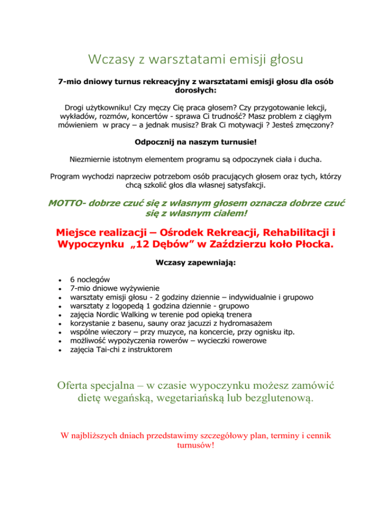 Wczasy z warsztatami emisji głosu 7-mio dniowy turnus rekreacyjny z warsztatami emisji głosu dla osób dorosłych: Drogi użytkowniku! Czy męczy Cię praca głosem? Czy przygotowanie lekcji, wykładów, rozmów, koncertów - sprawa Ci trudność? Masz problem z ciągłym mówieniem w pracy – a jednak musisz? Brak Ci motywacji ? Jesteś zmęczony? Odpocznij na naszym turnusie! Niezmiernie istotnym elementem programu są odpoczynek ciała i ducha. Program wychodzi naprzeciw potrzebom osób pracujących głosem oraz tych, którzy chcą szkolić głos dla własnej satysfakcji. MOTTO- dobrze czuć się z własnym głosem oznacza dobrze czuć się z własnym ciałem! Miejsce realizacji – Ośrodek Rekreacji, Rehabilitacji i Wypoczynku „12 Dębów” w Zaździerzu koło Płocka. Wczasy zapewniają: 6 noclegów 7-mio dniowe wyżywienie warsztaty emisji głosu - 2 godziny dziennie – indywidualnie i grupowo warsztaty z logopedą 1 godzina dziennie - grupowo zajęcia Nordic Walking w terenie pod opieką trenera korzystanie z basenu, sauny oraz jacuzzi z hydromasażem wspólne wieczory – przy muzyce, na koncercie, przy ognisku itp. możliwość wypożyczenia rowerów – wycieczki rowerowe zajęcia Tai-chi z instruktorem Oferta specjalna – w czasie wypoczynku możesz zamówić dietę wegańską, wegetariańską lub bezglutenową. W najbliższych dniach przedstawimy szczegółowy plan, terminy i cennik turnusów!