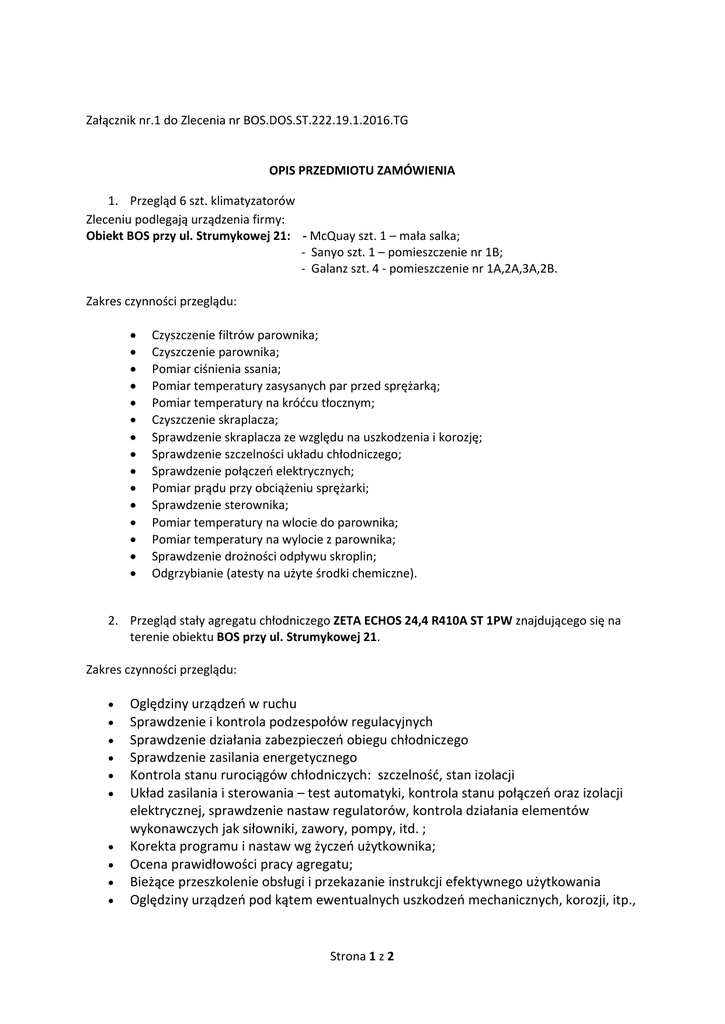 Załącznik nr.1 do Zlecenia nr BOS.DOS.ST.222.19.1.2016.TG OPIS PRZEDMIOTU ZAMÓWIENIA 1. Przegląd 6 szt. klimatyzatorów Zleceniu podlegają urządzenia firmy: Obiekt BOS przy ul. Strumykowej 21: - McQuay szt. 1 – mała salka; - Sanyo szt. 1 – pomieszczenie nr 1B; - Galanz szt. 4 - pomieszczenie nr 1A,2A,3A,2B. Zakres czynności przeglądu: • • • • • • • • • • • • • • • Czyszczenie filtrów parownika; Czyszczenie parownika; Pomiar ciśnienia ssania; Pomiar temperatury zasysanych par przed sprężarką; Pomiar temperatury na króćcu tłocznym; Czyszczenie skraplacza; Sprawdzenie skraplacza ze względu na uszkodzenia i korozję; Sprawdzenie szczelności układu chłodniczego; Sprawdzenie połączeń elektrycznych; Pomiar prądu przy obciążeniu sprężarki; Sprawdzenie sterownika; Pomiar temperatury na wlocie do parownika; Pomiar temperatury na wylocie z parownika; Sprawdzenie drożności odpływu skroplin; Odgrzybianie (atesty na użyte środki chemiczne). 2. Przegląd stały agregatu chłodniczego ZETA ECHOS 24,4 R410A ST 1PW znajdującego się na terenie obiektu BOS przy ul. Strumykowej 21. Zakres czynności przeglądu: • • • • • • • • • • Oględziny urządzeń w ruchu Sprawdzenie i kontrola podzespołów regulacyjnych Sprawdzenie działania zabezpieczeń obiegu chłodniczego Sprawdzenie zasilania energetycznego Kontrola stanu rurociągów chłodniczych: szczelność, stan izolacji Układ zasilania i sterowania – test automatyki, kontrola stanu połączeń oraz izolacji elektrycznej, sprawdzenie nastaw regulatorów, kontrola działania elementów wykonawczych jak siłowniki, zawory, pompy, itd. ; Korekta programu i nastaw wg życzeń użytkownika; Ocena prawidłowości pracy agregatu; Bieżące przeszkolenie obsługi i przekazanie instrukcji efektywnego użytkowania Oględziny urządzeń pod kątem ewentualnych uszkodzeń mechanicznych, korozji, itp., Strona 1 z 2 Obsługa skraplacza powietrznego: • • Sprawdzenie czystości, ewentualne czyszczenie, Kontrola wentylatorów, pomp, pomiar prądów, ocena głośności, oględziny pod kątem ewentualnych uszkodzeń mechanicznych, korozji itp. Obsługa instalacji chłodniczej: • • • • • • • • Sprawdzenie sprężarki, pomiar prądu pracy, ocena głośności, Kontrola parametrów obiegu chłodniczego, pomiary ciśnień po stronie ssawnej i tłocznej, Sprawdzenie ilości czynnika chłodniczego w układzie, Pomiar i ewentualna regulacja stopnia przegrzania, Sprawdzenie działania elementów układu chłodniczego (zawory elektromagnetyczne, zawór rozprężny, elementy sterujące), Sprawdzenie ciśnieniowych elementów zabezpieczających, ewentualna regulacja, Oględziny układu chłodniczego pod kątem ewentualnych wycieków oleju, Kontrola wentylatorów, pomp, pomiar prądów, ocena głośności, oględziny pod kątem ewentualnych uszkodzeń mechanicznych, korozji itp. Po wykonanym przeglądzie wykonawca sporządzi protokół, który będzie opisywał stan konkretnego urządzenia (m.in. stan izolacji, ślady korozji lub stwierdzenie nieszczelności instalacji). Każdy z kontrolowanych punktów zostanie przez Wykonawcę opisany i oceniony pod kątem bezpieczeństwa działania, prawidłowości działania, konieczności naprawy, konieczności wymiany, szacunkowych kosztów naprawy/wymiany. Strona 2 z 2
