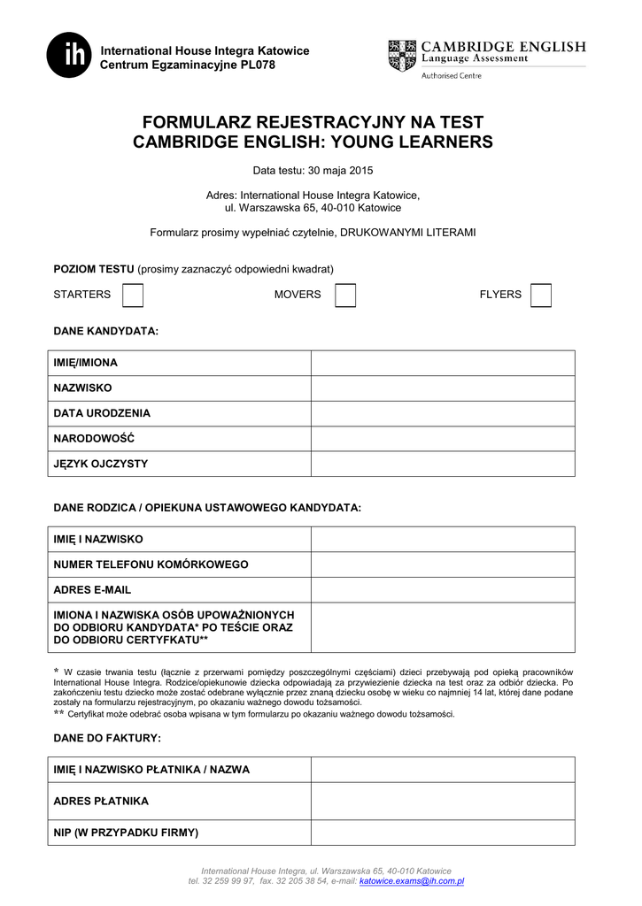 International House Integra Katowice Centrum Egzaminacyjne PL078 FORMULARZ REJESTRACYJNY NA TEST CAMBRIDGE ENGLISH: YOUNG LEARNERS Data testu: 30 maja 2015 Adres: International House Integra Katowice, ul. Warszawska 65, 40-010 Katowice Formularz prosimy wypełniać czytelnie, DRUKOWANYMI LITERAMI POZIOM TESTU (prosimy zaznaczyć odpowiedni kwadrat) STARTERS MOVERS FLYERS DANE KANDYDATA: IMIĘ/IMIONA NAZWISKO DATA URODZENIA NARODOWOŚĆ JĘZYK OJCZYSTY DANE RODZICA / OPIEKUNA USTAWOWEGO KANDYDATA: IMIĘ I NAZWISKO NUMER TELEFONU KOMÓRKOWEGO ADRES E-MAIL IMIONA I NAZWISKA OSÓB UPOWAŻNIONYCH DO ODBIORU KANDYDATA* PO TEŚCIE ORAZ DO ODBIORU CERTYFKATU** * W czasie trwania testu (łącznie z przerwami pomiędzy poszczególnymi częściami) dzieci przebywają pod opieką pracowników International House Integra. Rodzice/opiekunowie dziecka odpowiadają za przywiezienie dziecka na test oraz za odbiór dziecka. Po zakończeniu testu dziecko może zostać odebrane wyłącznie przez znaną dziecku osobę w wieku co najmniej 14 lat, której dane podane zostały na formularzu rejestracyjnym, po okazaniu ważnego dowodu tożsamości. ** Certyfikat może odebrać osoba wpisana w tym formularzu po okazaniu ważnego dowodu tożsamości. DANE DO FAKTURY: IMIĘ I NAZWISKO PŁATNIKA / NAZWA ADRES PŁATNIKA NIP (W PRZYPADKU FIRMY) International House Integra, ul. Warszawska 65, 40-010 Katowice tel. 32 259 99 97, fax. 32 205 38 54, e-mail: [email protected] International House Integra Katowice Centrum Egzaminacyjne PL078 OŚWIADCZENIE RODZICA / OPIEKUNA USTAWOWEGO KANDYDATA Niniejszym oświadczam, iż zapoznałam/zapoznałem się z Regulaminem testów Cambridge English: Young Learners w Centrum Egzaminacyjnym International House Integra Katowice i godzę się na wymienione w nim warunki. Oświadczam jednocześnie, iż zawarte w niniejszym formularzu dane osobowe są zgodne ze stanem faktycznym. Podaję je dobrowolnie i przyjmuję do wiadomości, że mam prawo dostępu do ich treści oraz prawo do ich poprawiania. Zgodnie z ustawą o ochronie danych osobowych z dnia 29 sierpnia 1997 podpisując niniejsze oświadczenie wyrażam zgodę na gromadzenie oraz przetwarzanie przekazanych danych osobowych zarówno teraz jak i w przyszłości – przez International House Integra Katowice do celów: - związanych z administracją testów Cambridge English: Young Learners, w tym do przekazywania tych danych do Cambridge English Language Assessment. Wyrażam zgodę na otrzymywanie od International House Integra Katowice oraz Cambridge English Language Assessment informacji związanych z testami Cambridge English: Young Learners drogą elektroniczną oraz telefonicznie. - marketingowych związanych z działalnością International House Integra Katowice. Wyrażam zgodę na otrzymywanie od International House Integra Katowice informacji marketingowych oraz handlowych dotyczących usług i produktów drogą elektroniczną, telefoniczną bądź listownie. Zgodnie z przepisami dotyczącymi ochrony danych osobowych obowiązującymi na terenie Polski oraz Wielkiej Brytanii, International House Integra Katowice jest zobowiązane do przetwarzania danych osobowych w sposób zapewniający ich poufność i bezpieczeństwo oraz wyłącznie w oznaczonych celach. Administratorem danych osobowych są: Na terenie Polski Na terenie Wielkiej Brytanii International House Integra sp. z o.o. ul. Warszawska 65, 40-010 Katowice Polska Cambridge English Language Assessment 1 Hills Road, Cambridge 2CB1 2EU, United Kingdom ........................................................... czytelny podpis rodzica/opiekuna prawnego ..................................................... miejscowość i data International House Integra, ul. Warszawska 65, 40-010 Katowice tel. 32 259 99 97, fax. 32 205 38 54, e-mail: [email protected]